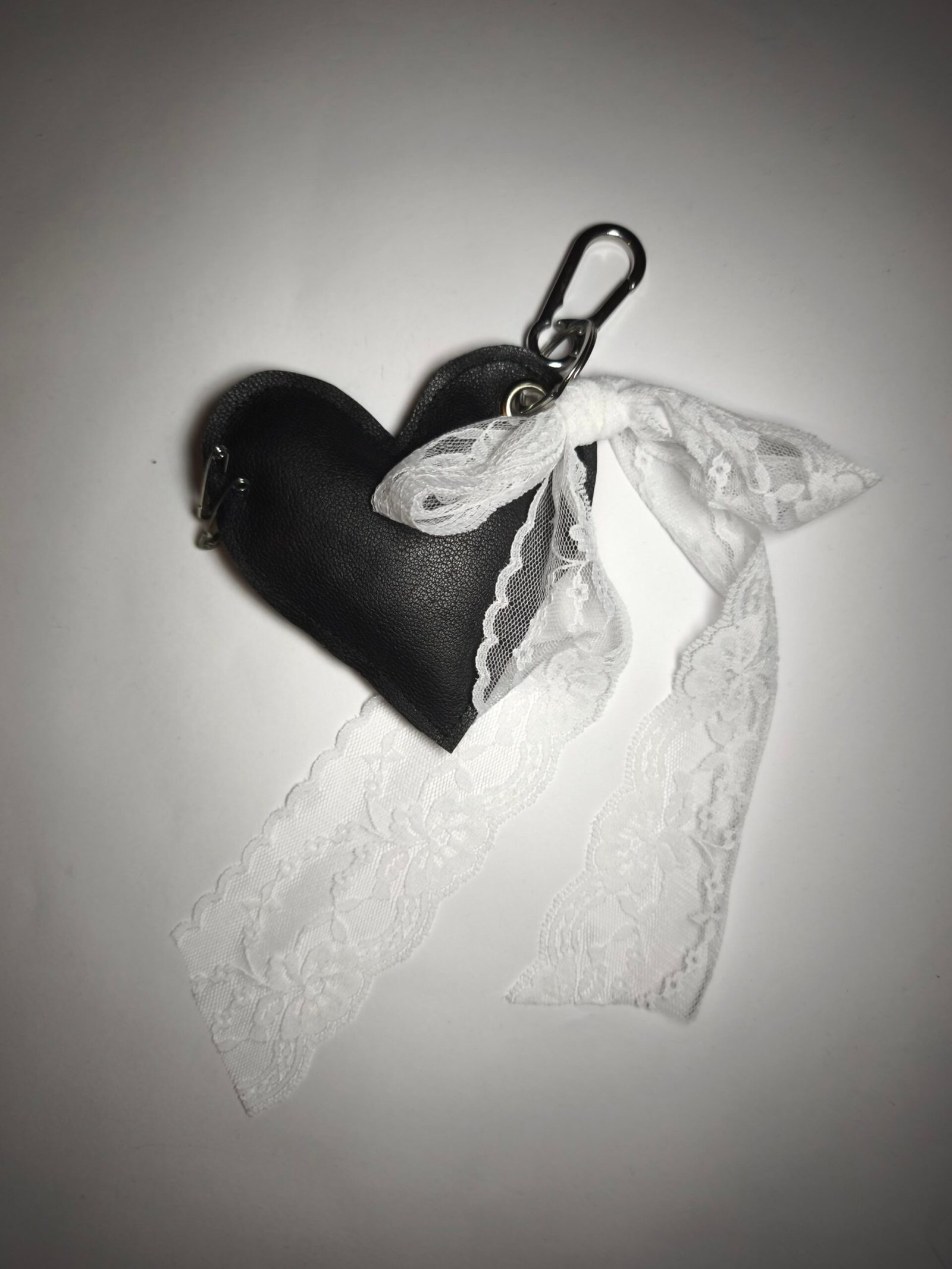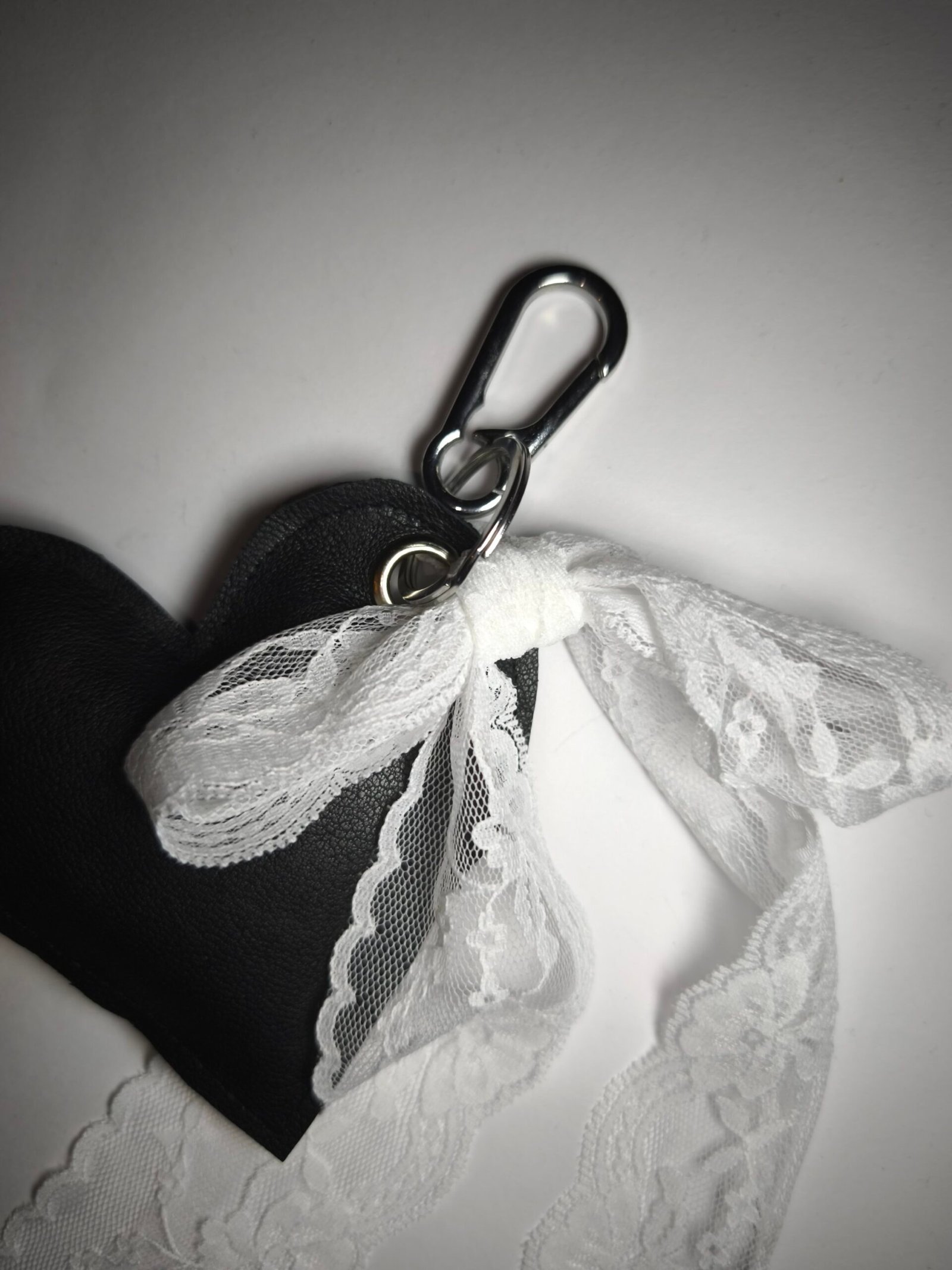 Charm en forme de coeur en cuir noir avec dentelle blanche.