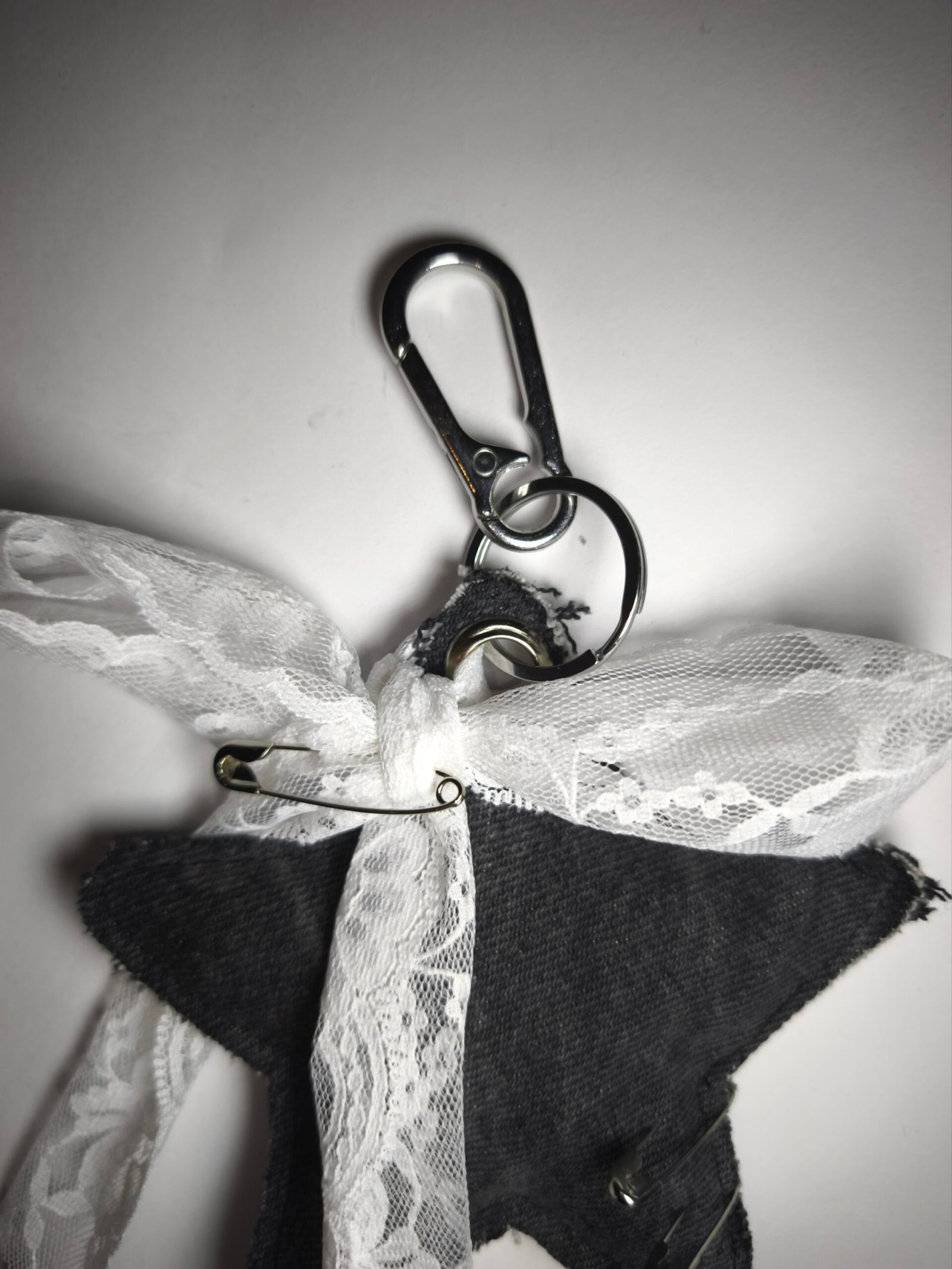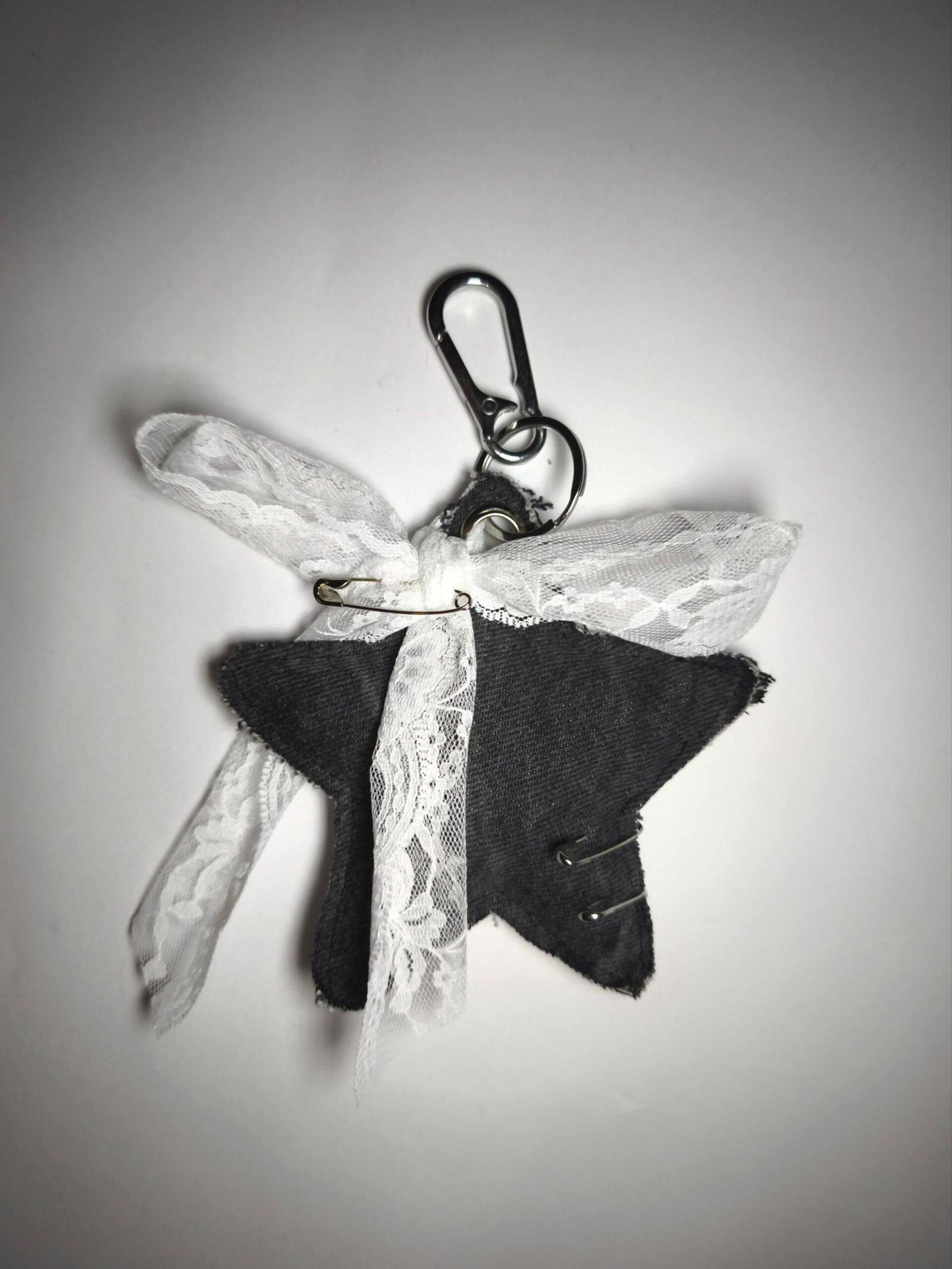 Charm en forme d’étoile en jean gris foncé avec noeud en dentelle blanche et épingle à nourrice