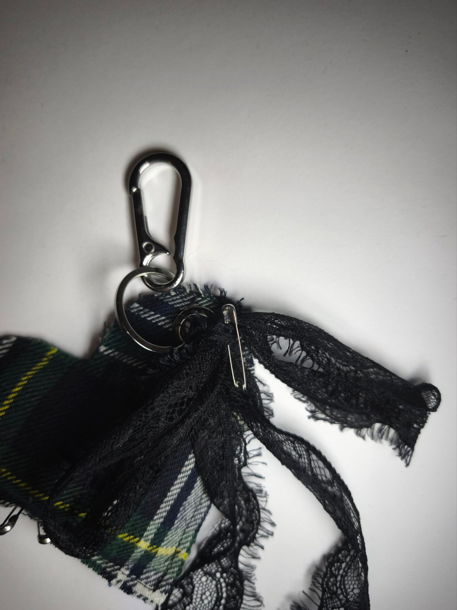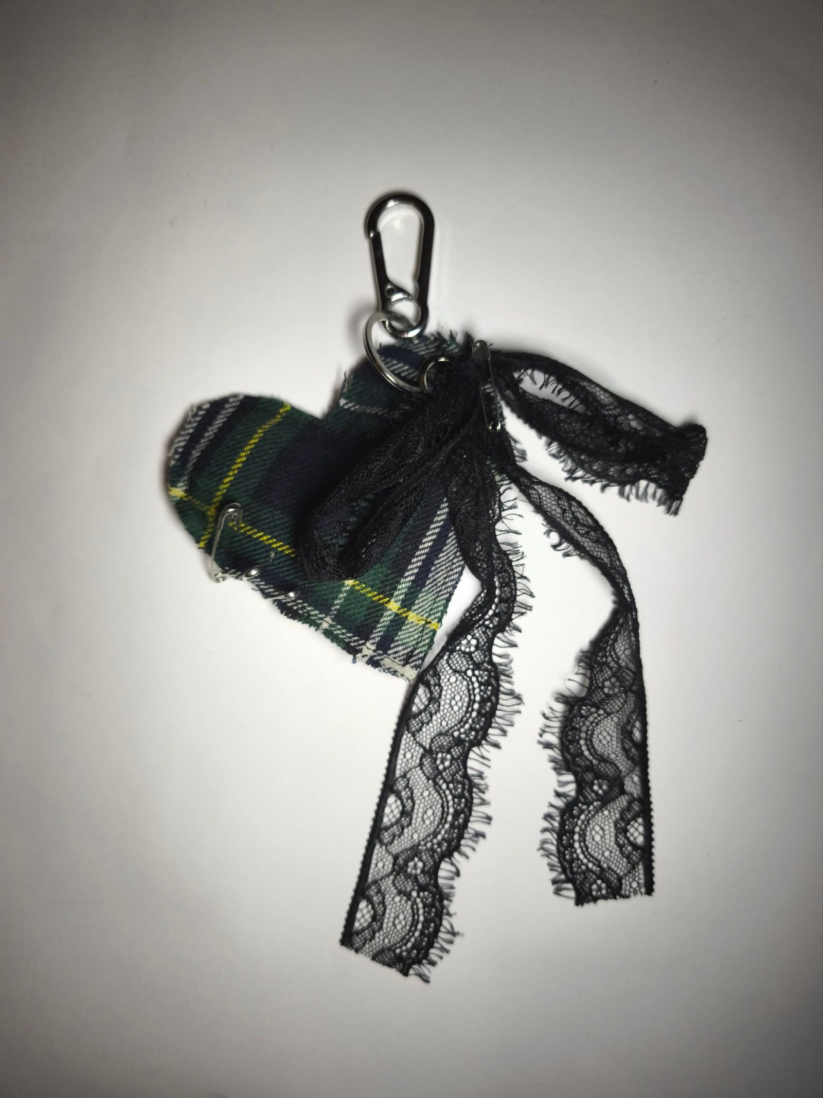 Charme en forme de coeur en tartan vert avec noeud en dentelle noire