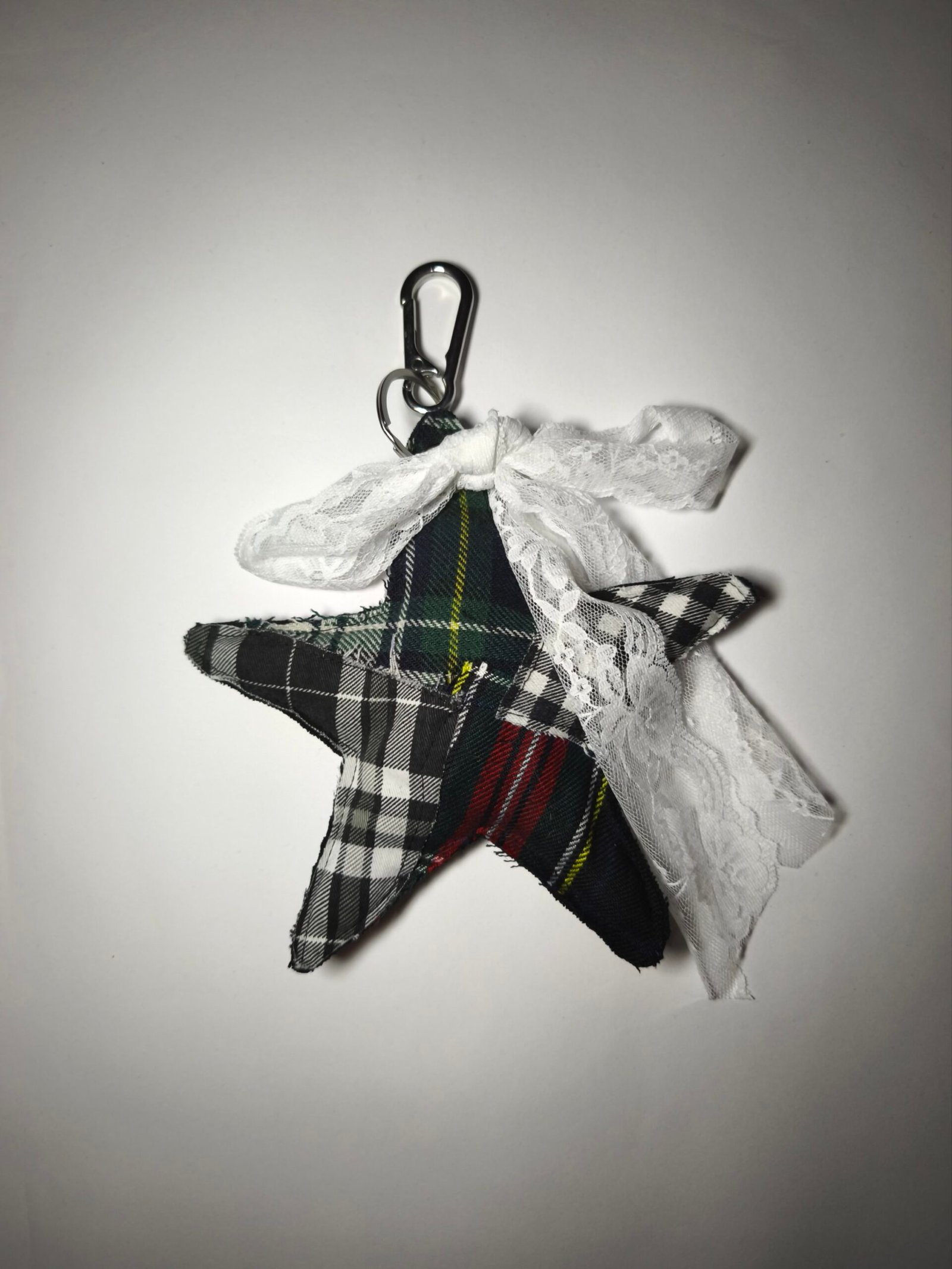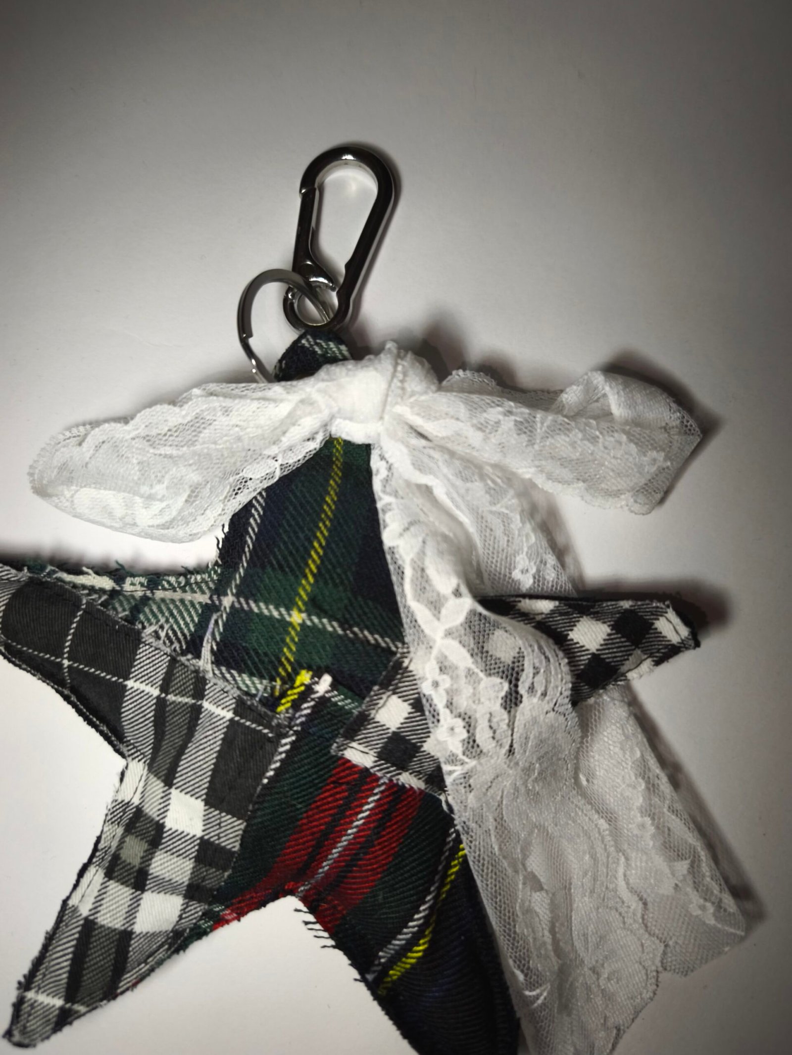 Charm en forme d’étoile en patchwork de tartan et noeud en dentelle blanche