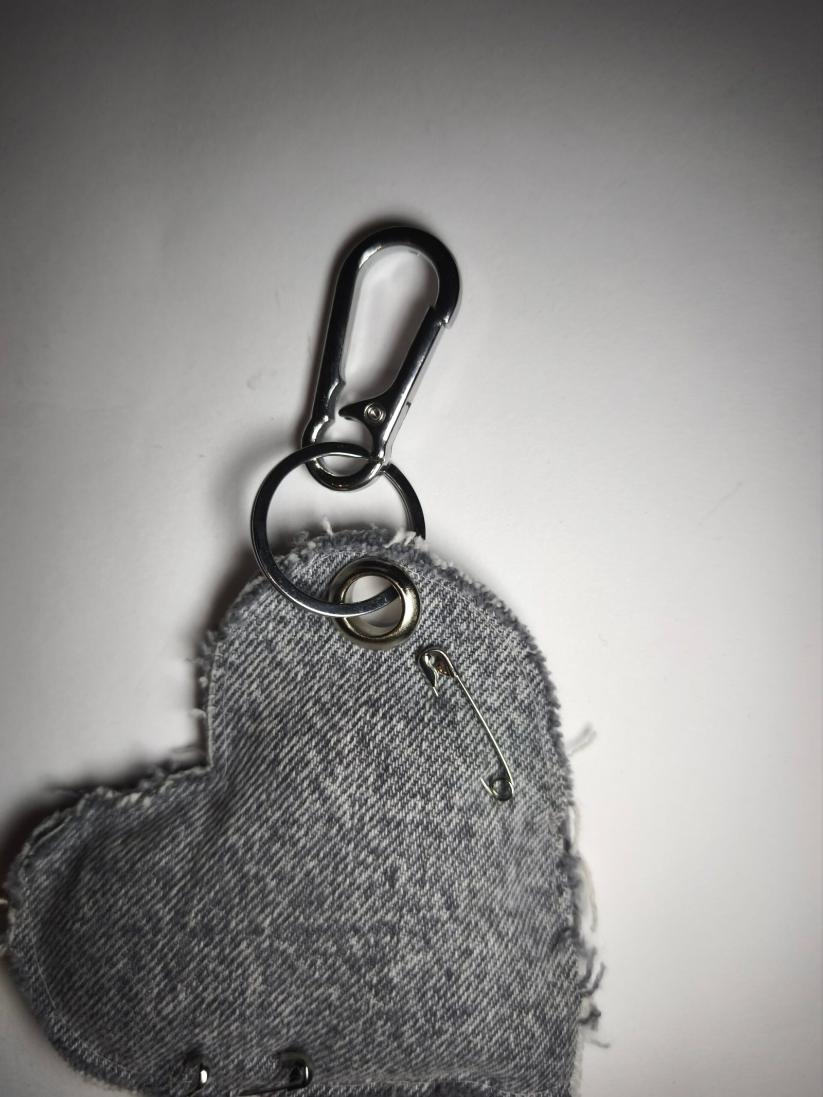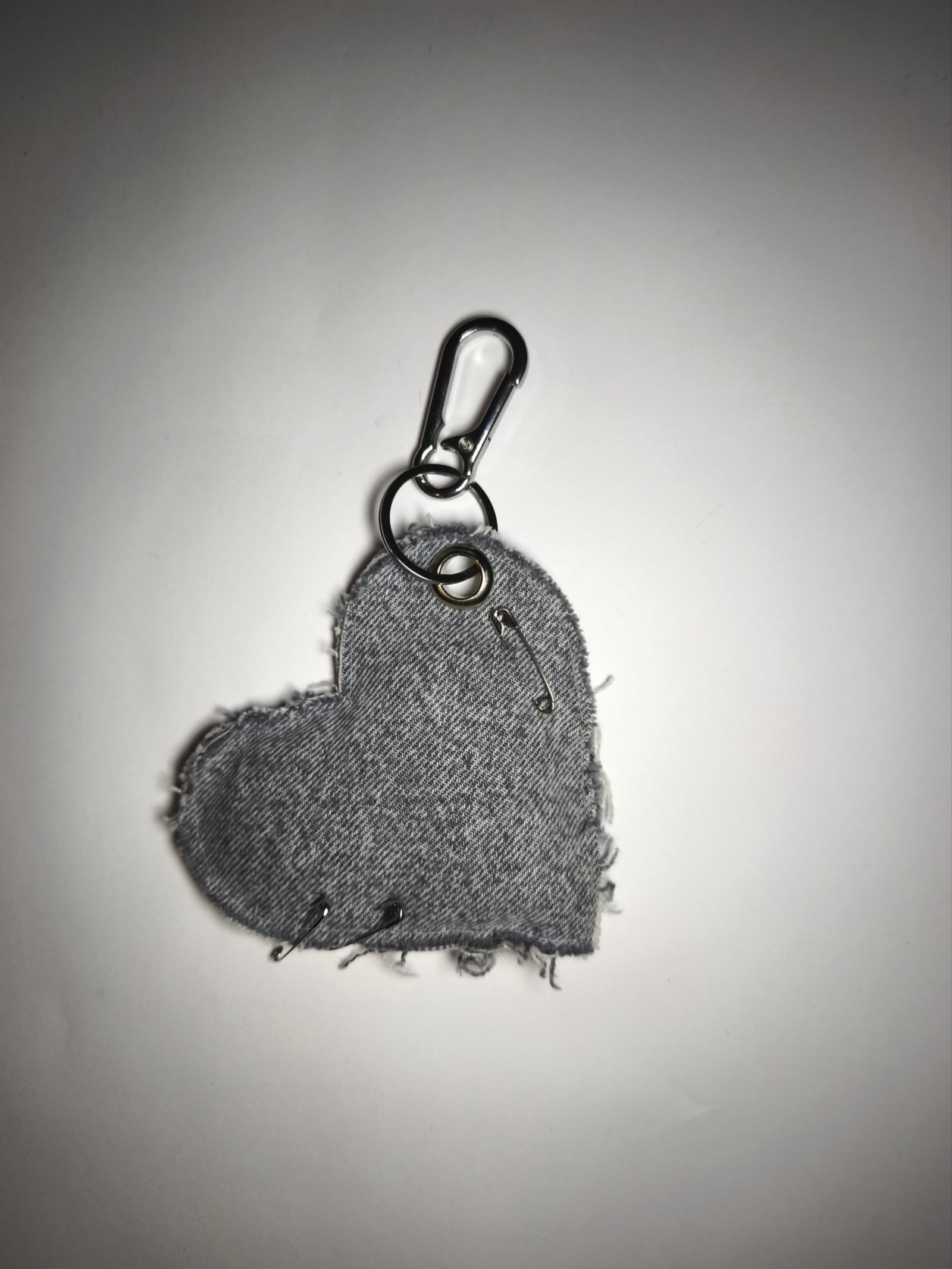 Charme en forme de coeur en jean gris chiné avec épingle à nourrice