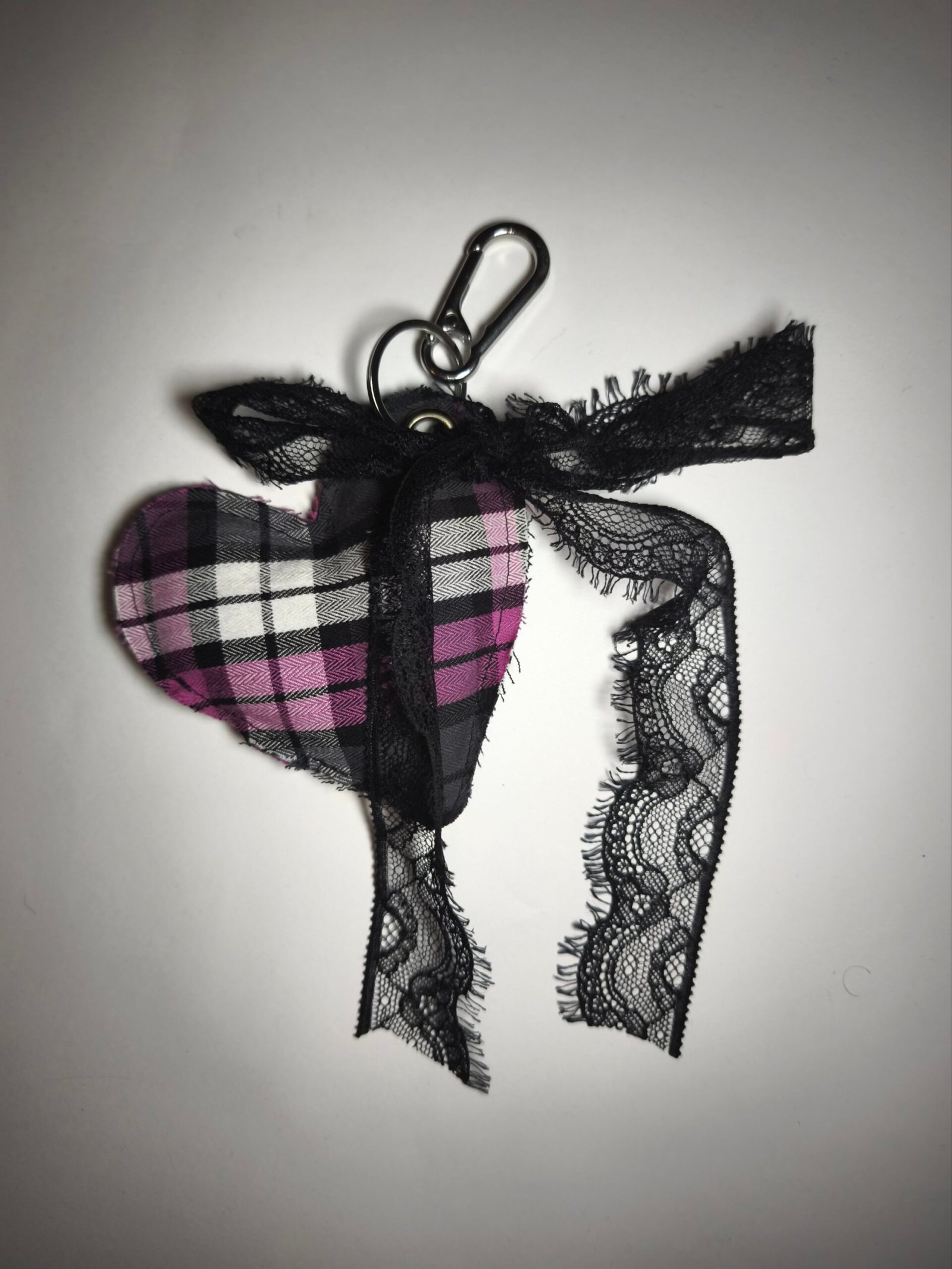 Charme en forme de coeur en tartan rose avec noeud en dentelle noire