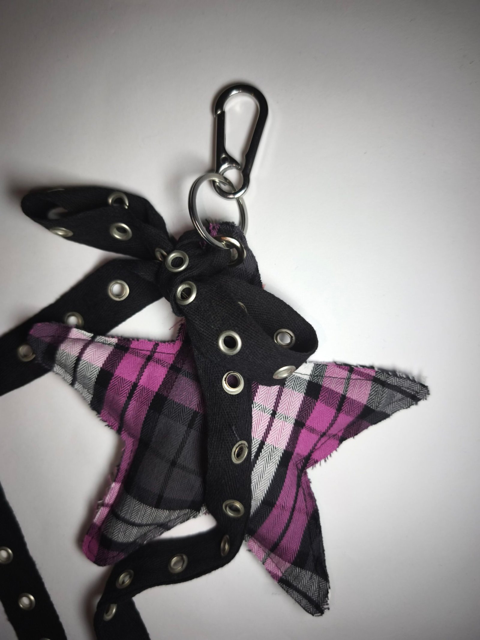 Charme en forme d’étoile en tartan rose avec noeud en oeillets noir