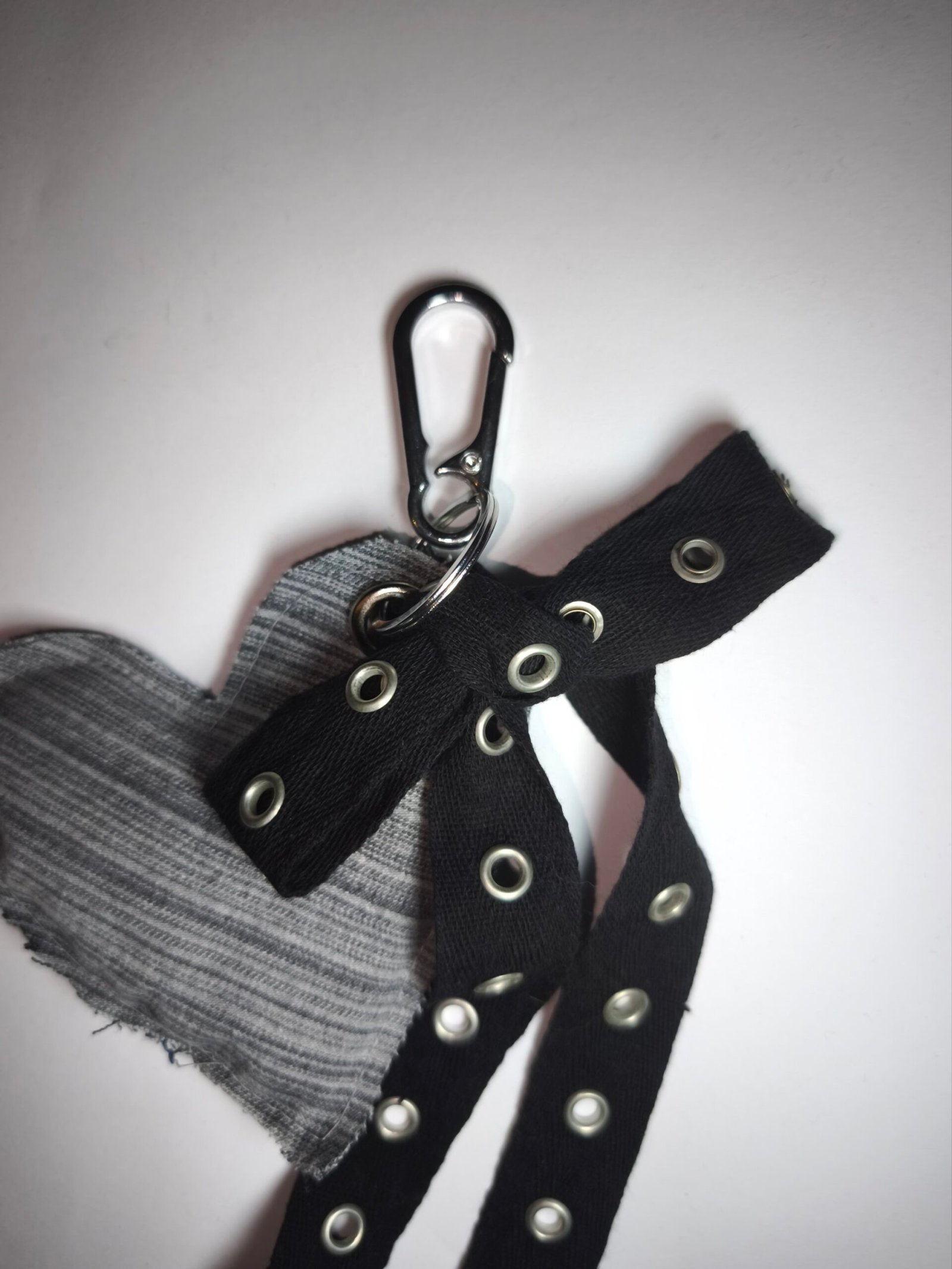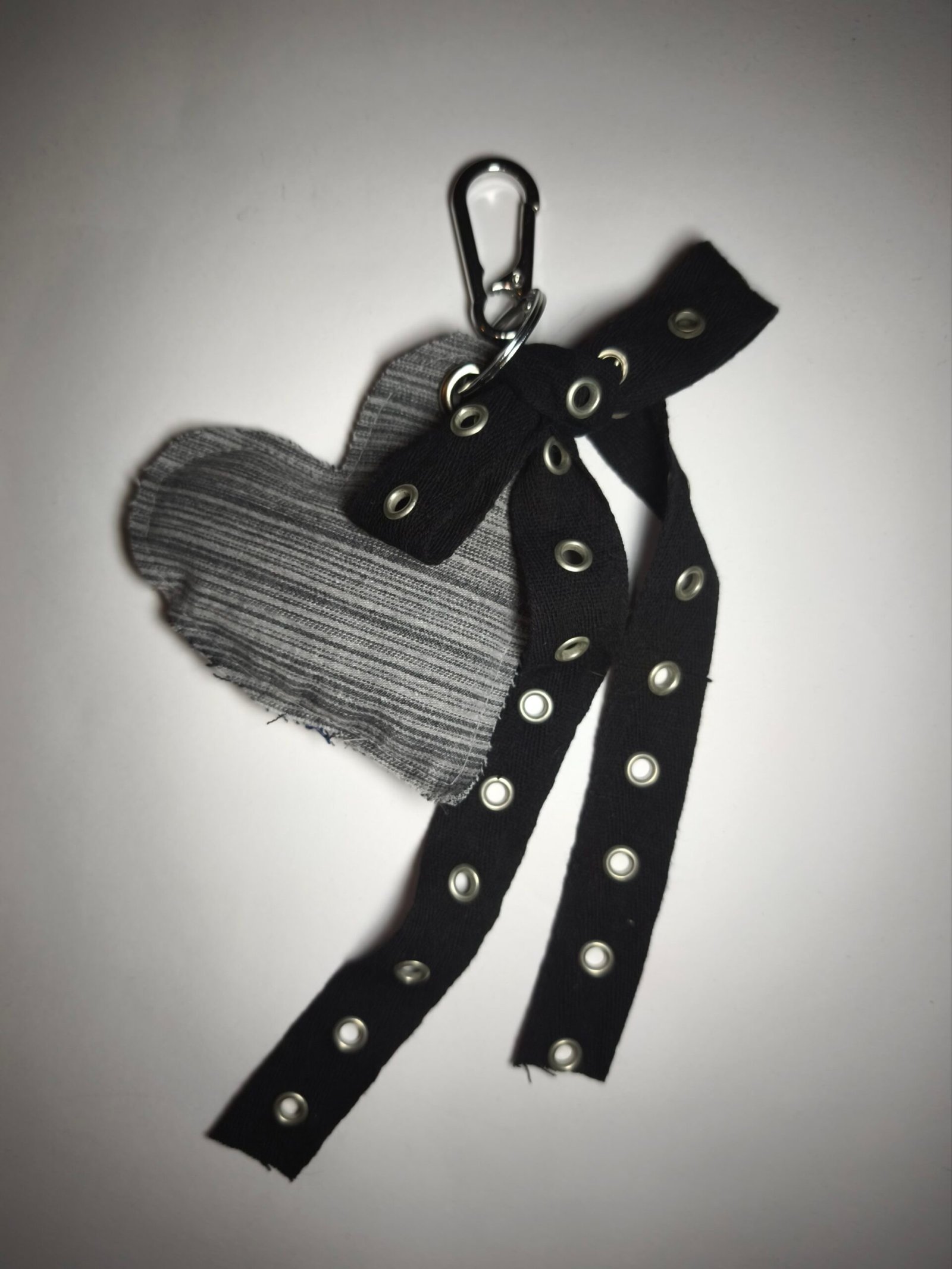 Charme en forme de coeur en jean rayé gris avec noeud en oeillets noir