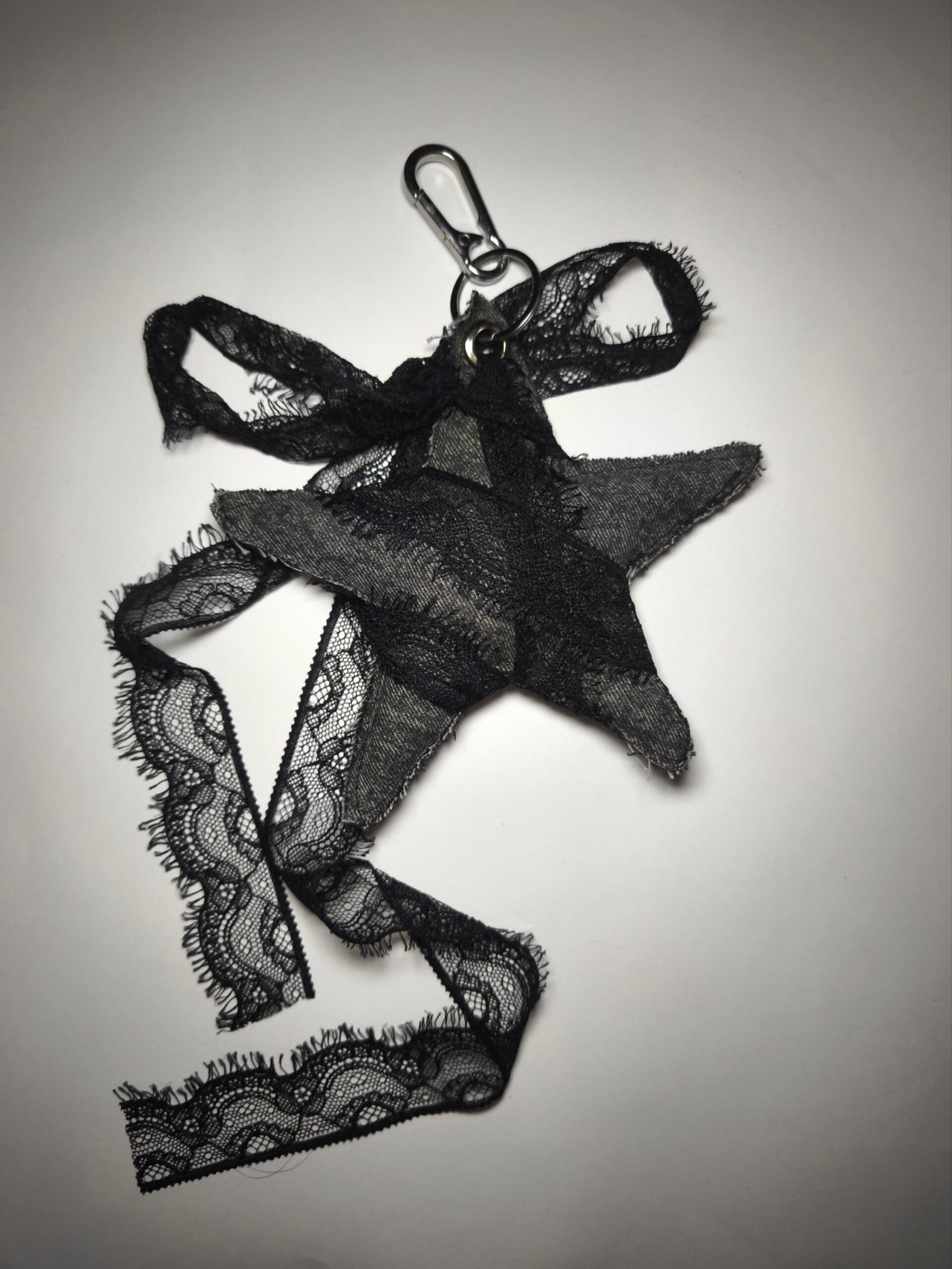 Charm en forme d’étoile en jean gris avec dentelle noir et noeud en dentelle