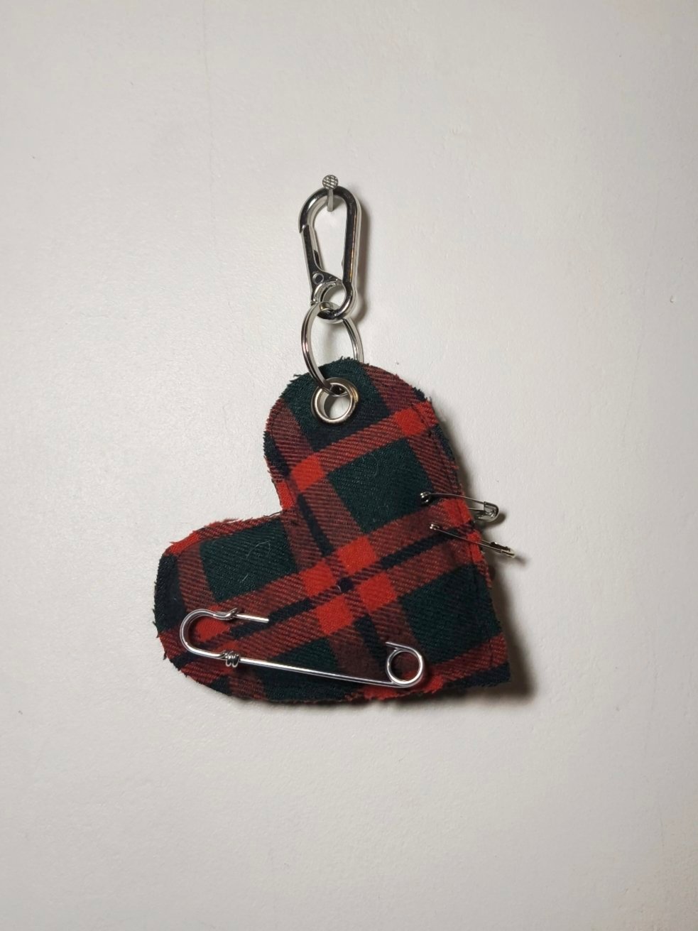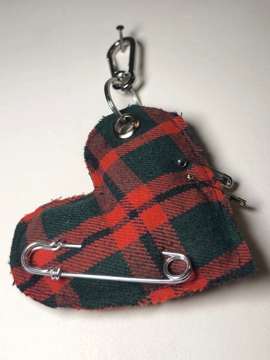 Cœur en tartan rouge avec plusieurs épingles à nourrice