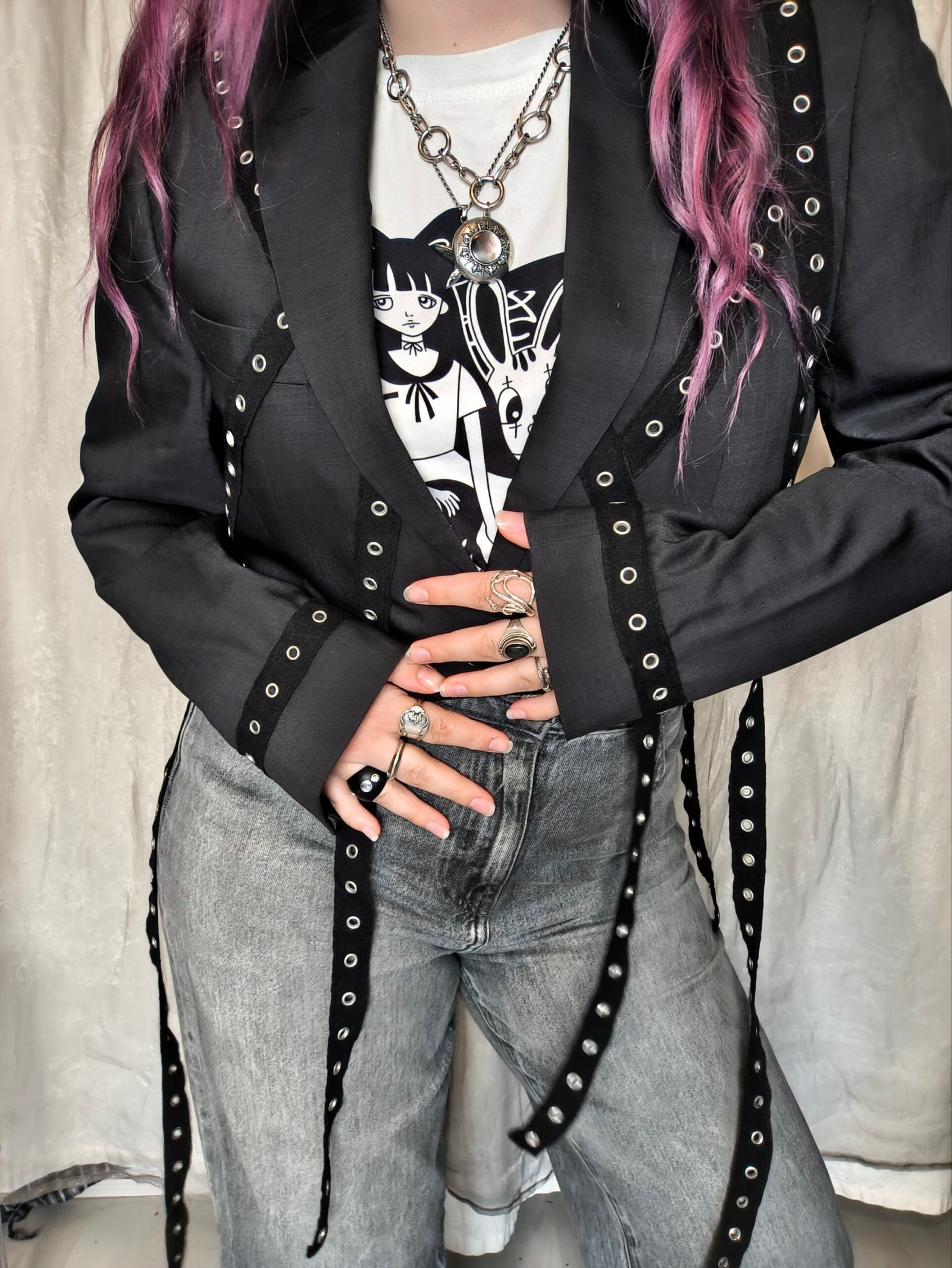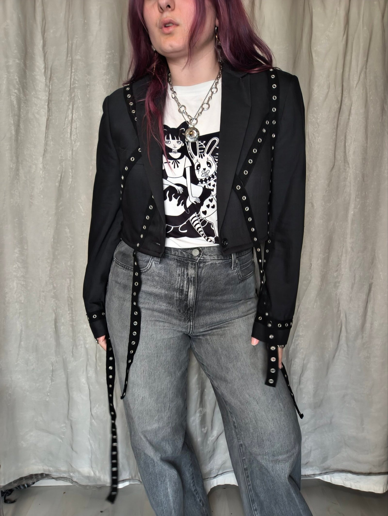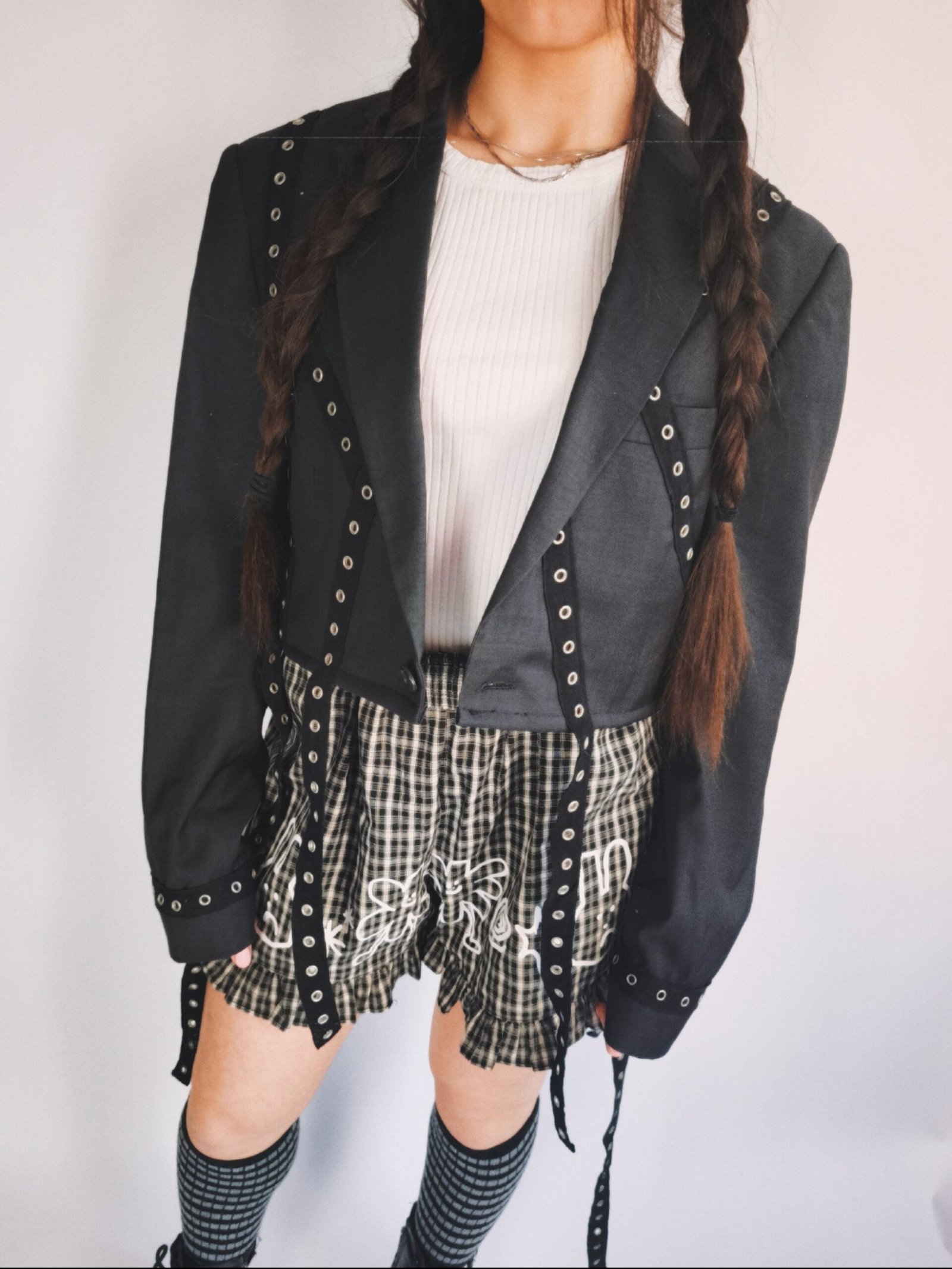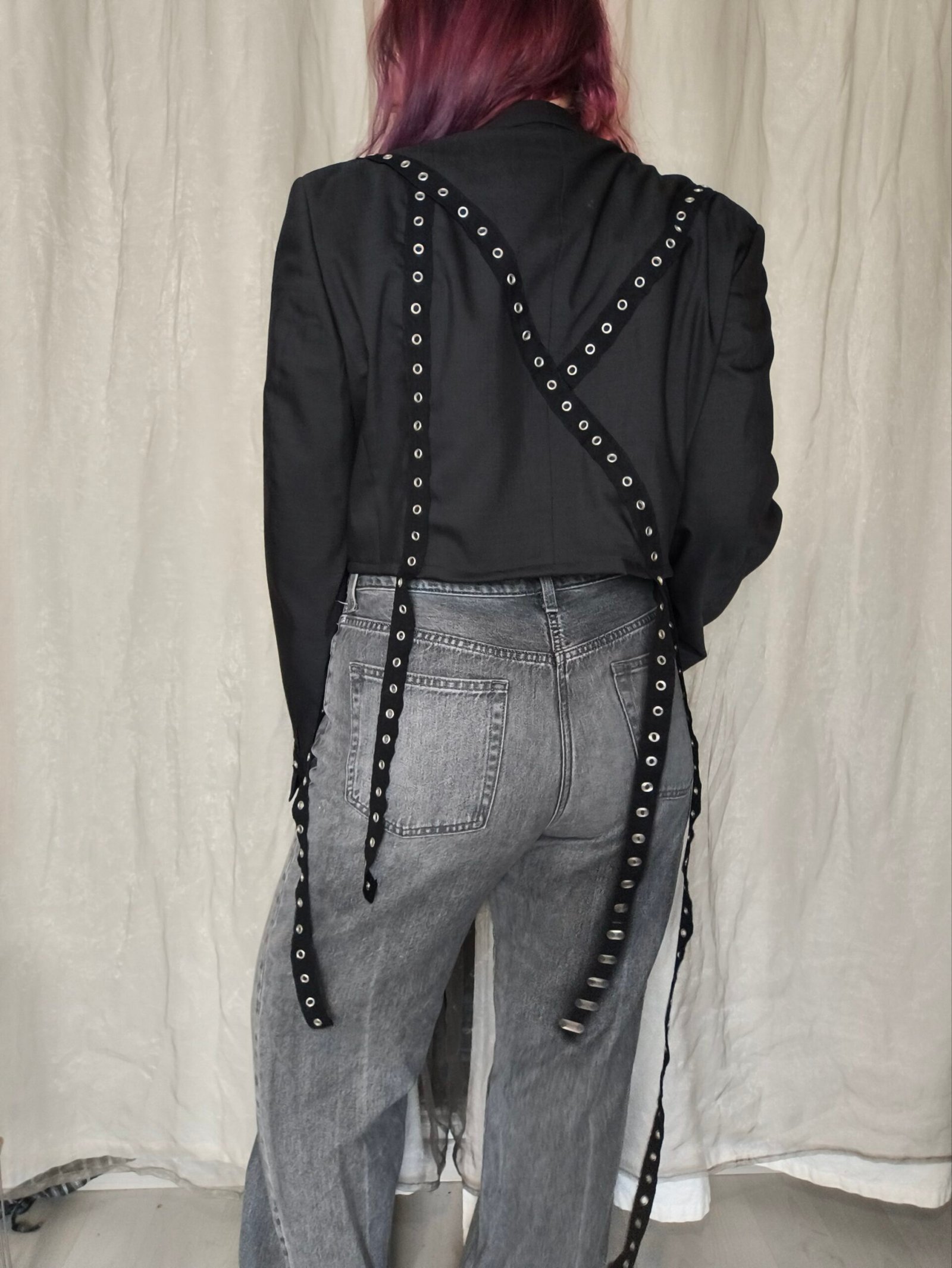 Veste blazer courte grise foncé avec bandes noires d’oeillets