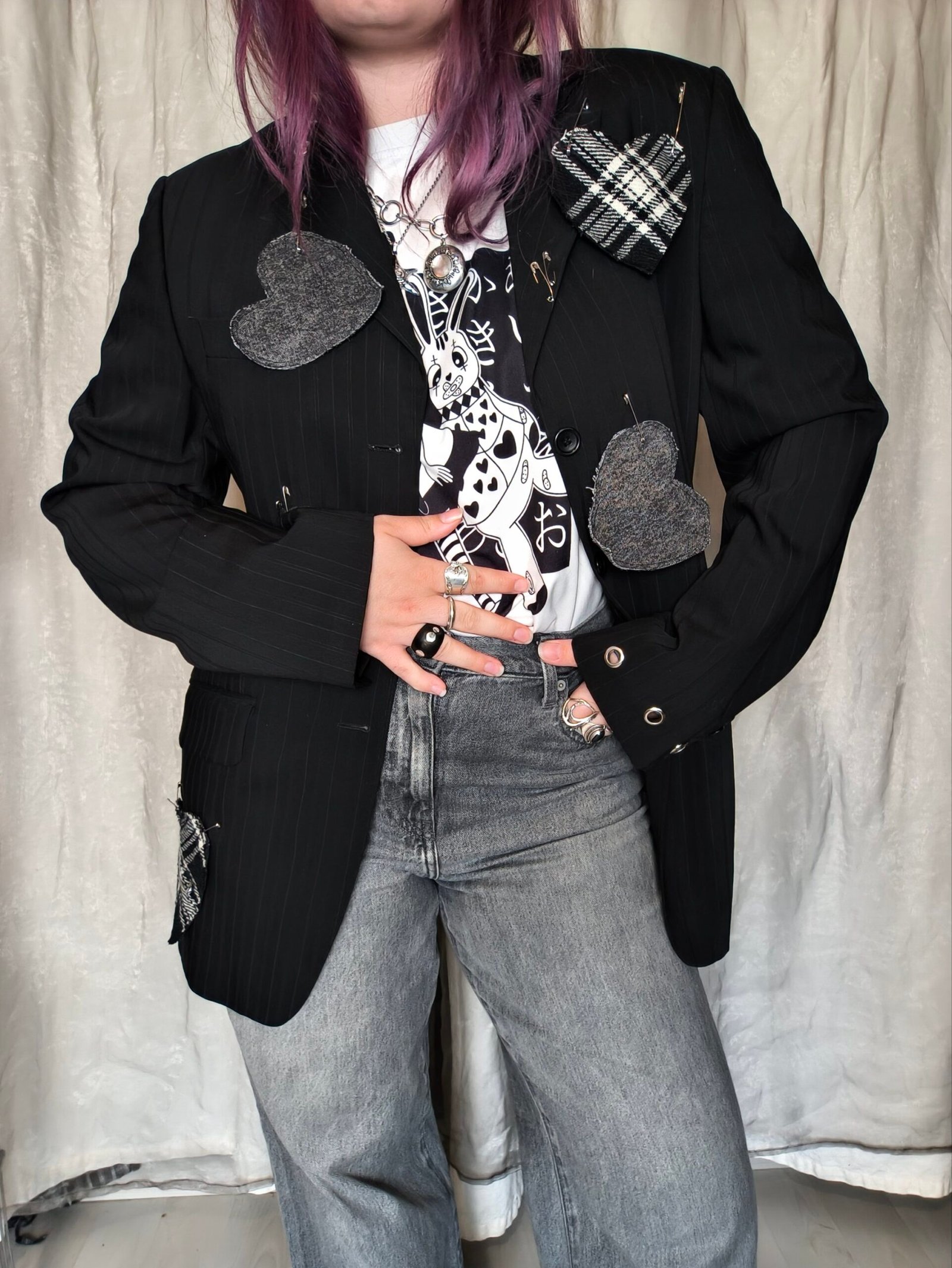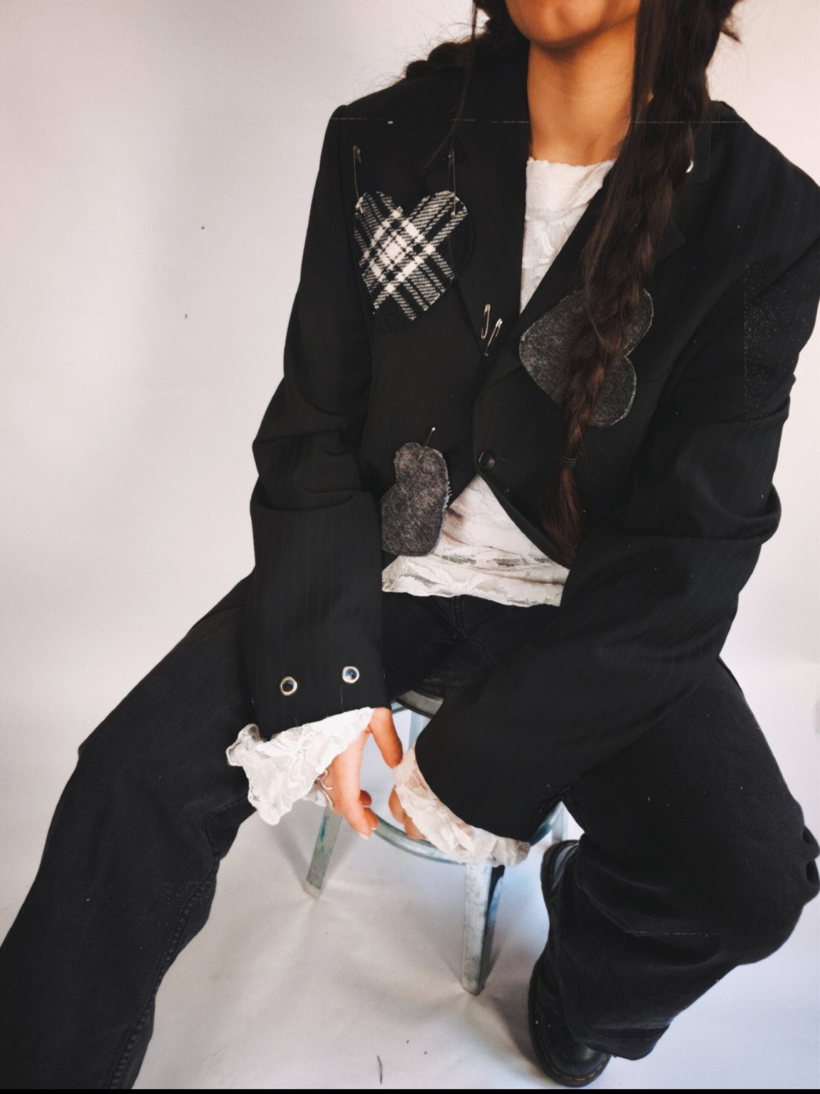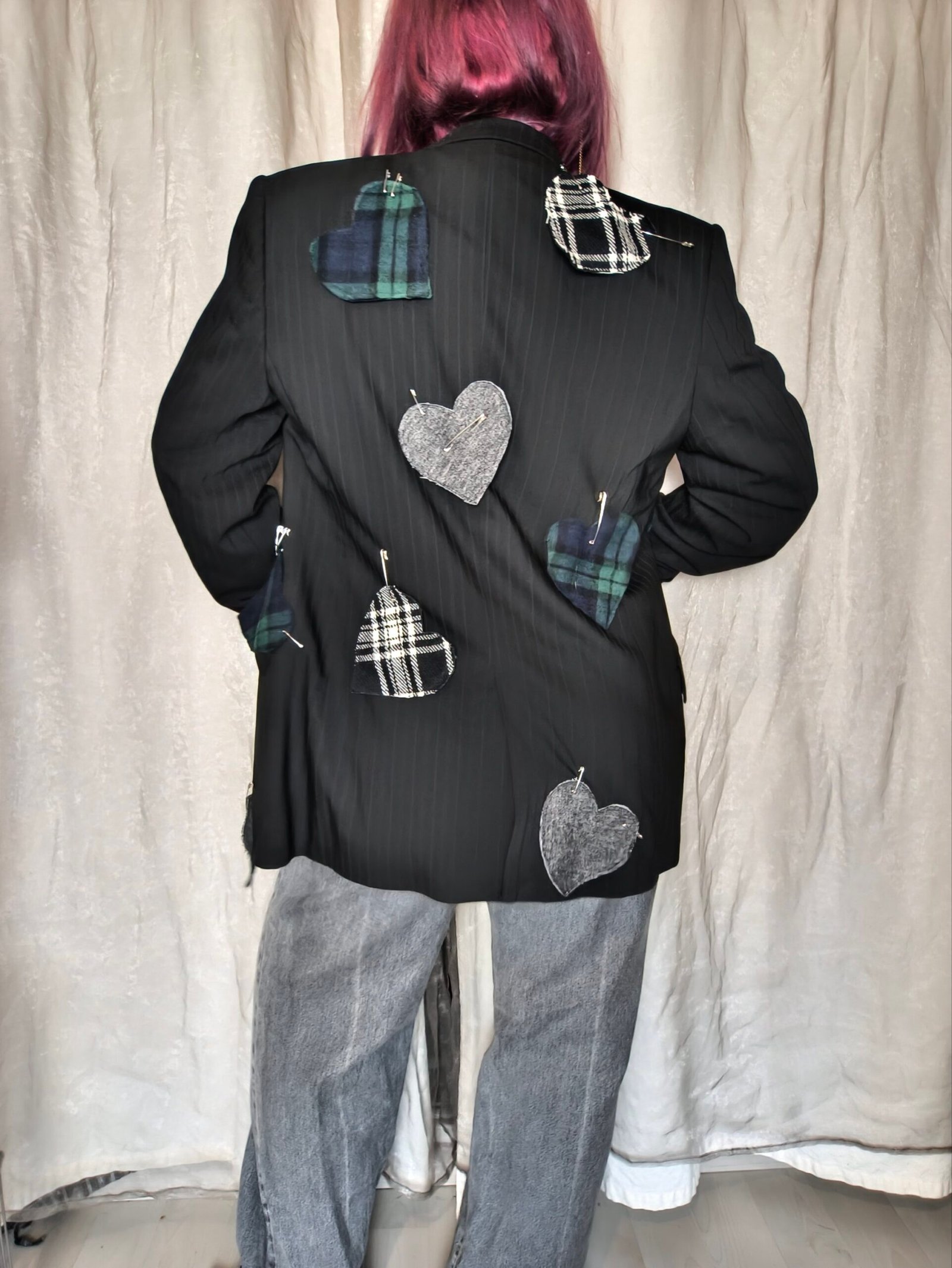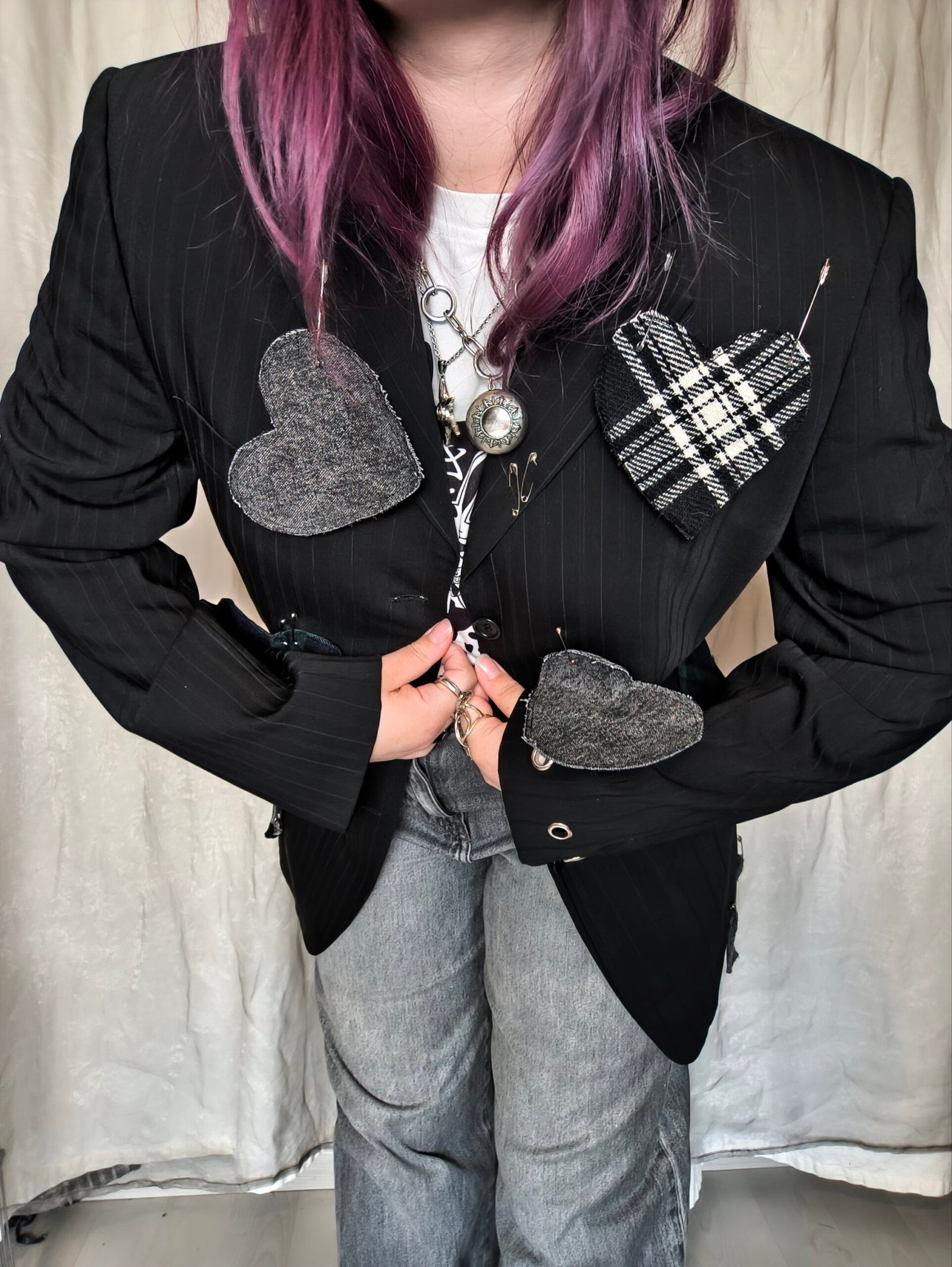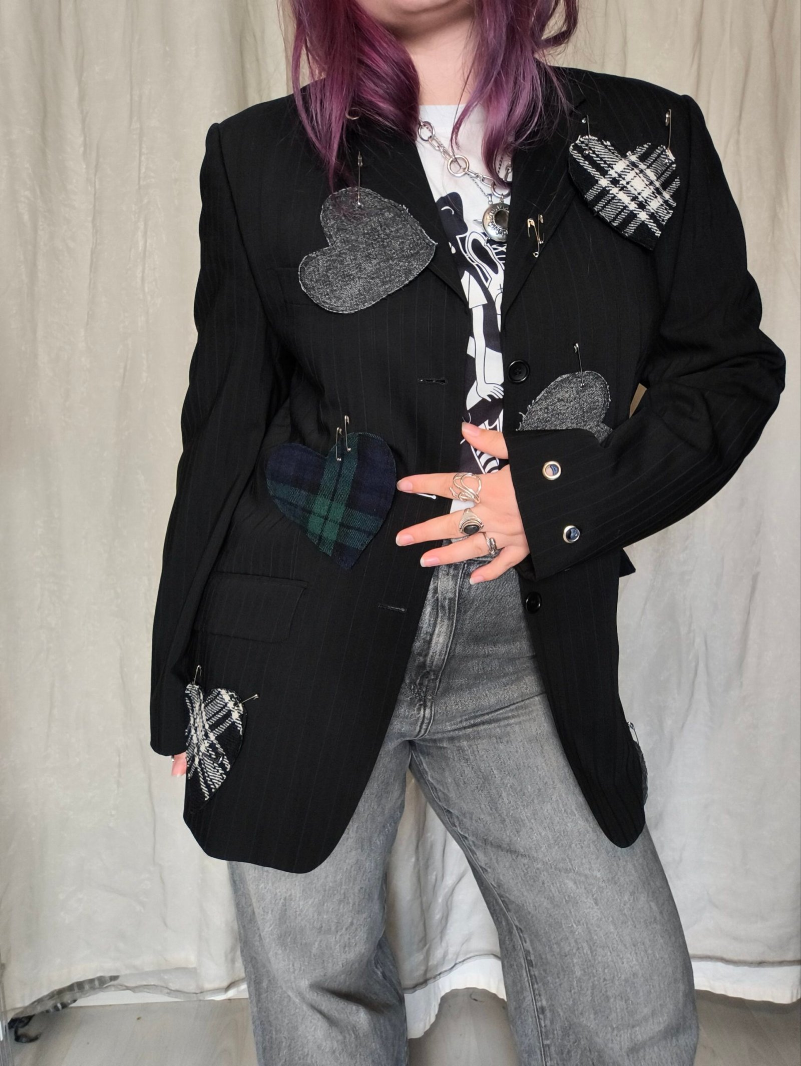 Veste blazer noir avec coeur en tartan et en jean avec épingle à nourrice et oeillets.