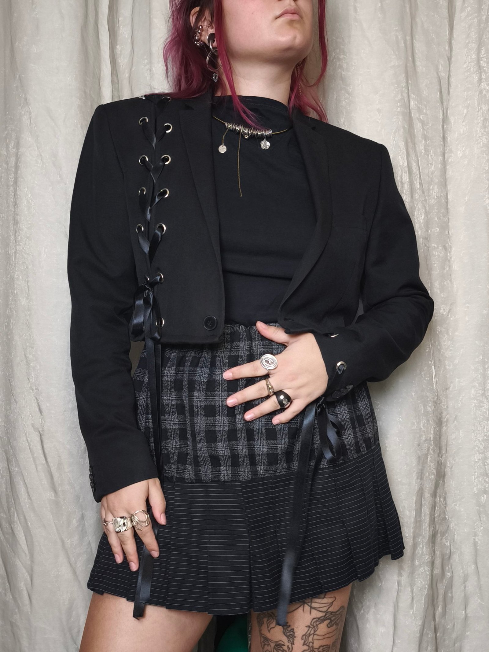 Blazer cropped. avec ouverture sur le devant avec laçage . oeillet sur le devant et sur le bas d’une manche.