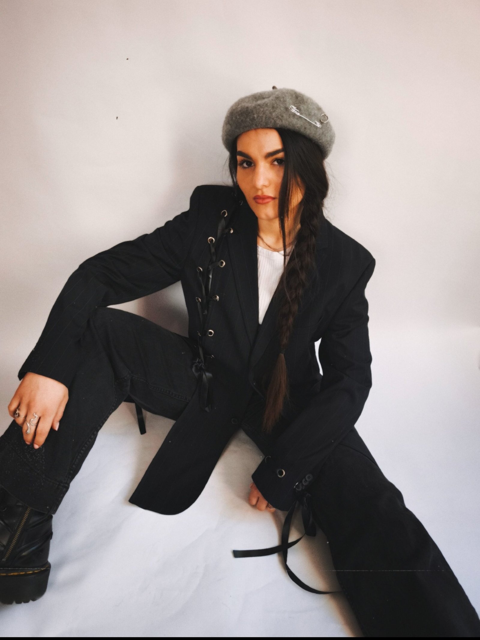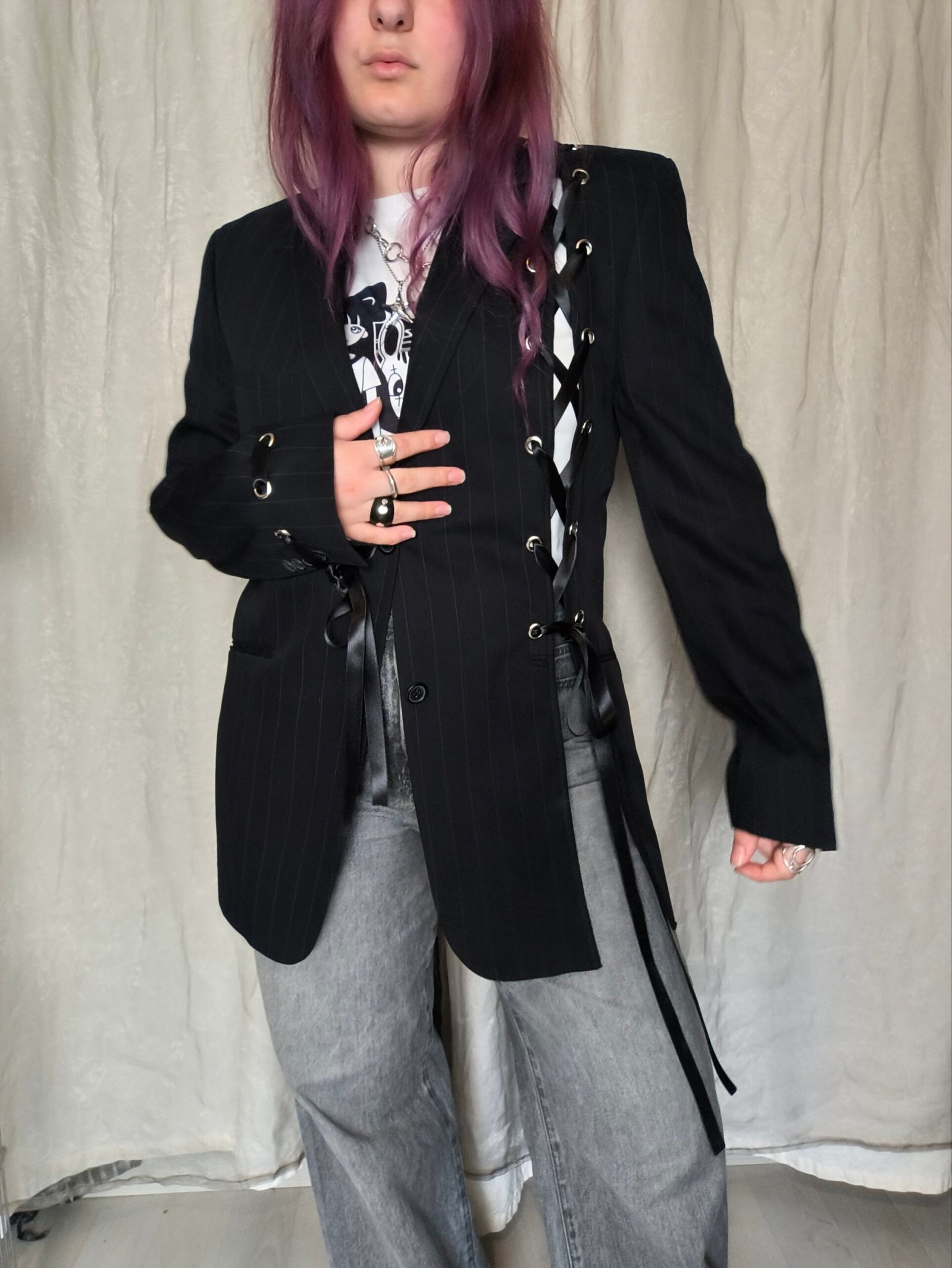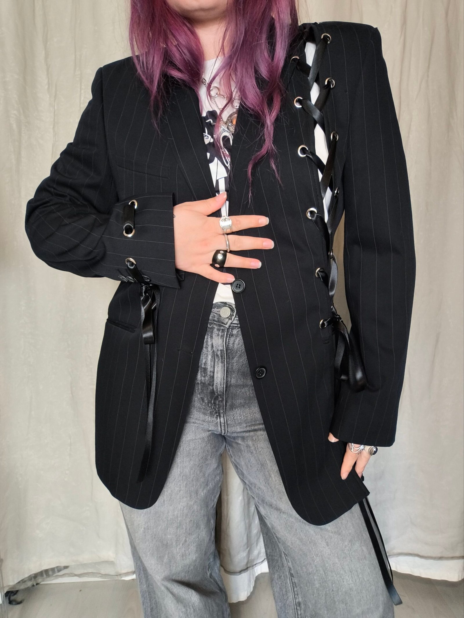 Veste blazer noir rayé avec oeillets et laçage.