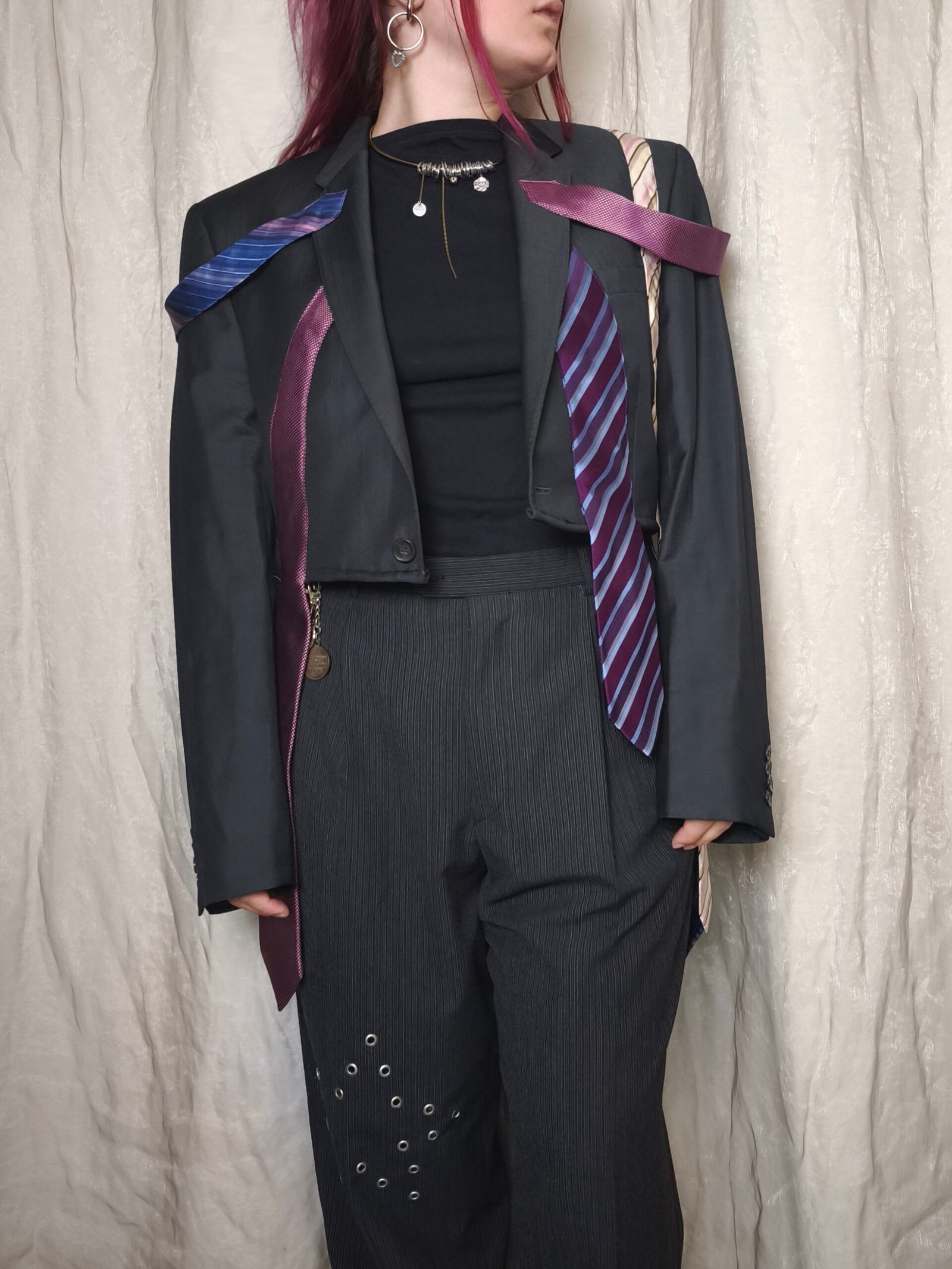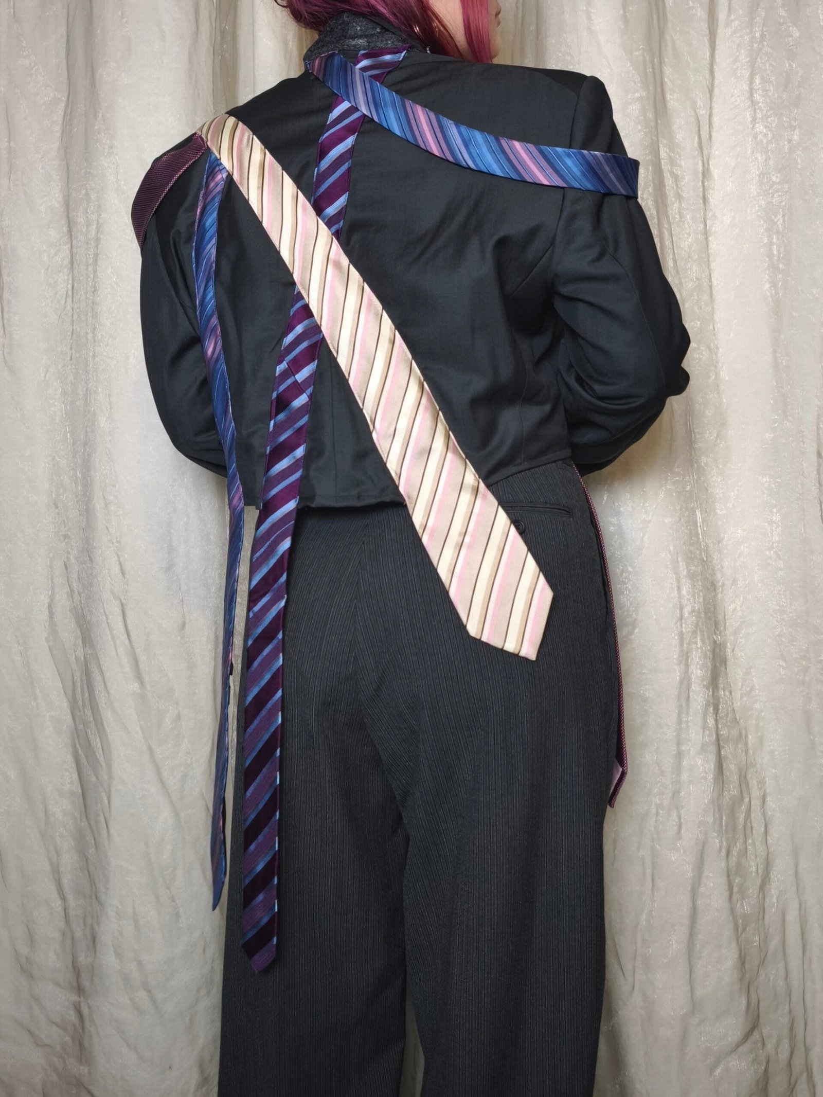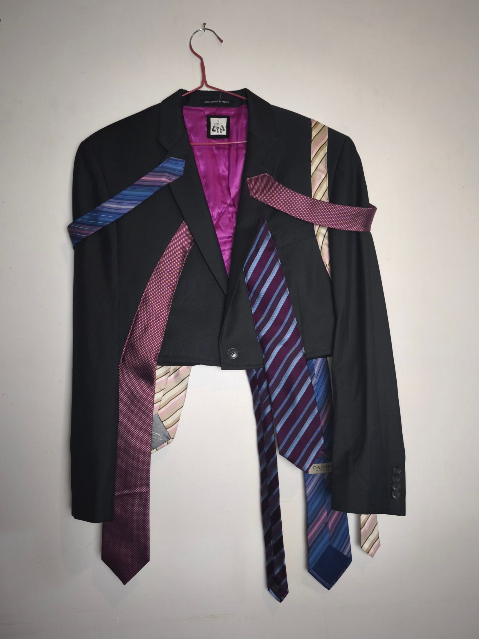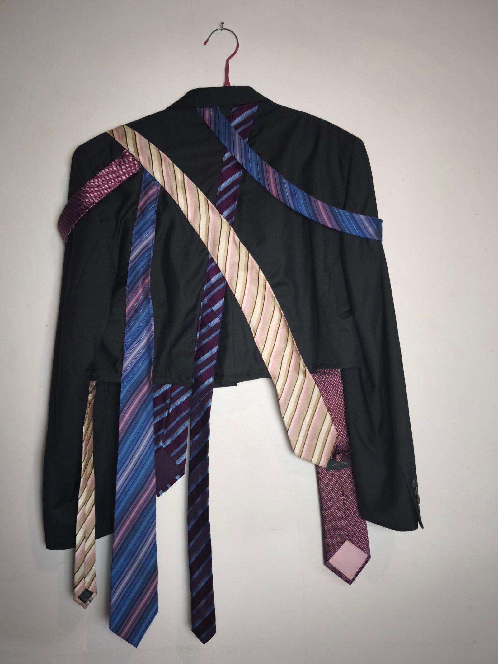 Blazer cour avec mélange de cravates rayé dans les tons bleus et rose.