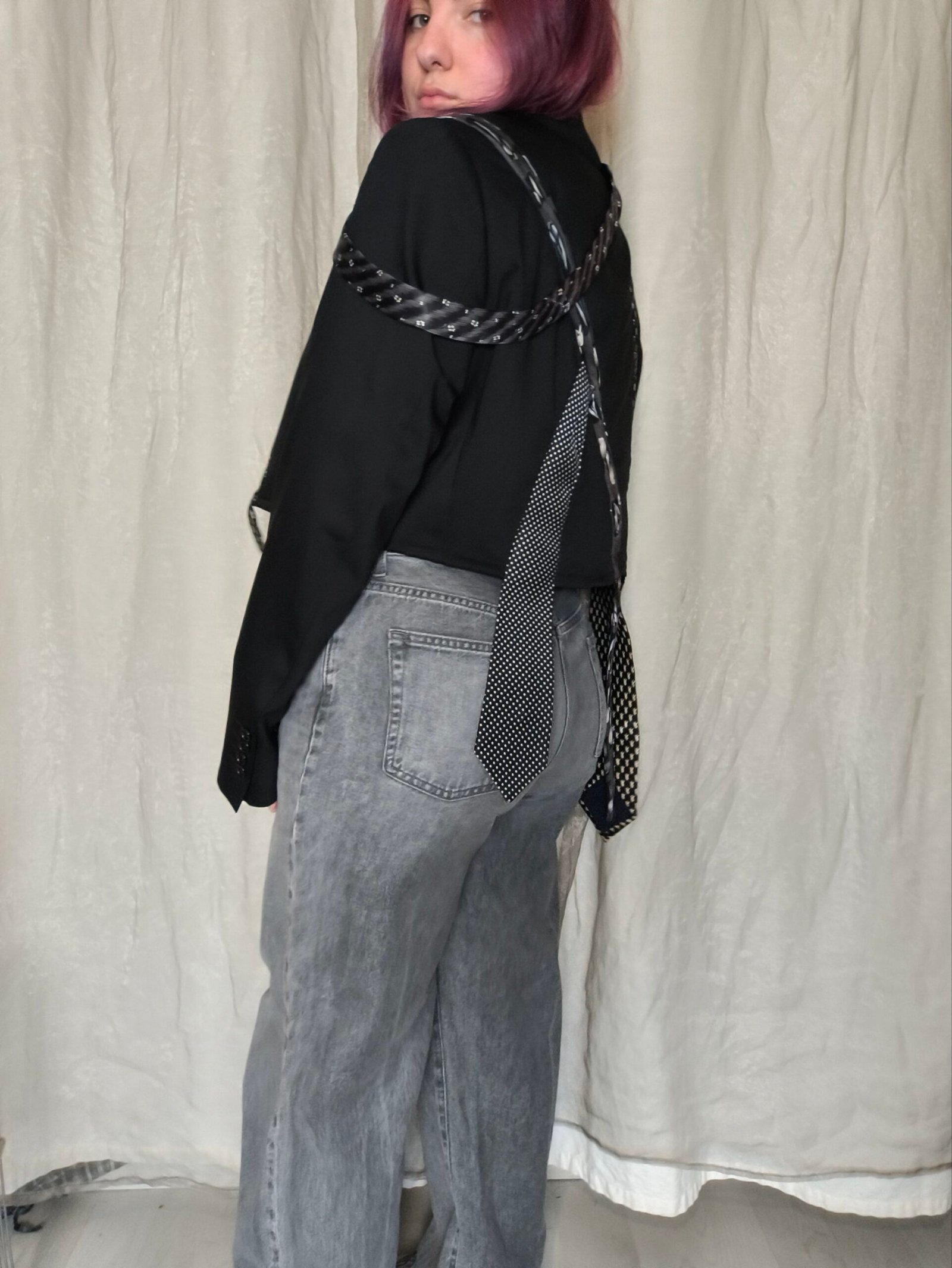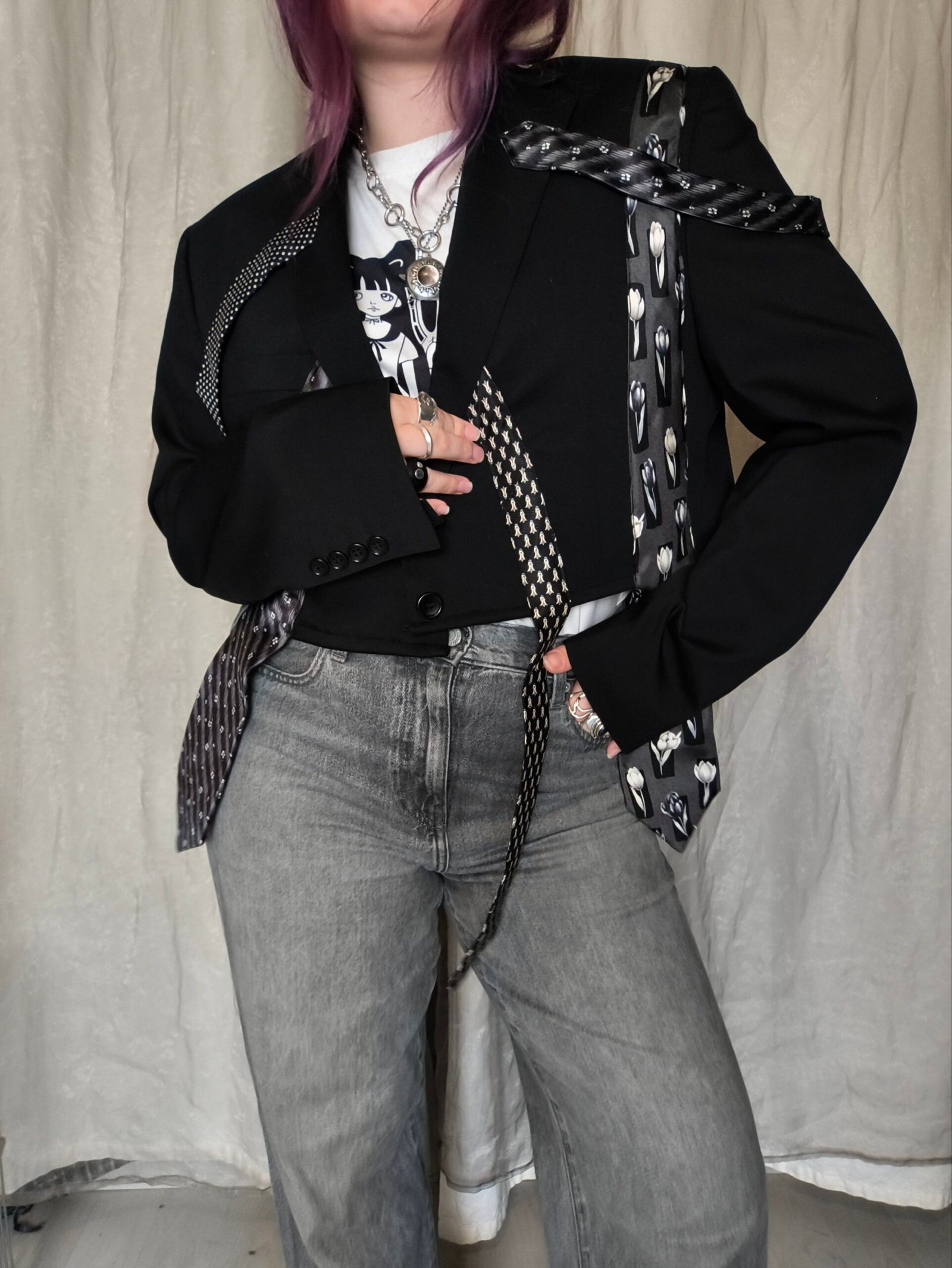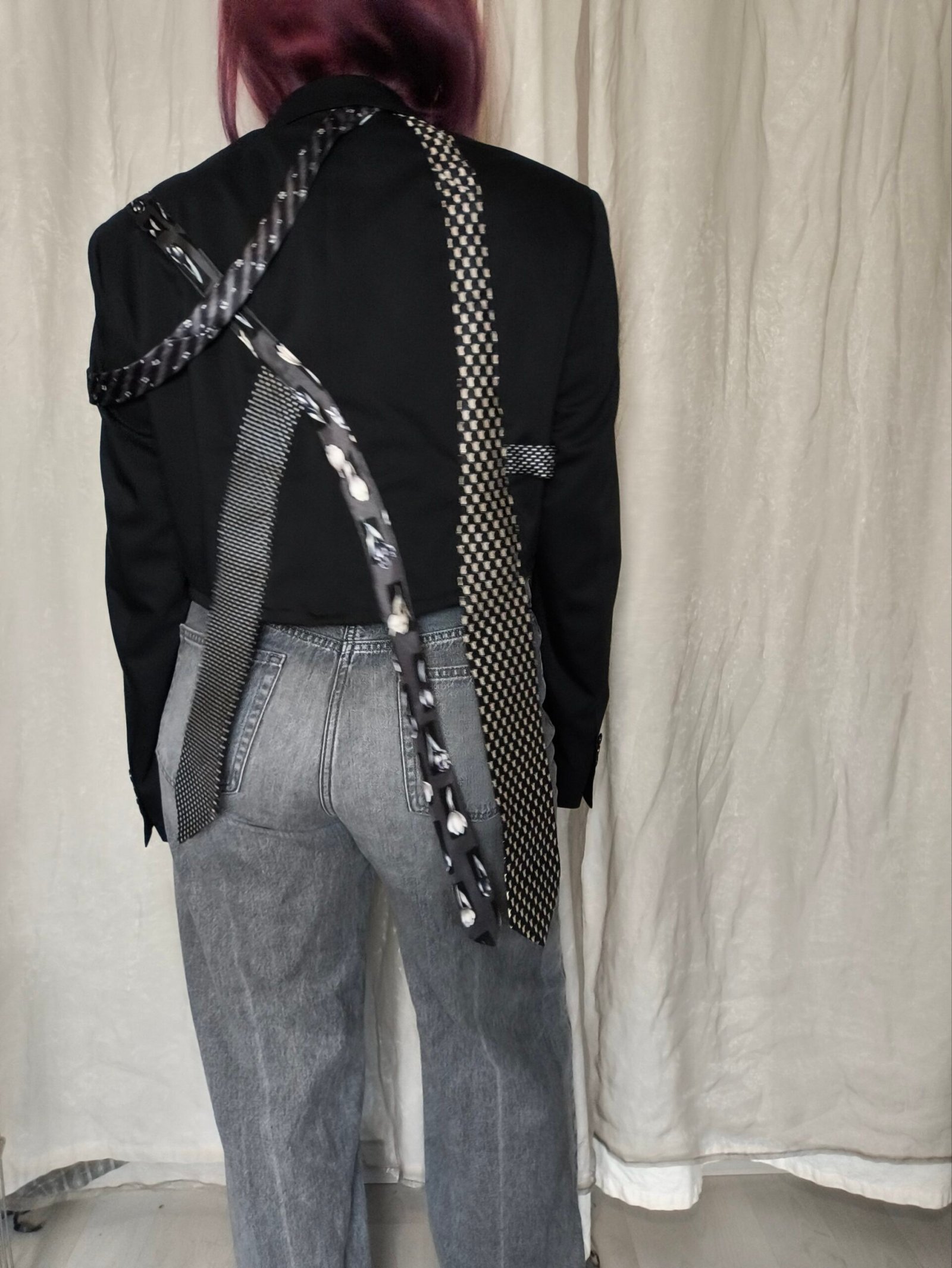 Veste blazer court noir avec cravate dans les tons noirs et gris
