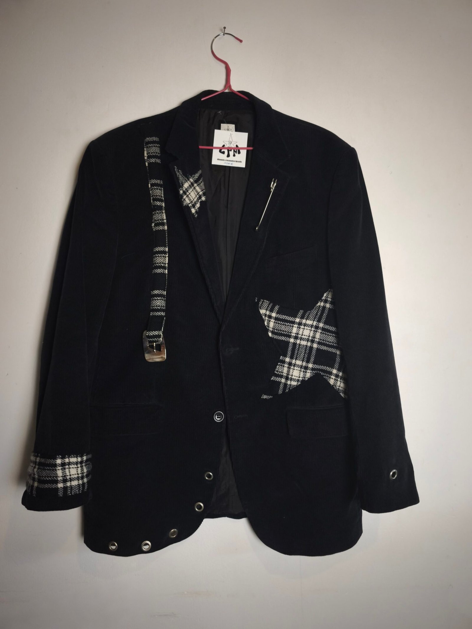 Blazer noir en velours côtelé. empiècement tartan noir et blanc, Oeillets.