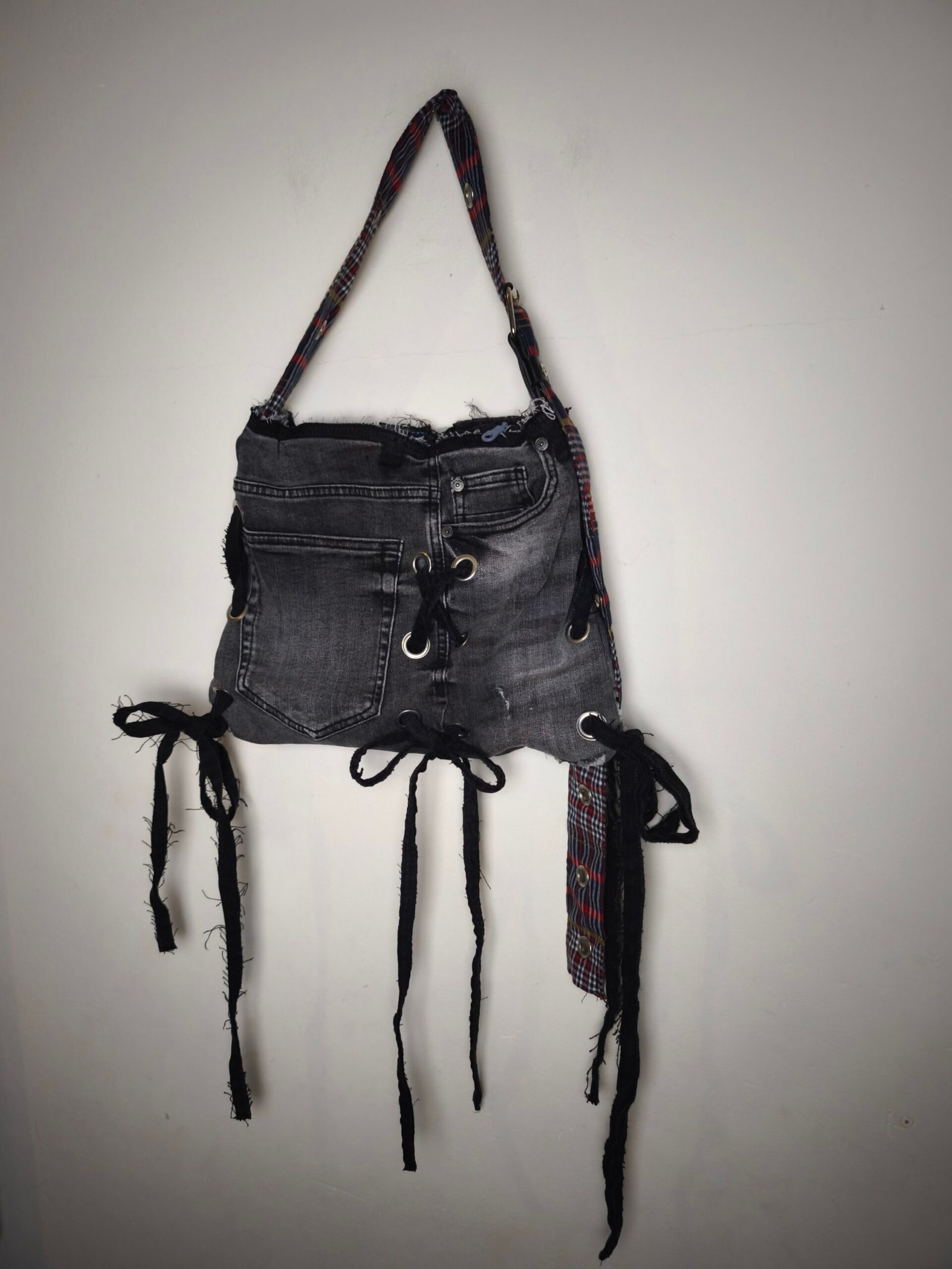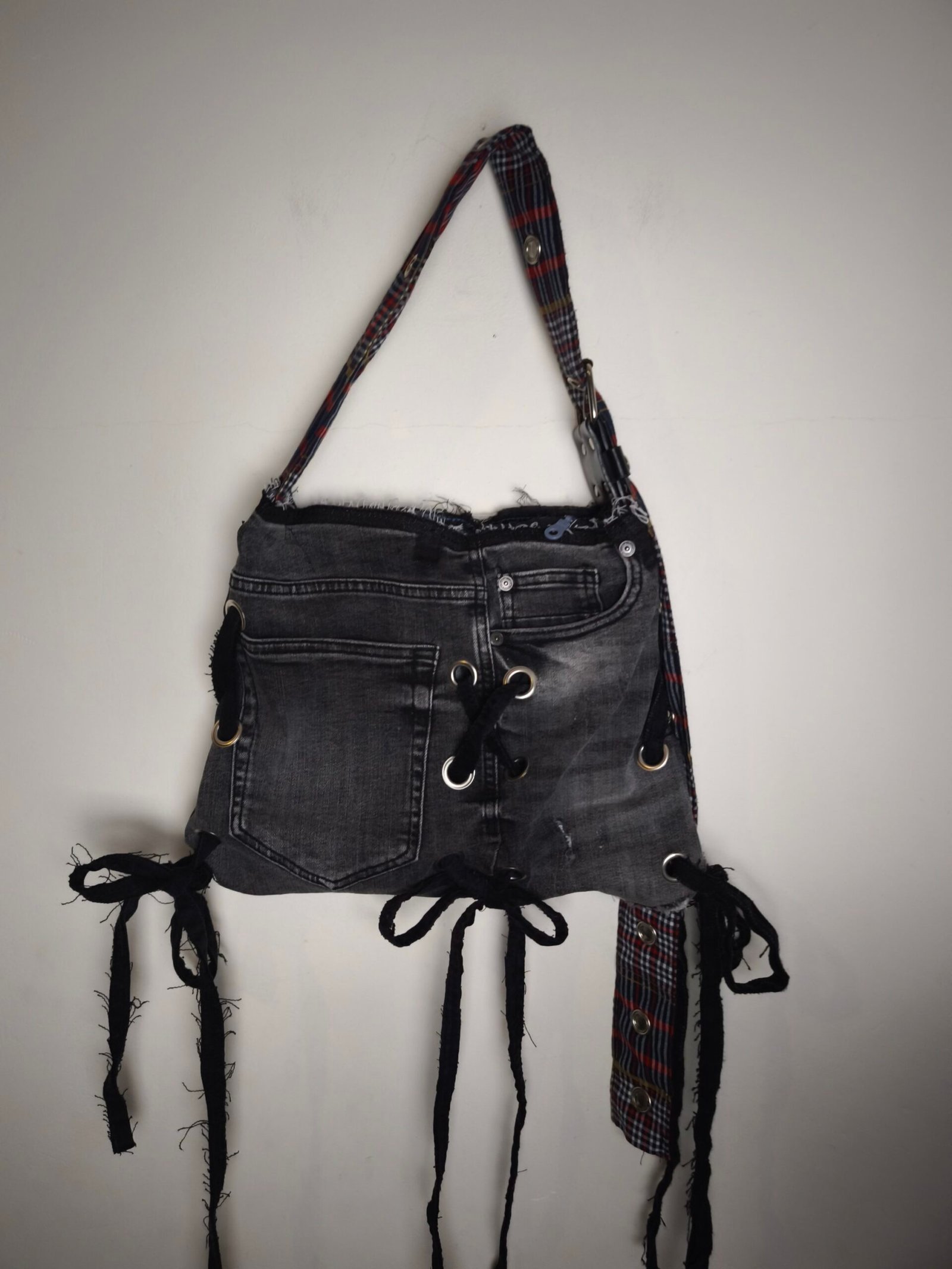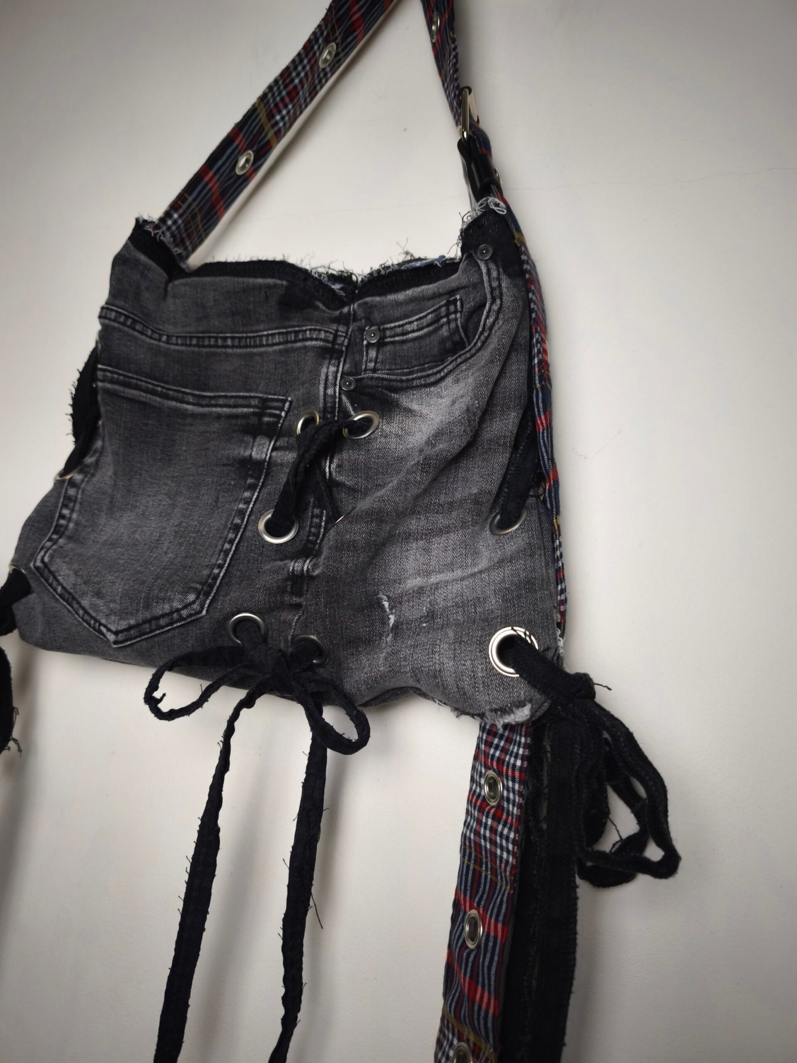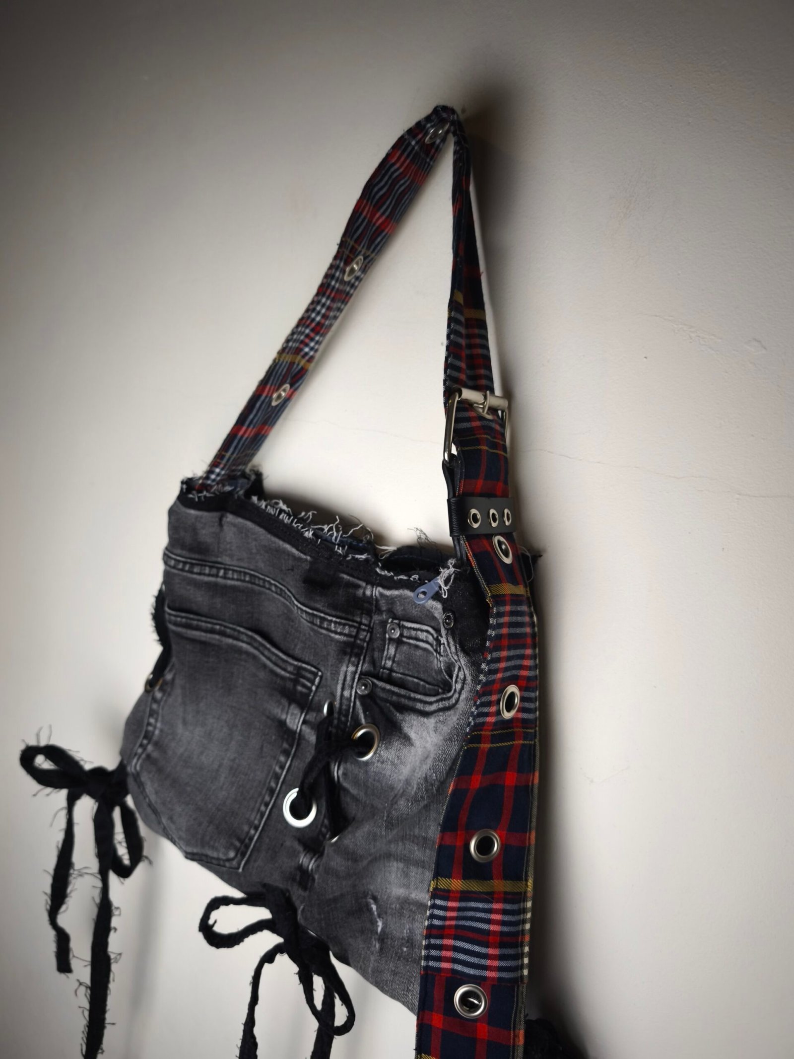 Sac en jean gris foncé avec laçage noir en jean. Anse en tartan rouge. Fermeture éclaire et une poche.