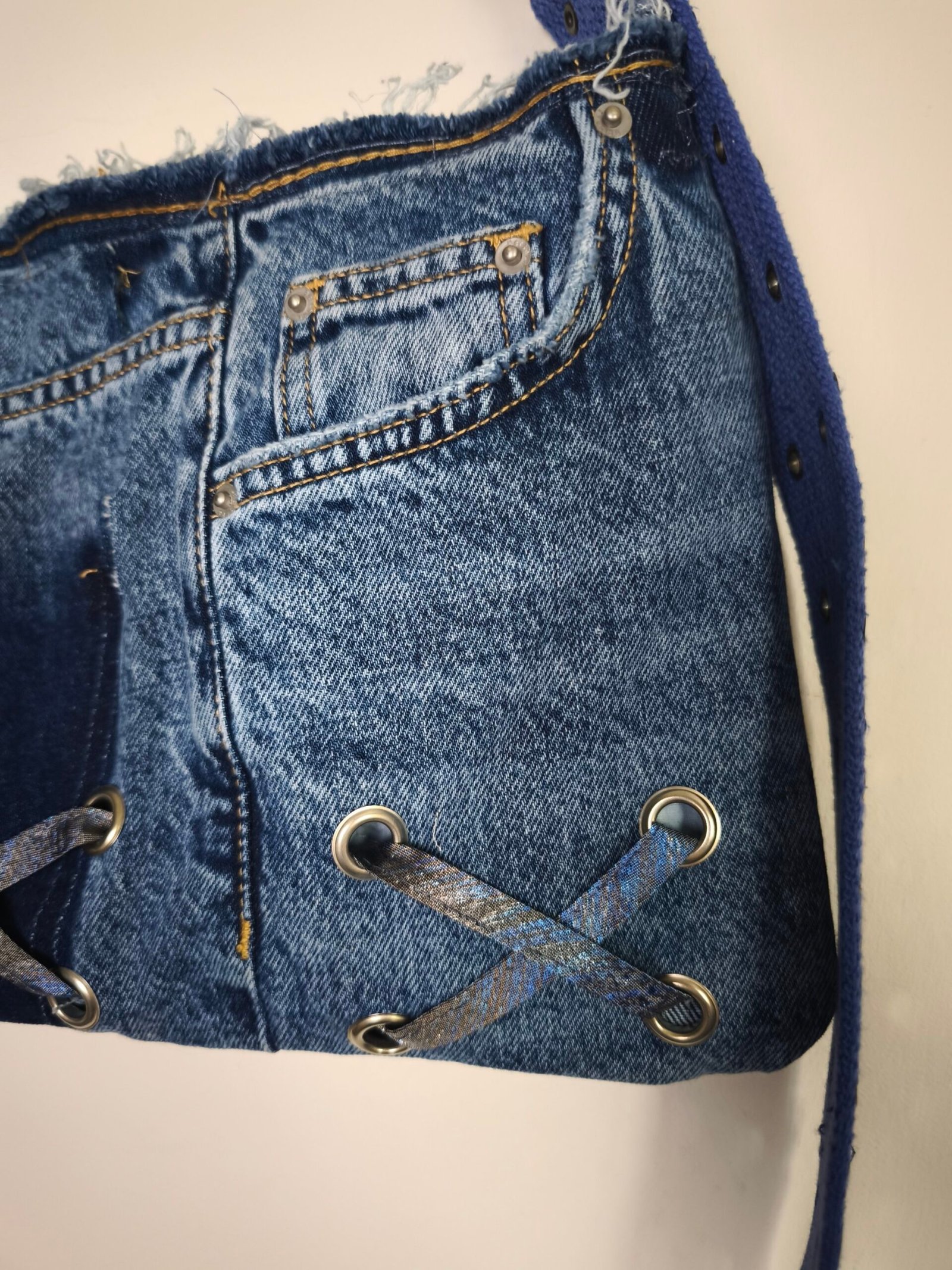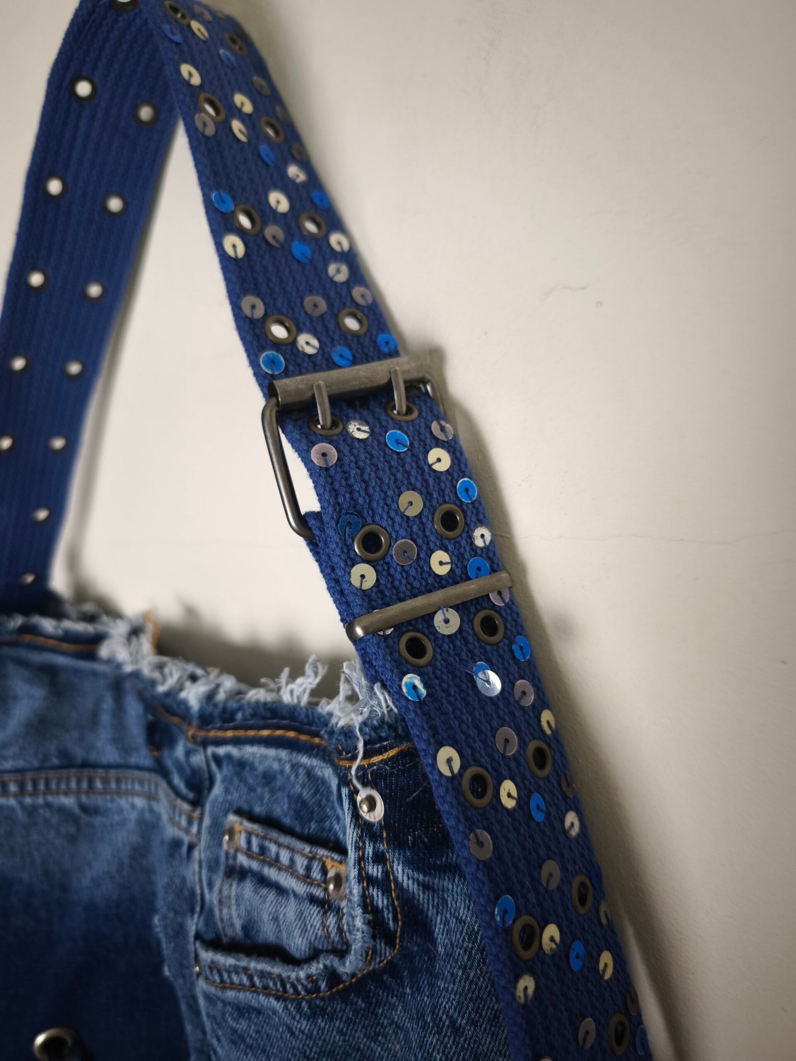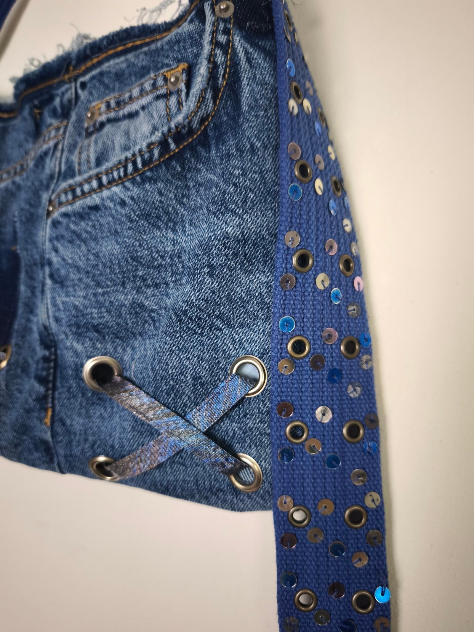 Sac en jean bleu avec laçage argenté et bleu. anse bleu avec sequins. fermeture éclair et poche intérieure.