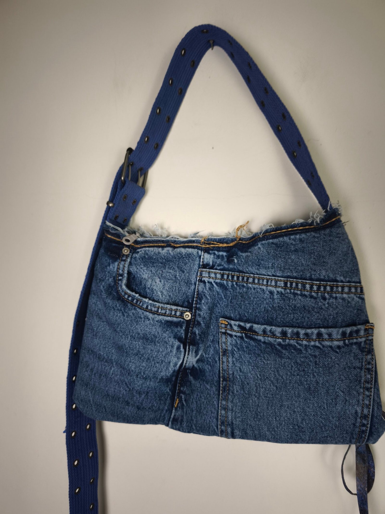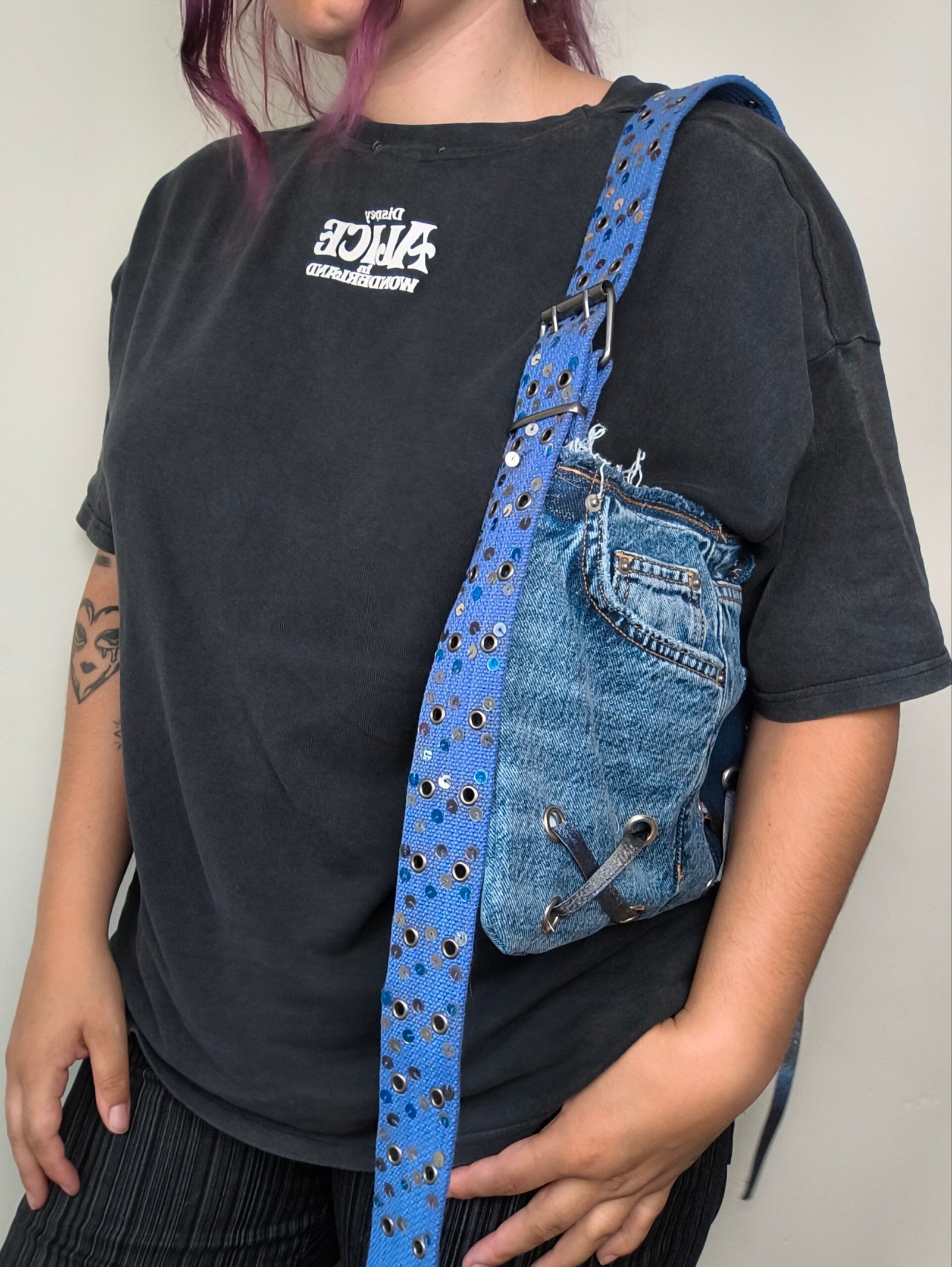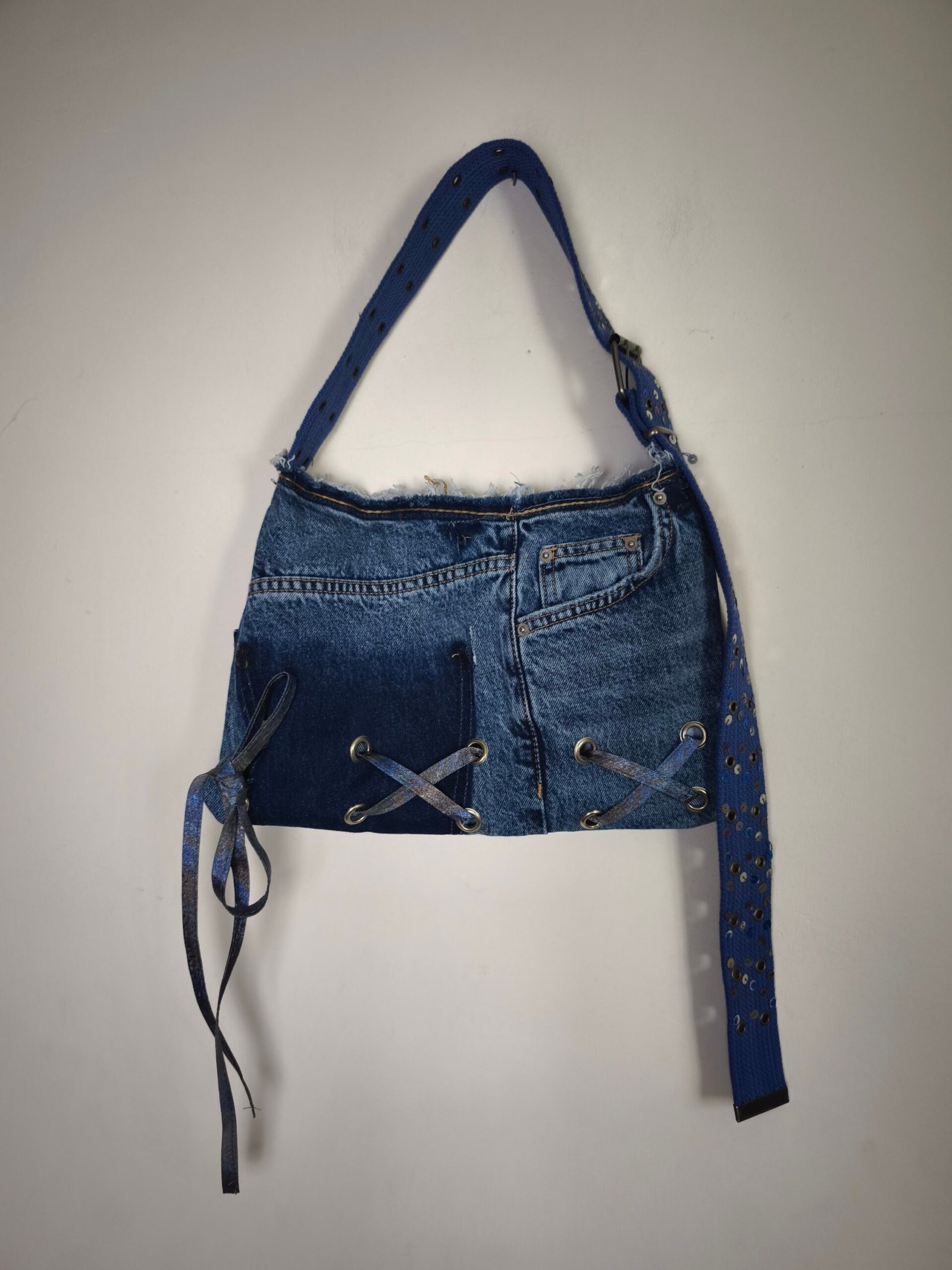 Sac en jean bleu avec laçage argenté et bleu. anse bleu avec sequins. fermeture éclair et poche intérieure.