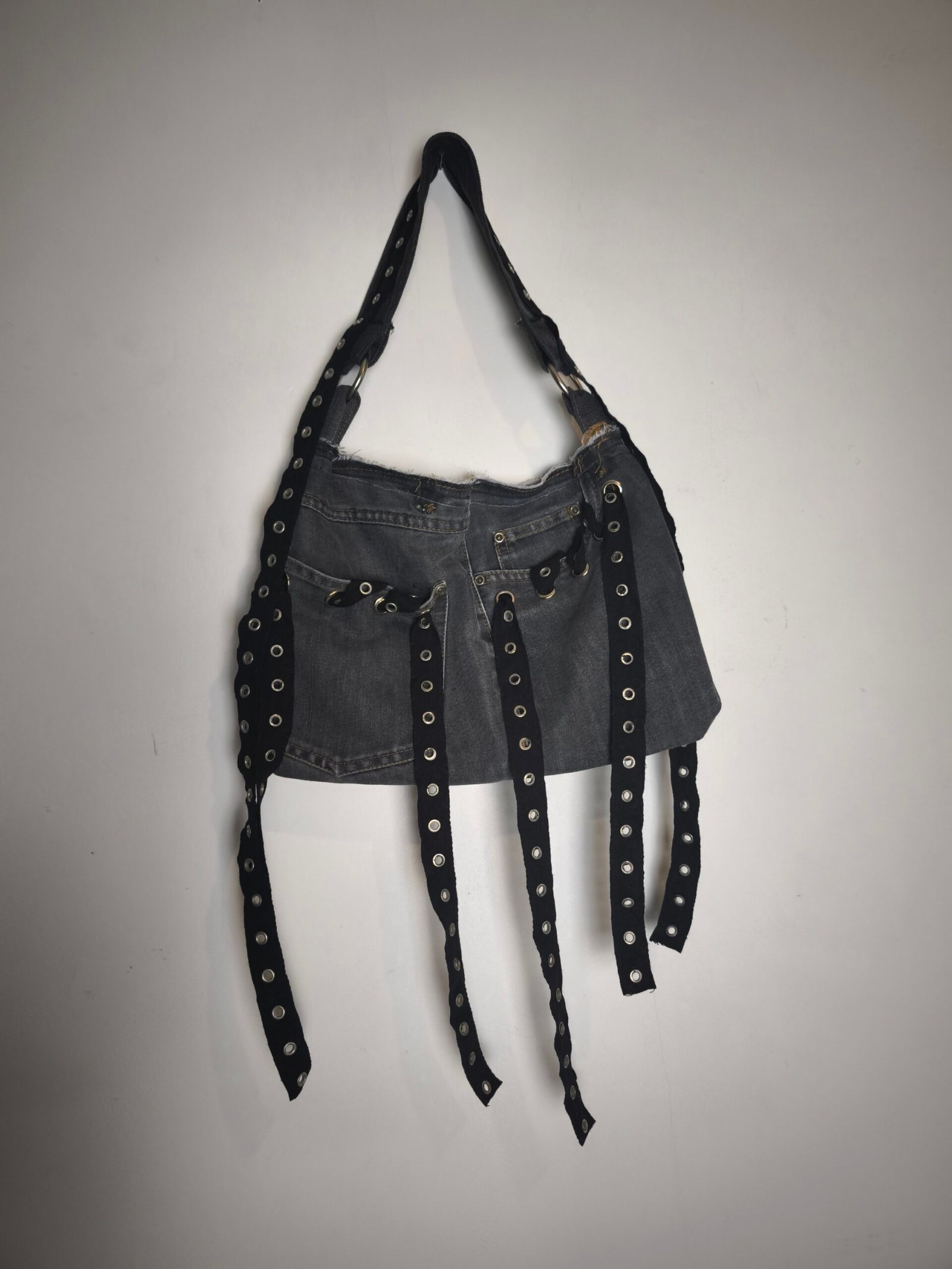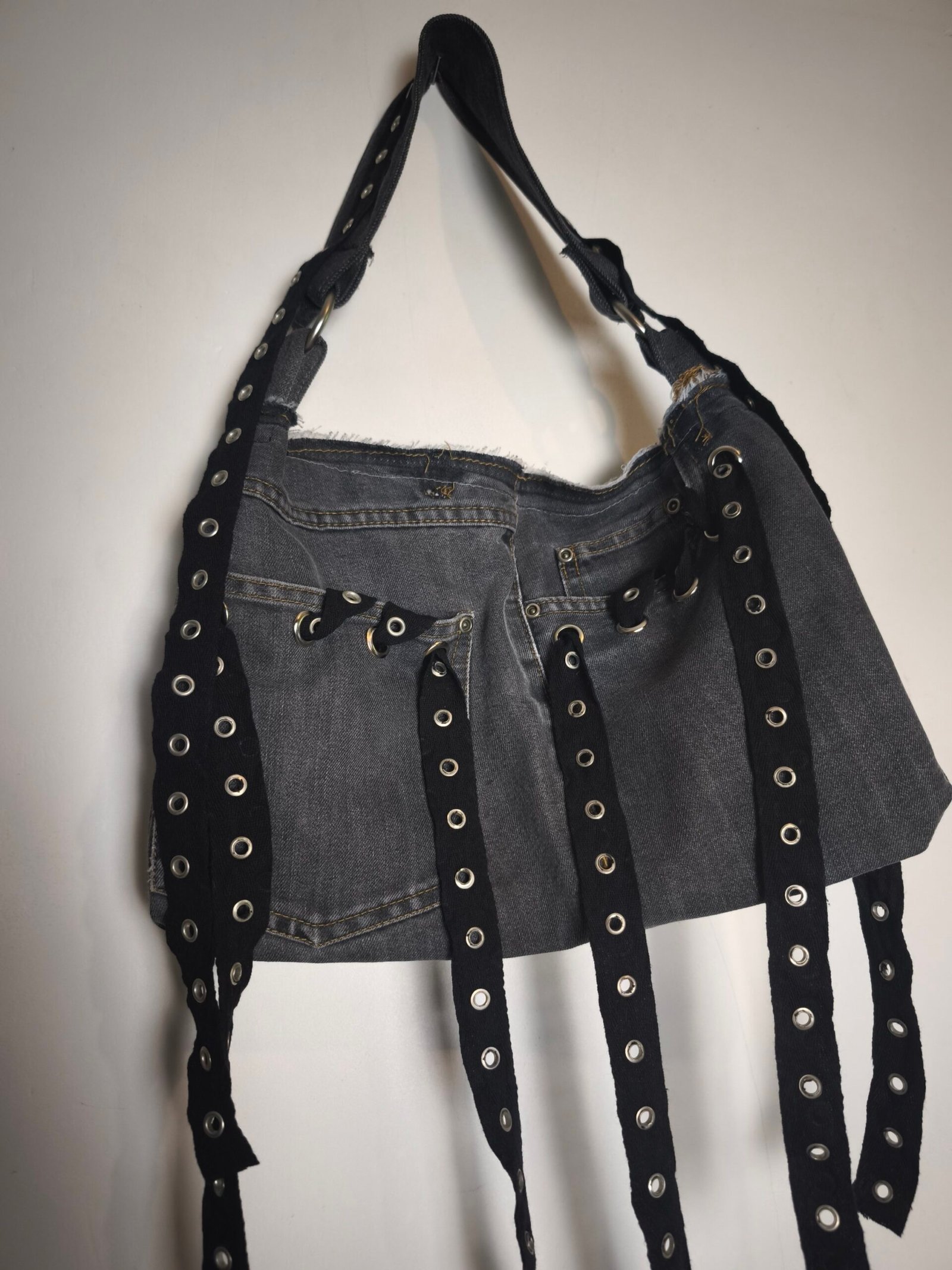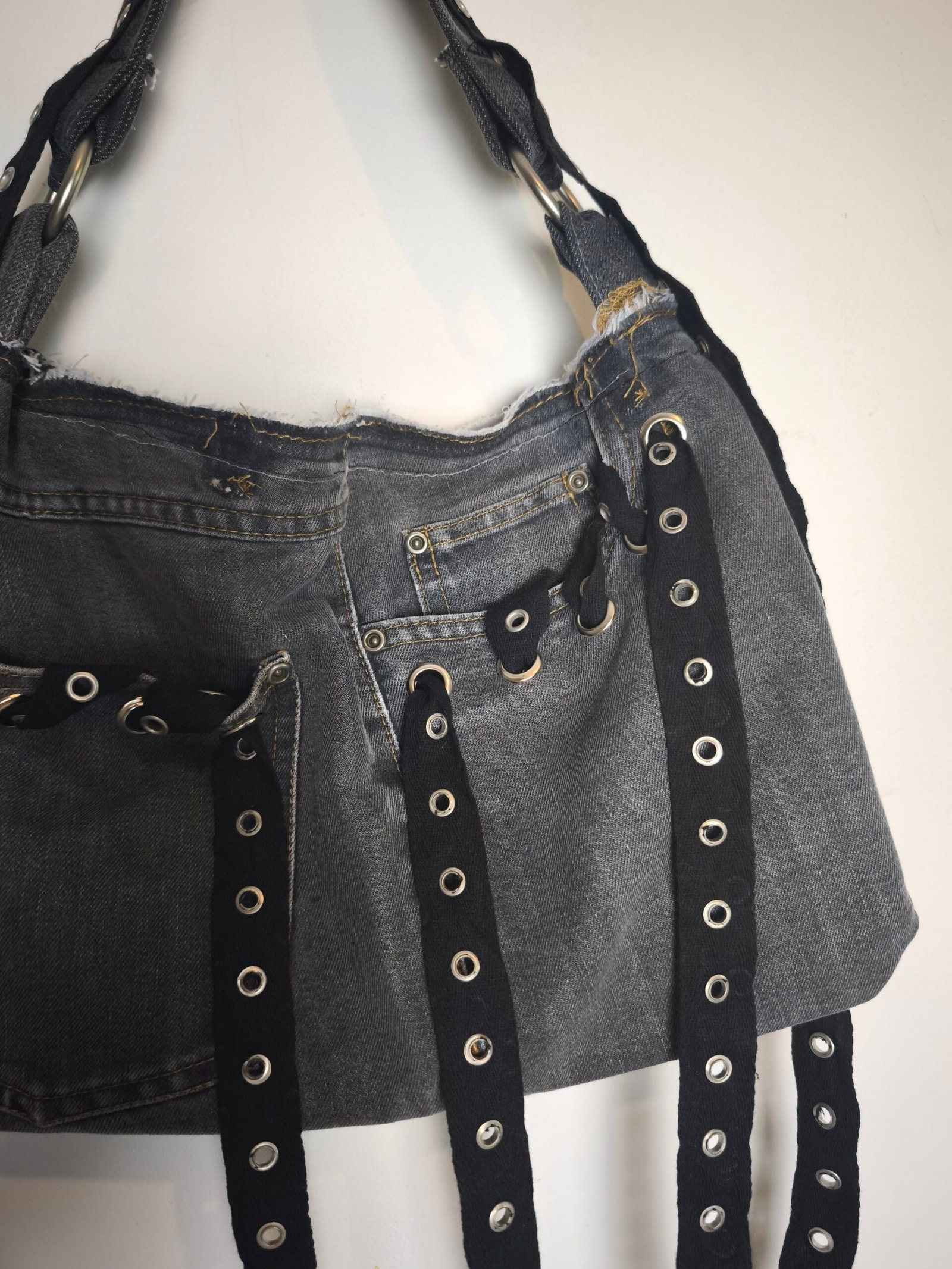 Sac à main en jean gris foncé avec bandes noires d’oeillets pendantes. fermeture éclair.