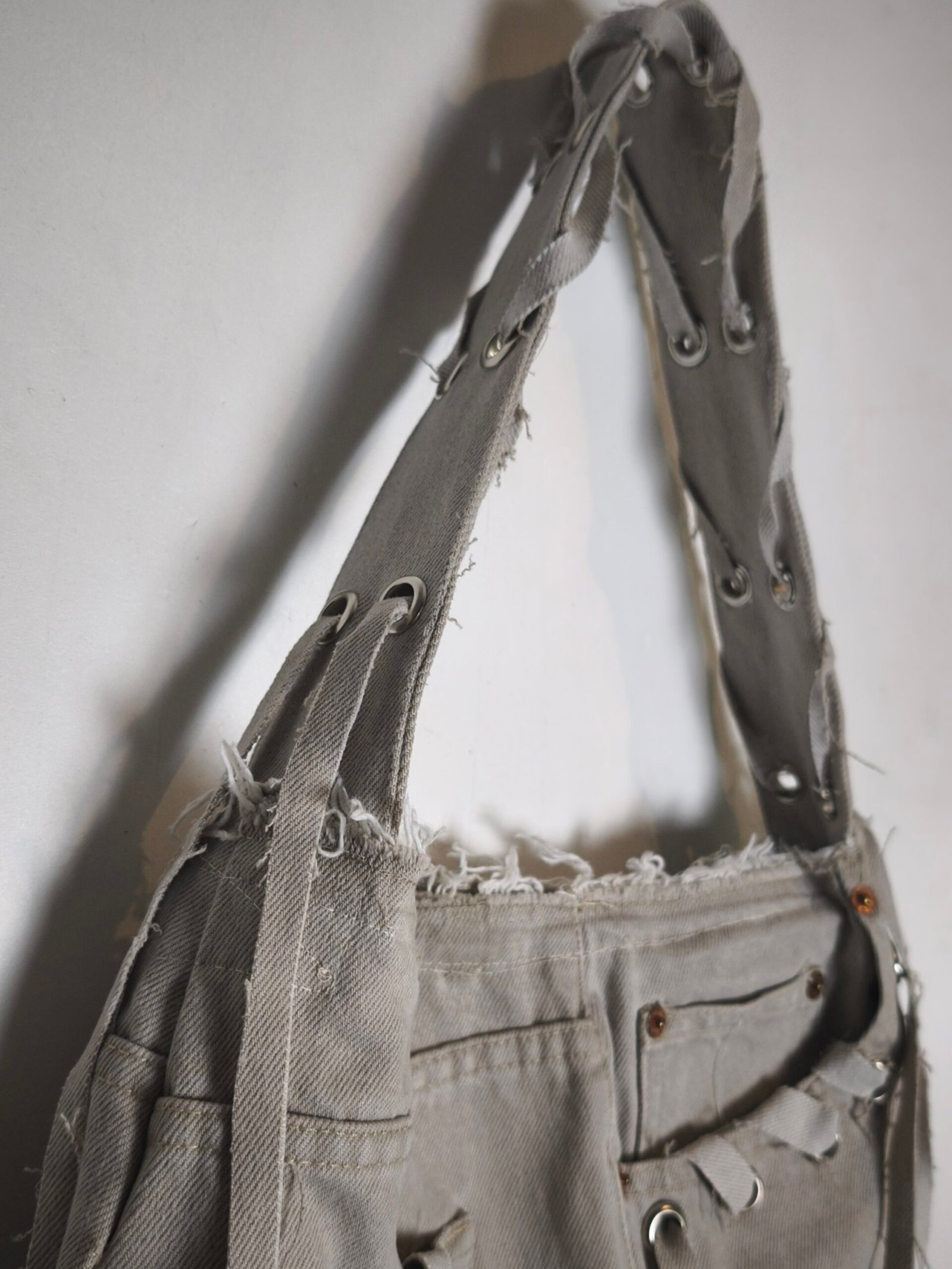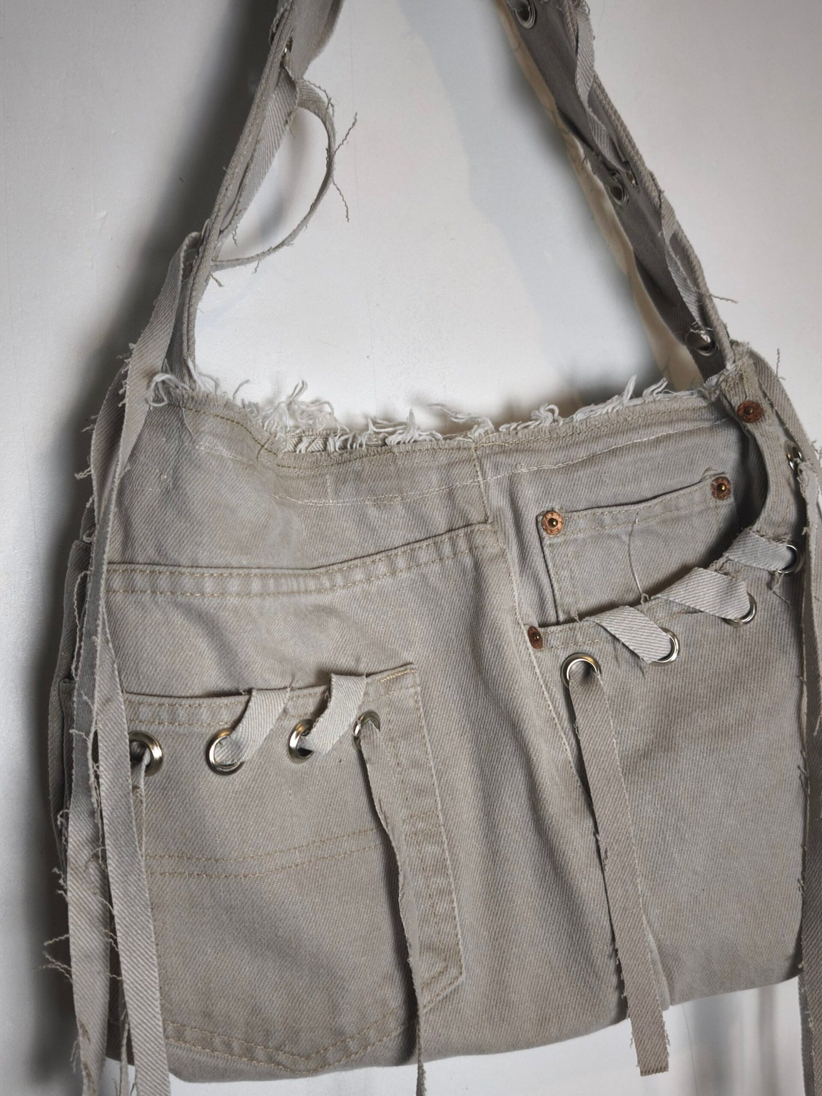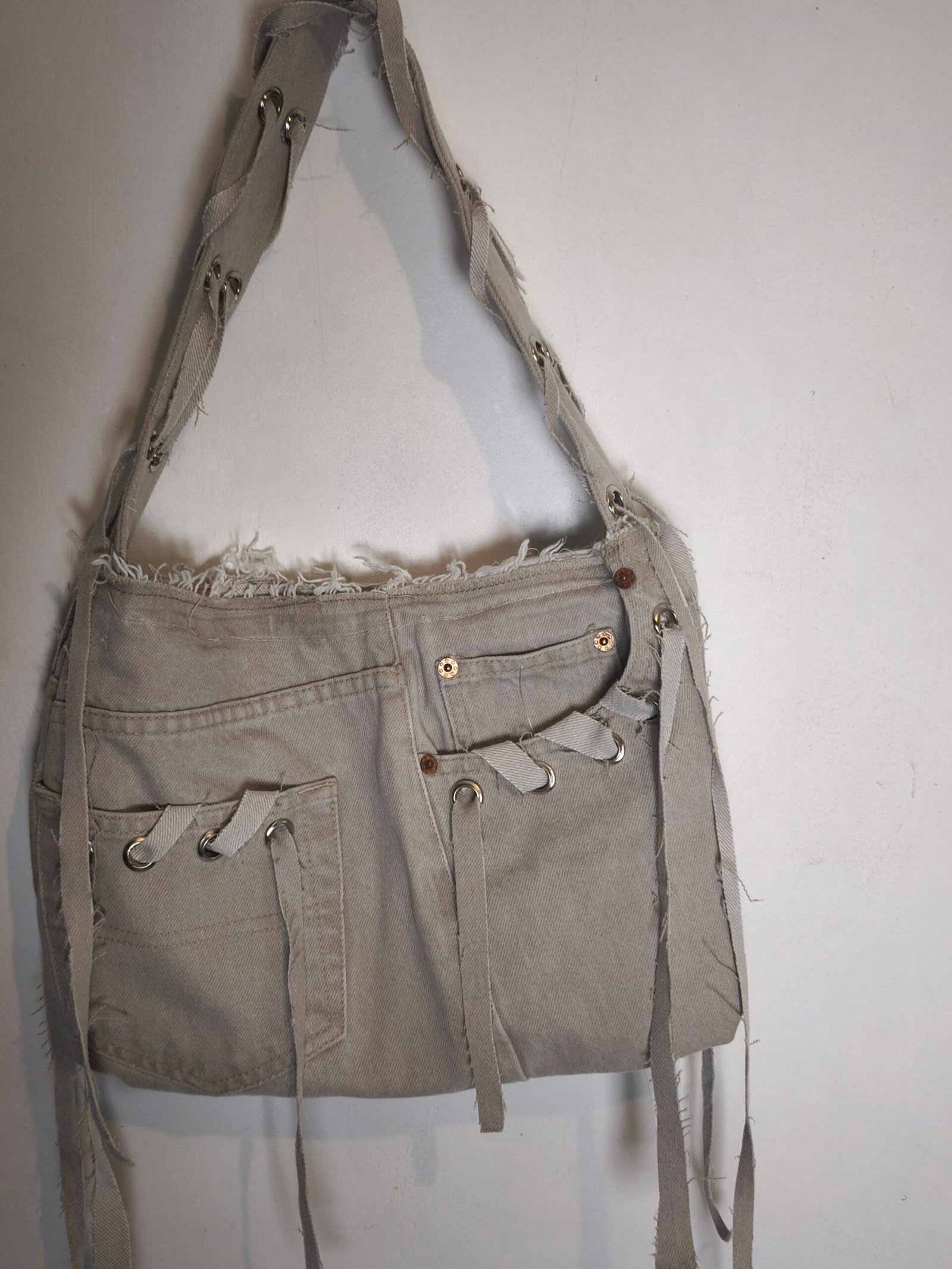 Sac a main en jean beige avec laçage et Oeillets. fermeture éclair.