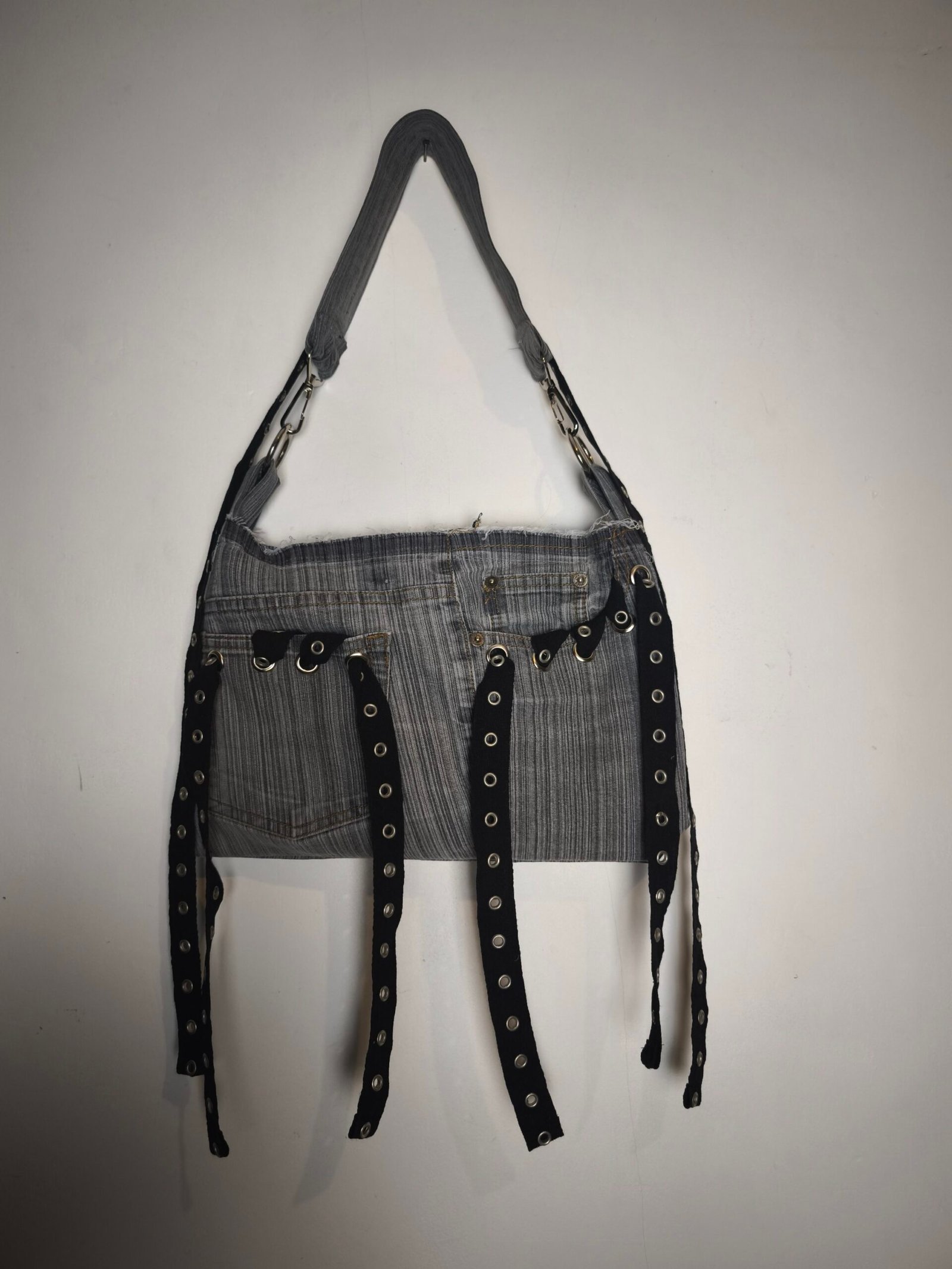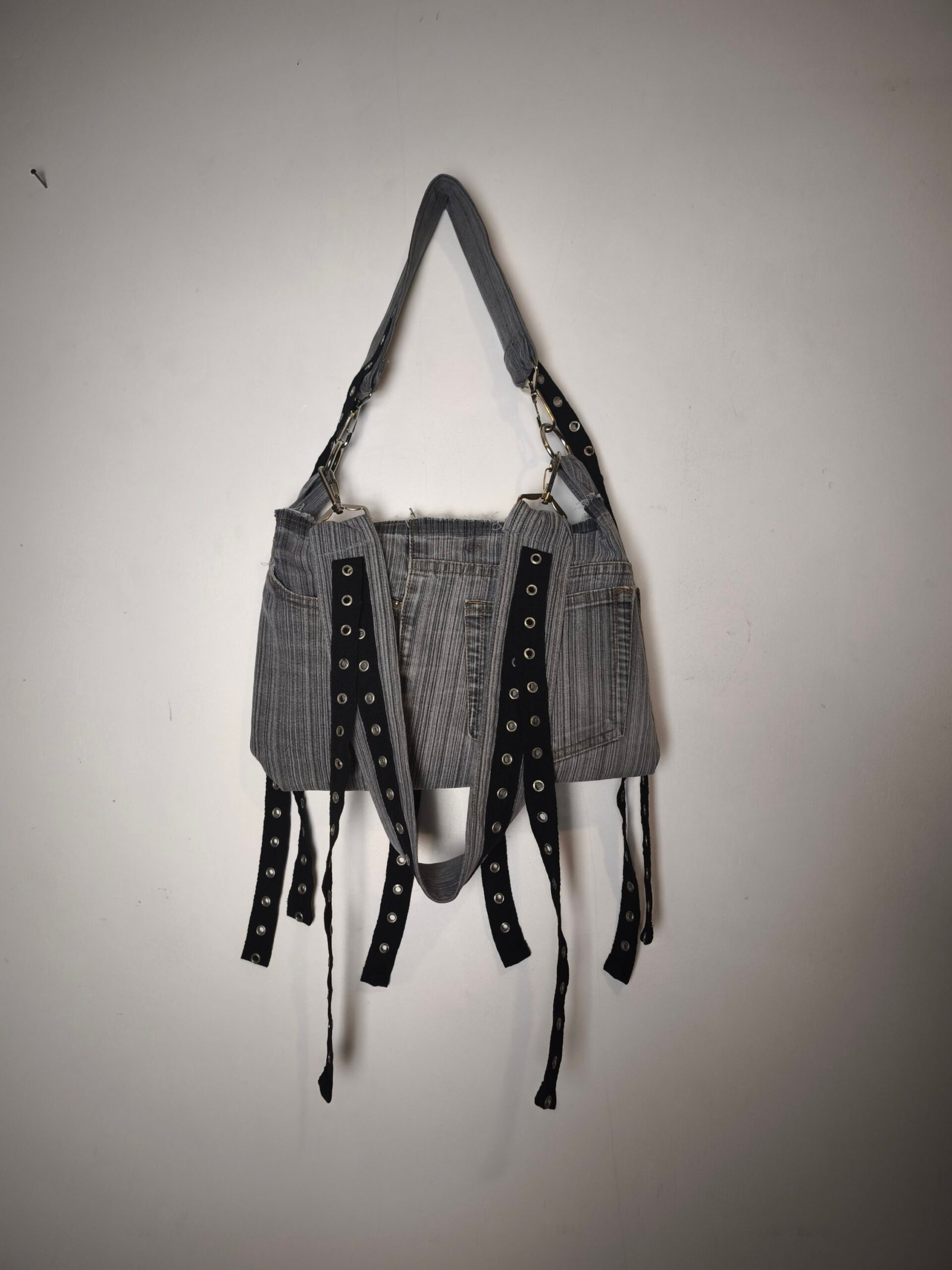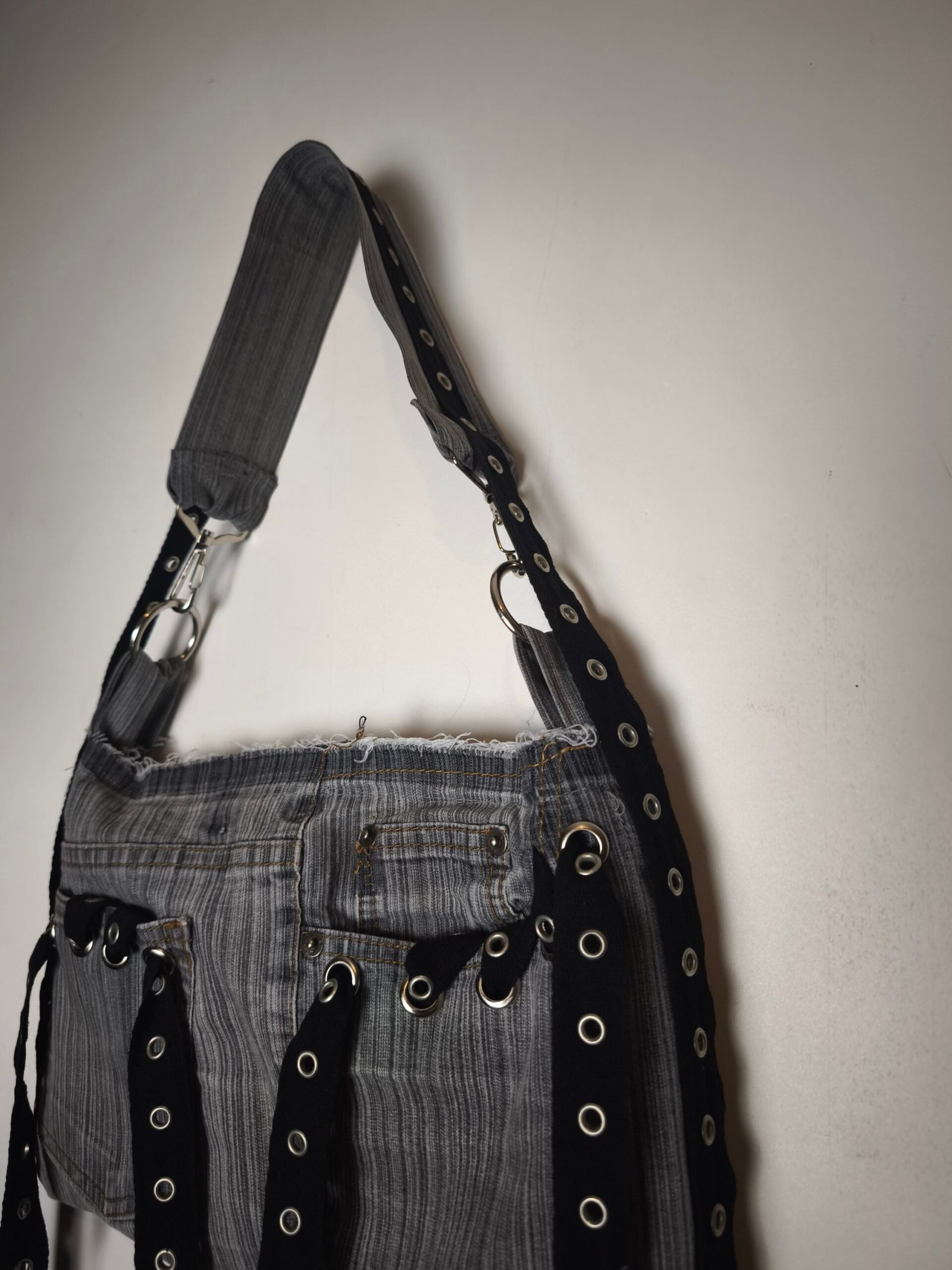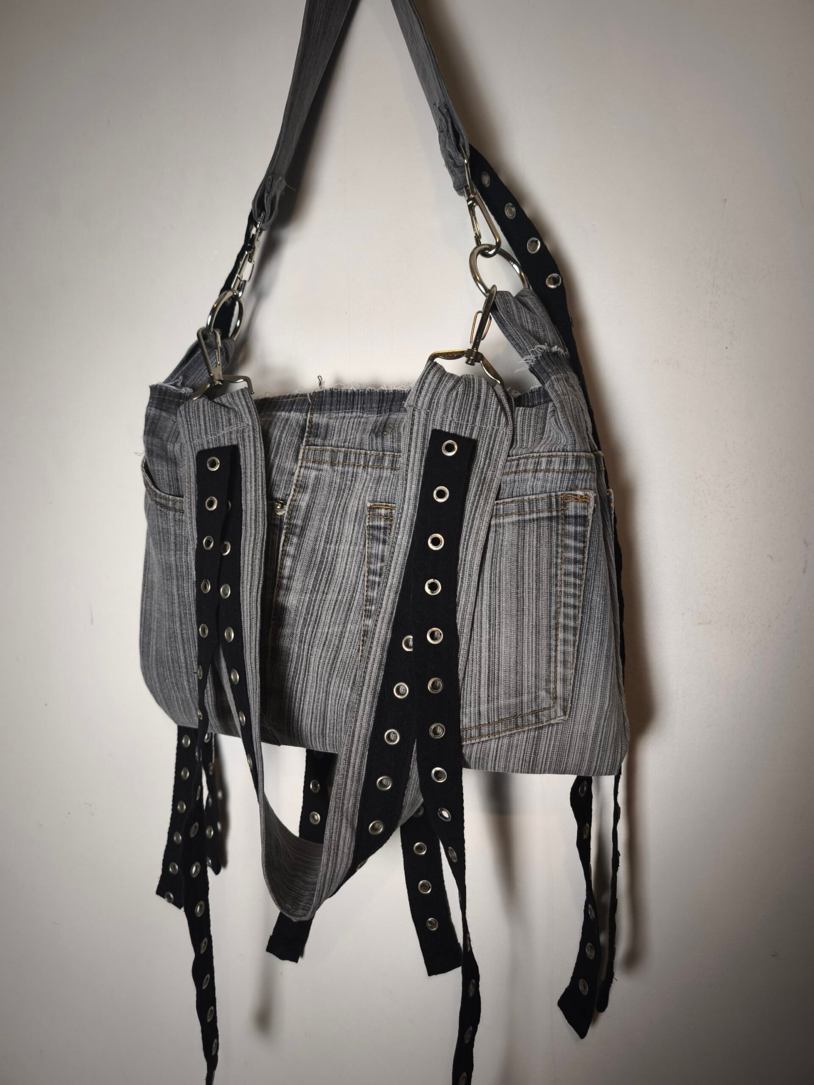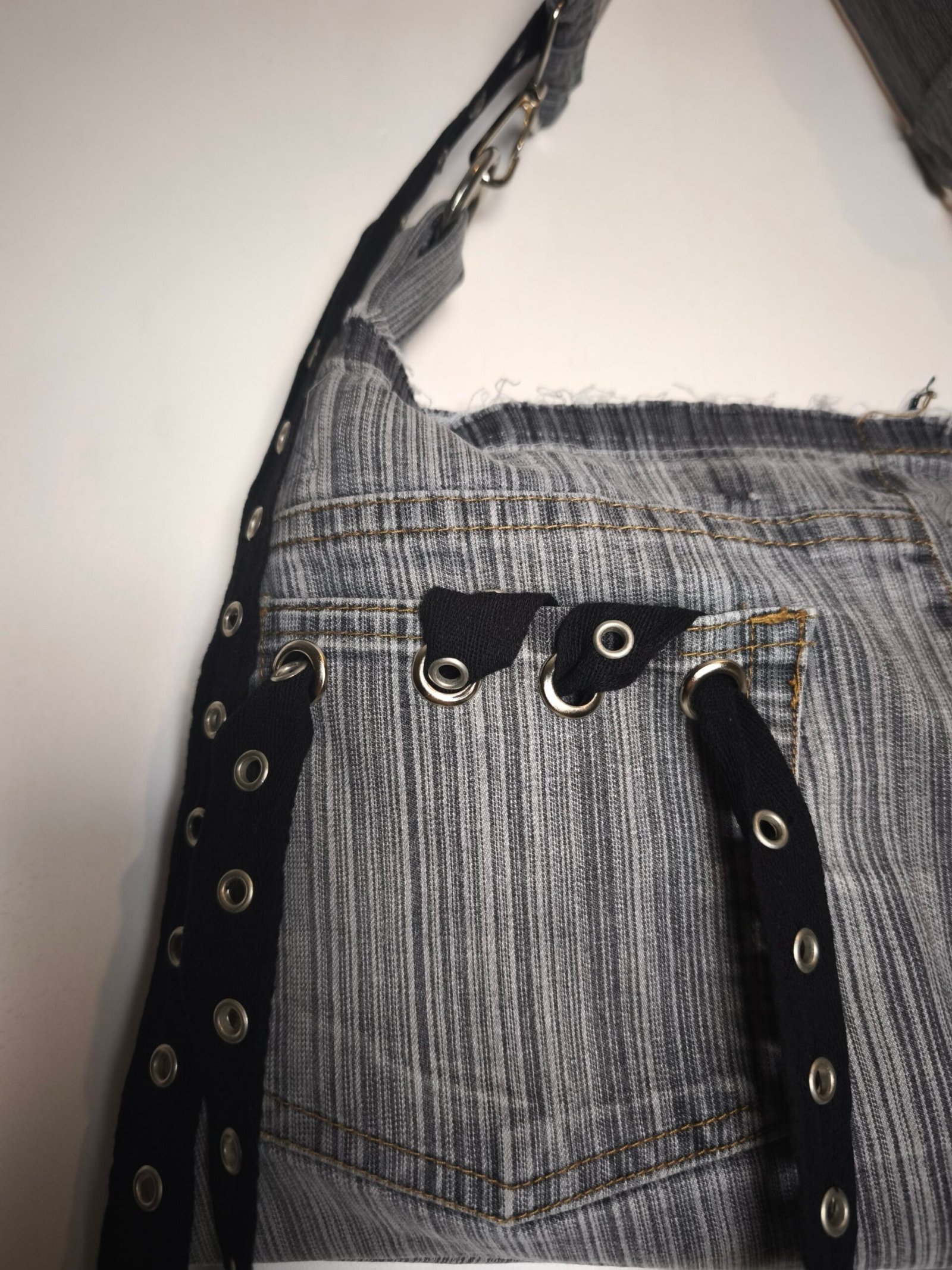 Sac en jean gris rayé avec bandes noir d’oeillets