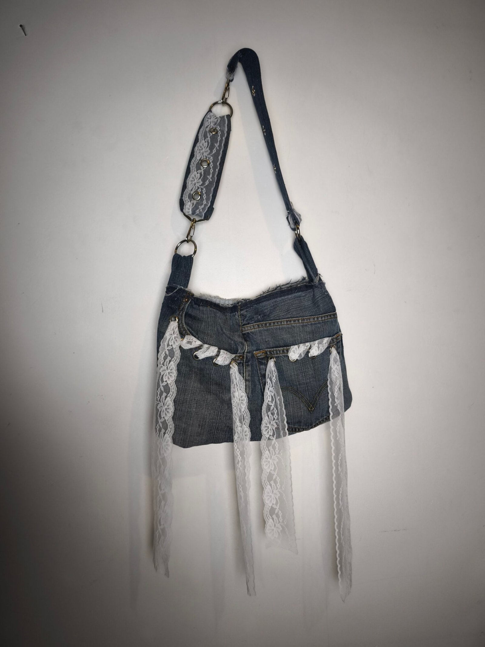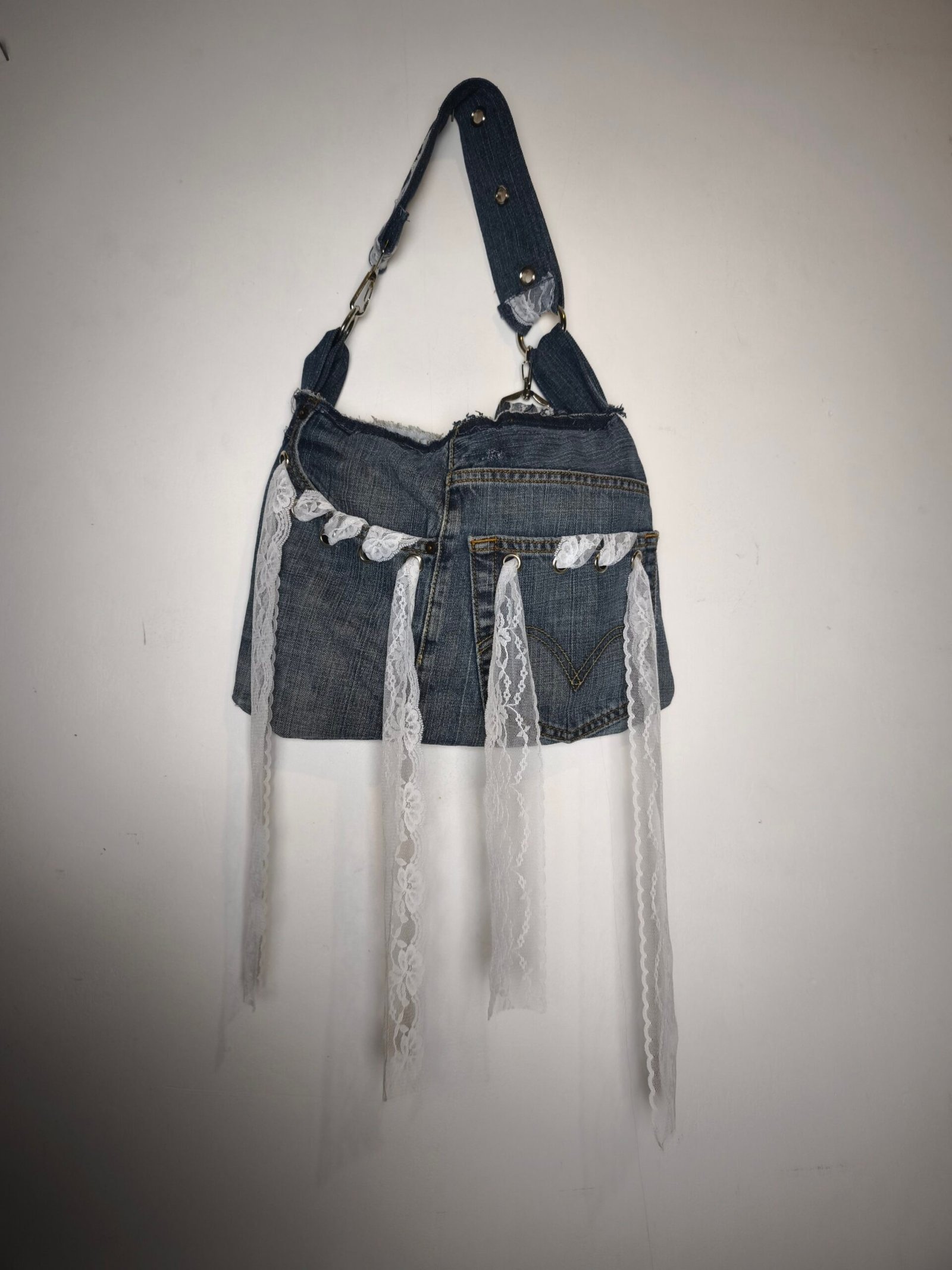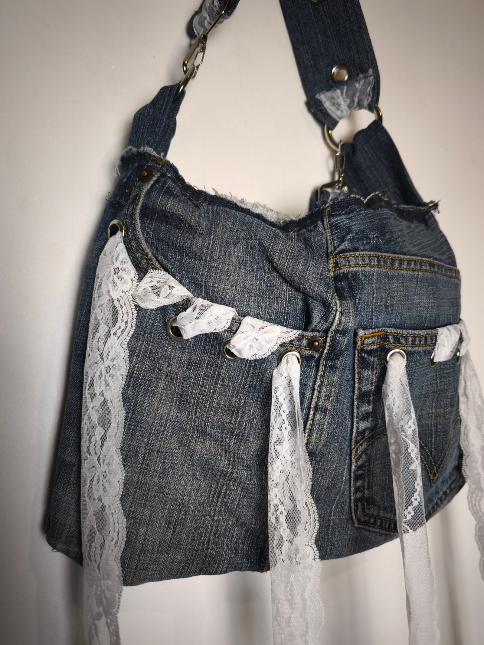 Sac en jean bleu avec bandes de dentelle et oeillets.