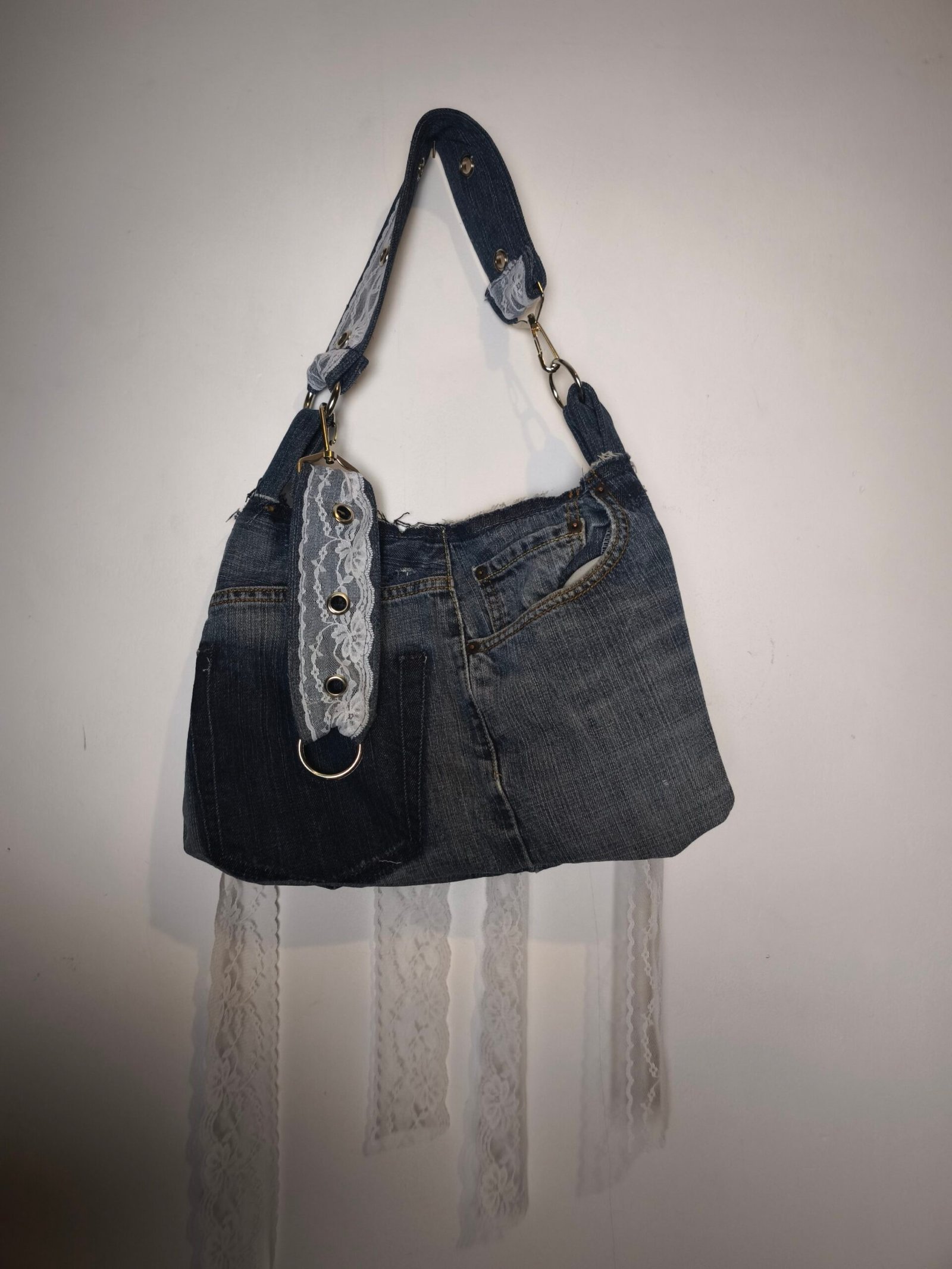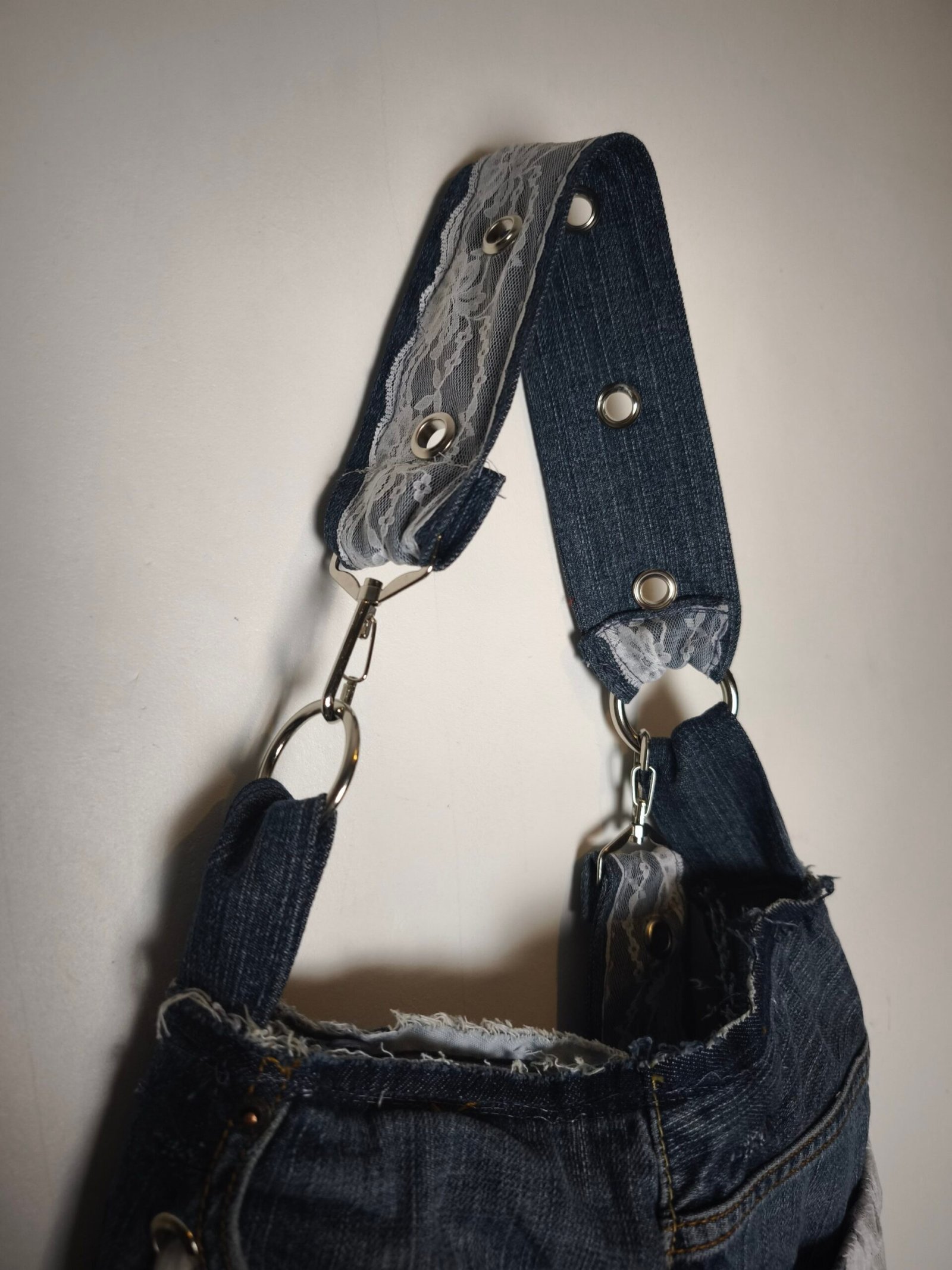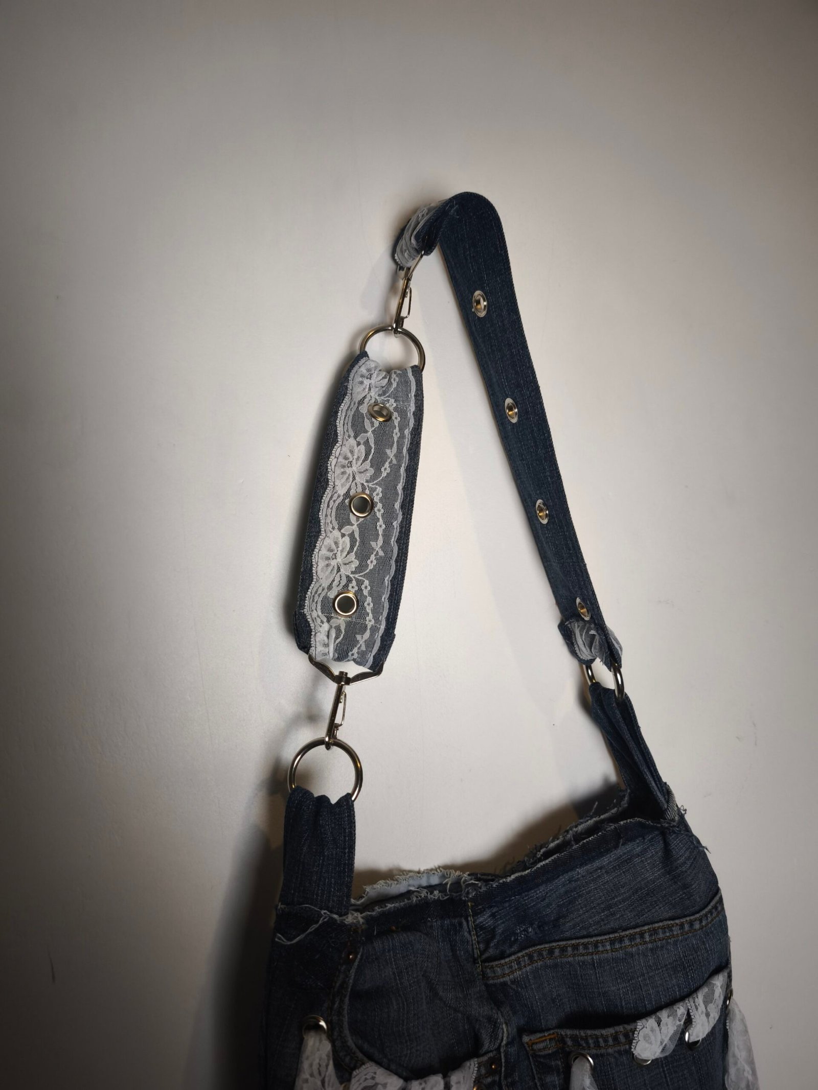 Sac en jean bleu avec bandes de dentelle et oeillets.