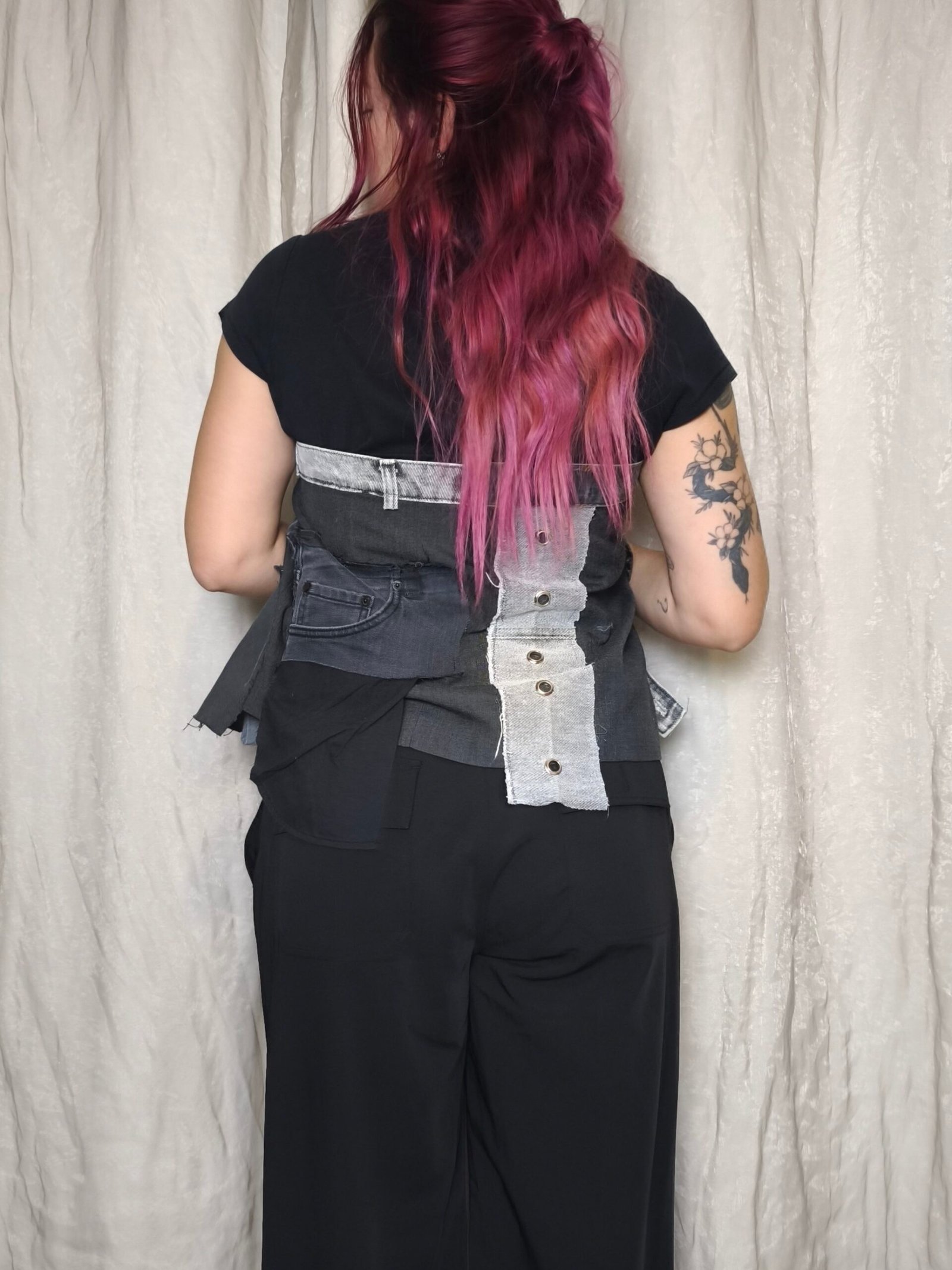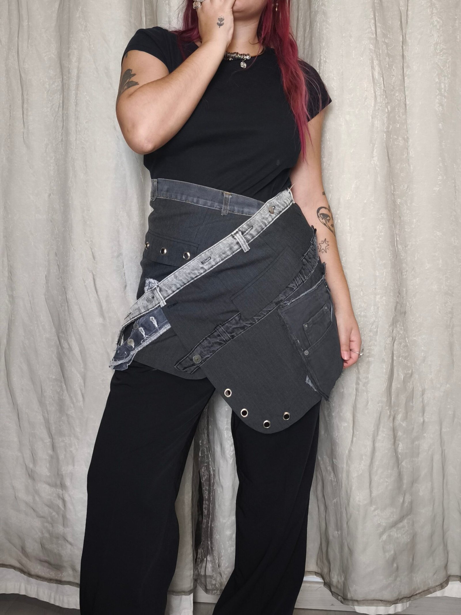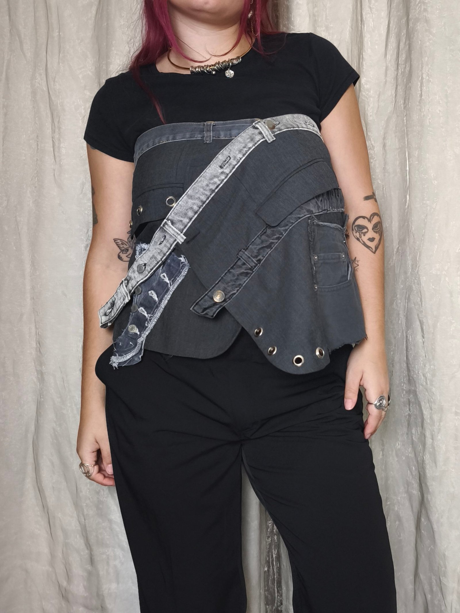 Buckle gris foncé, pièce de layering faite à partir du bas d’un blazer . Ajout d’empiècements en jean gris foncé et gris clair
