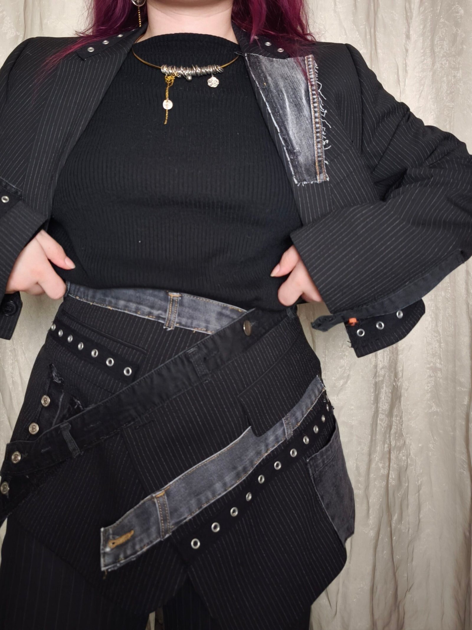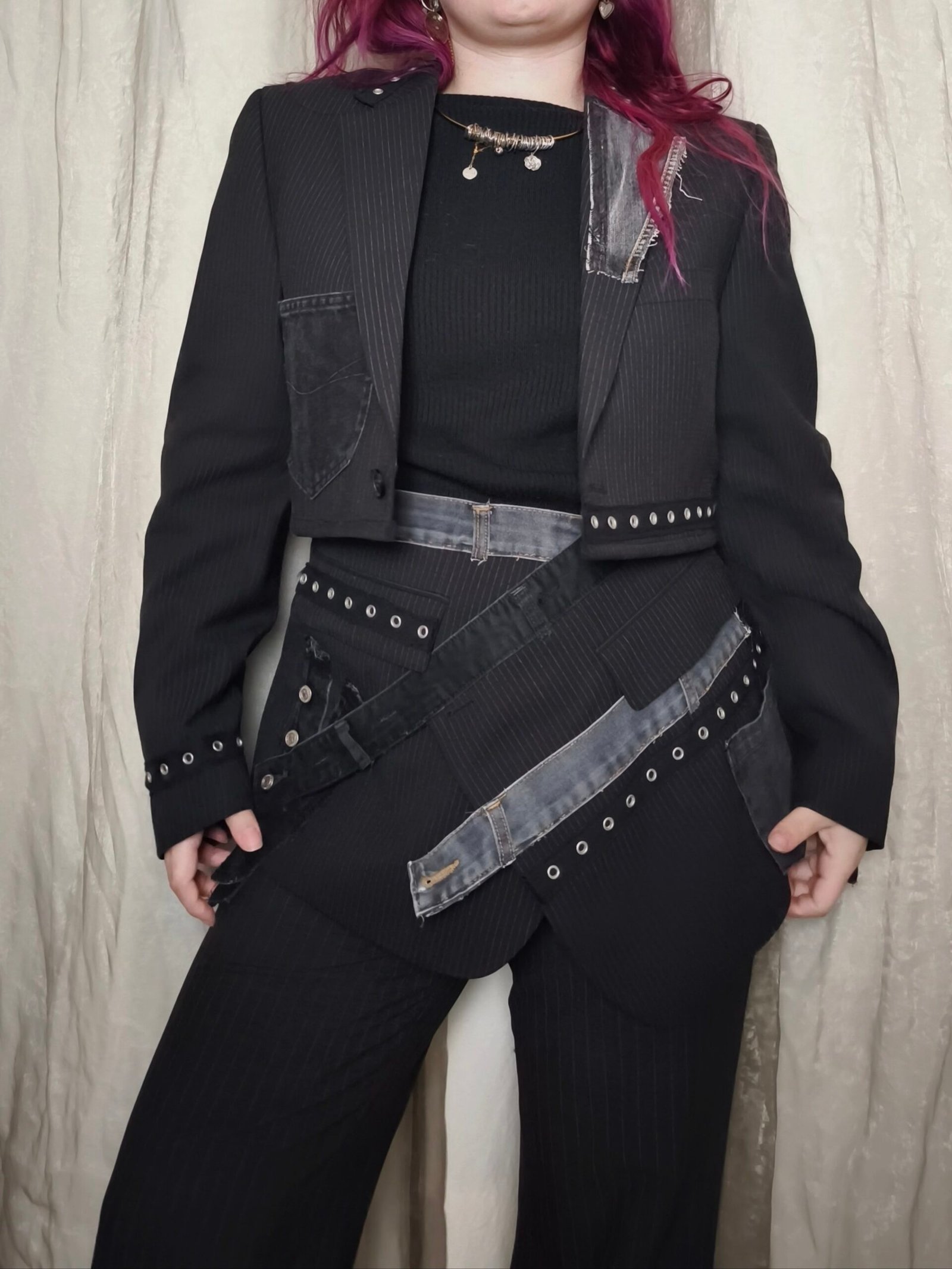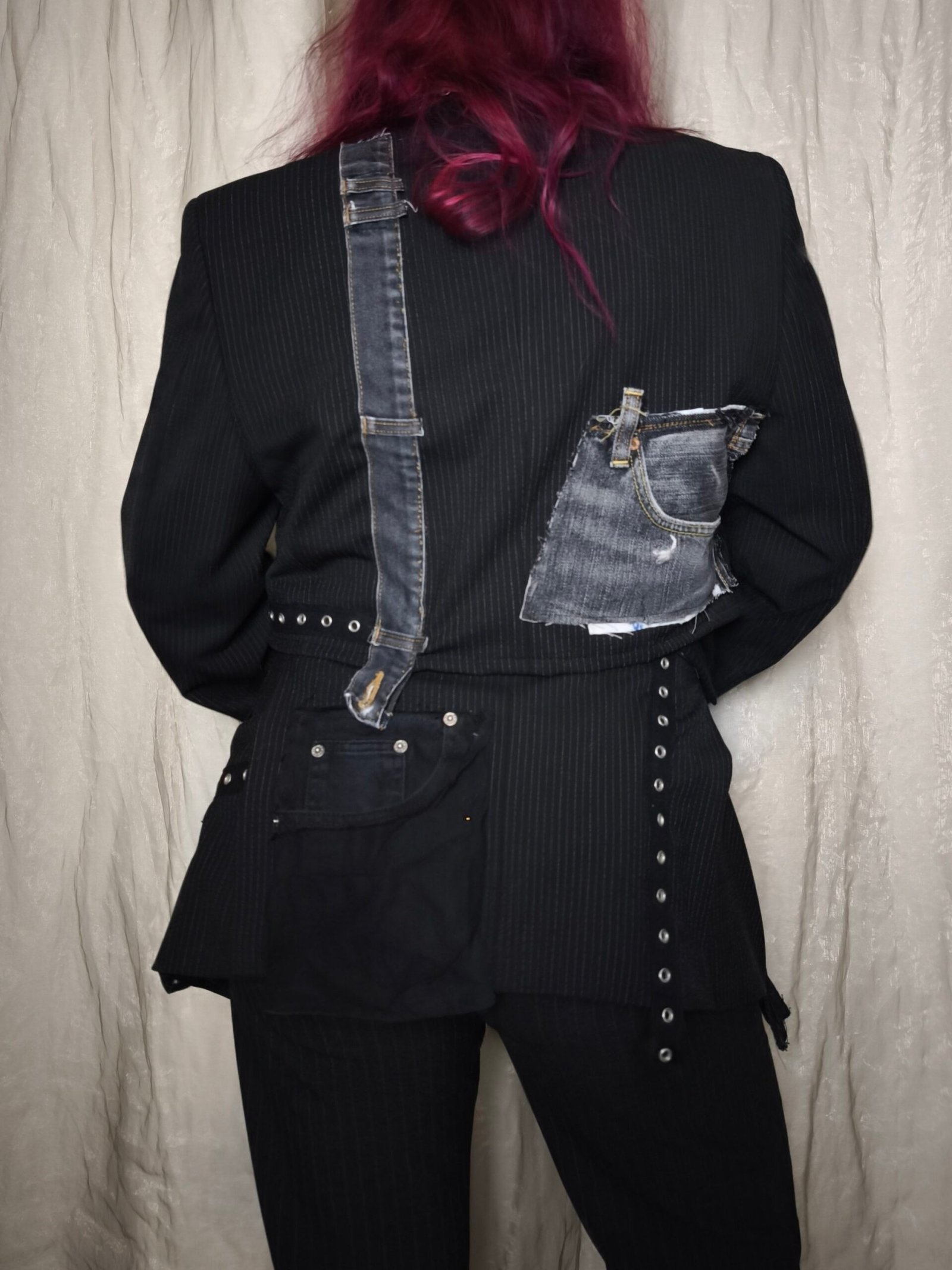 Ensemble blazer et Buckle (sur-jupe) rayé noir avec empiècement jean noir et oeillets