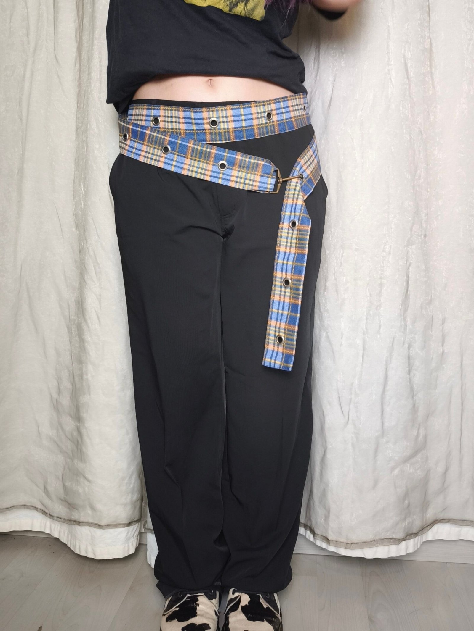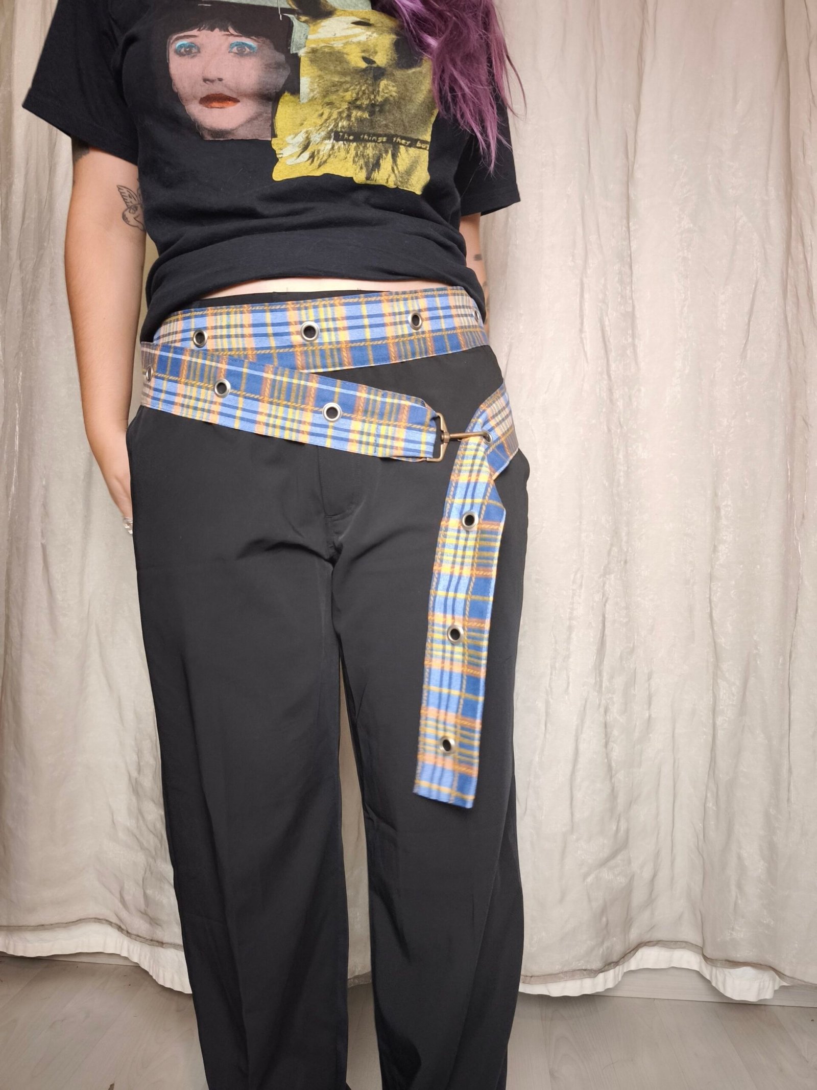 ceinture tartan bleu et orange double avec oeillets et attache type mousqueton