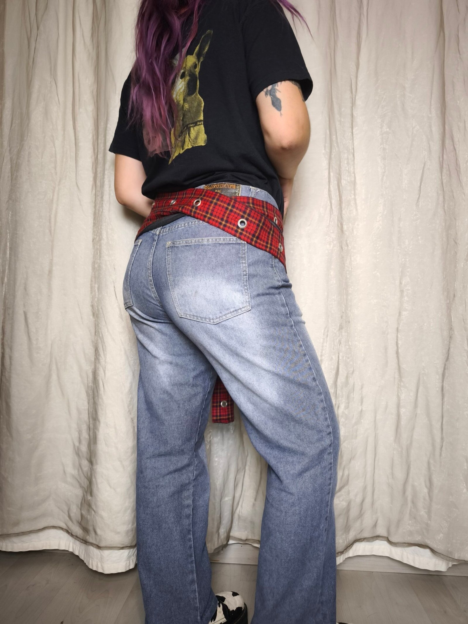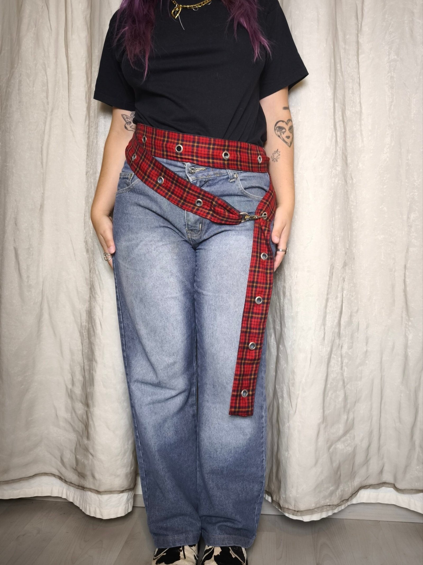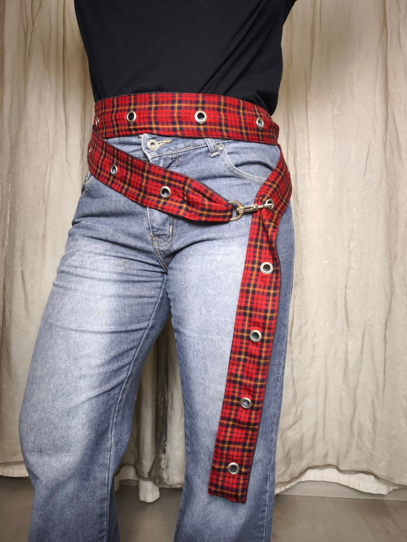 ceinture tartan rouge et doublure en jean noir double avec oeillets et attache type mousqueton