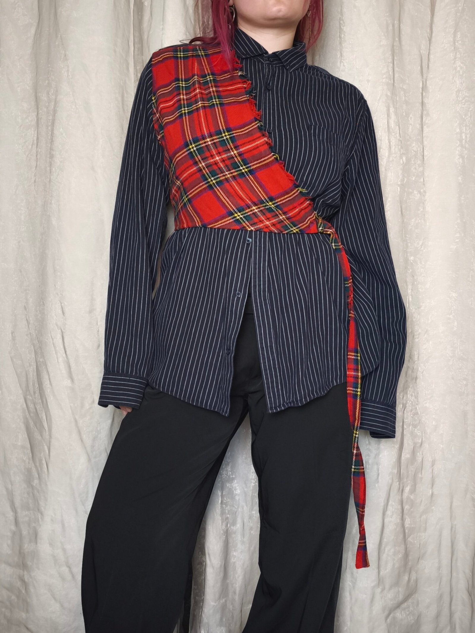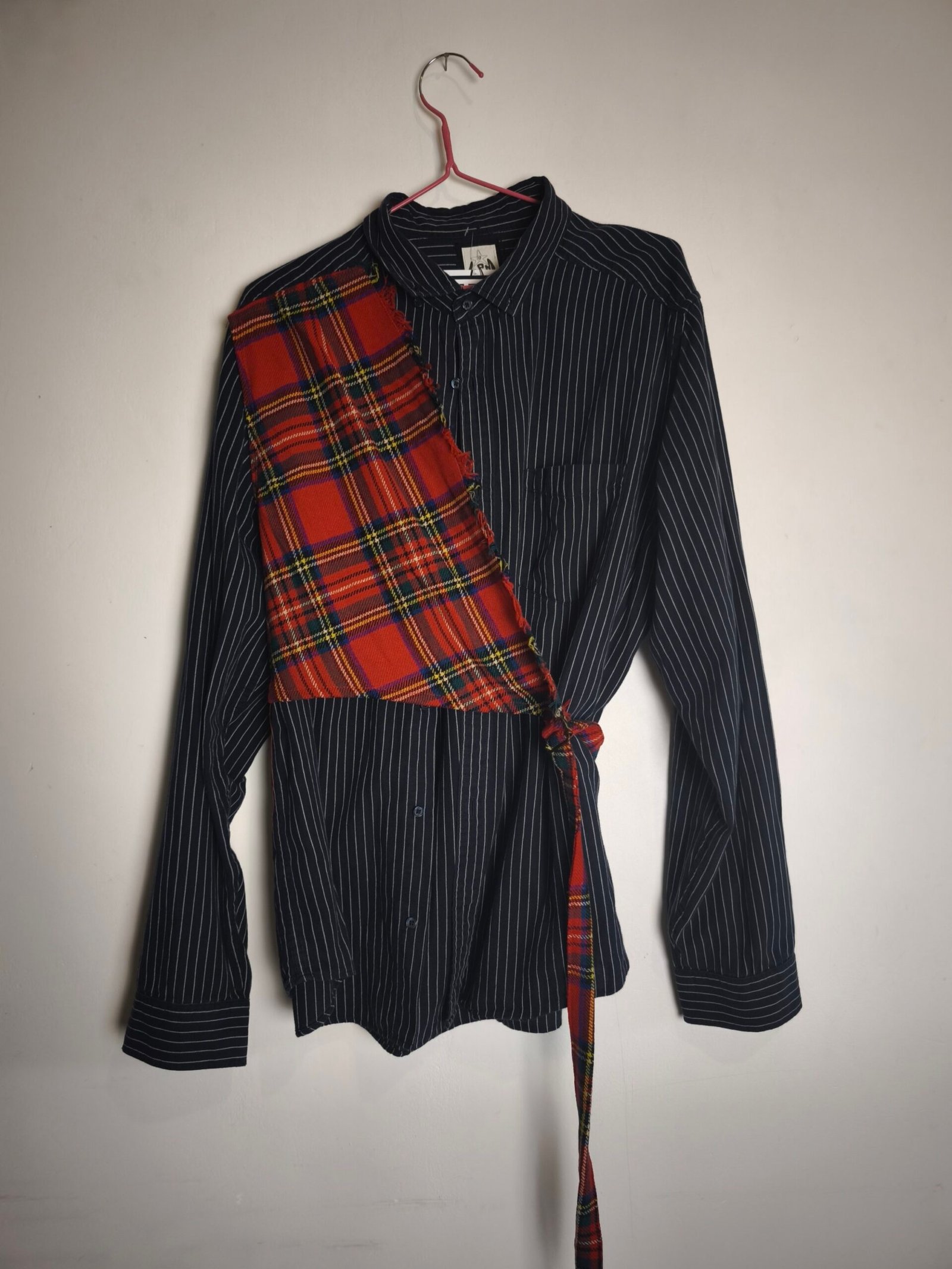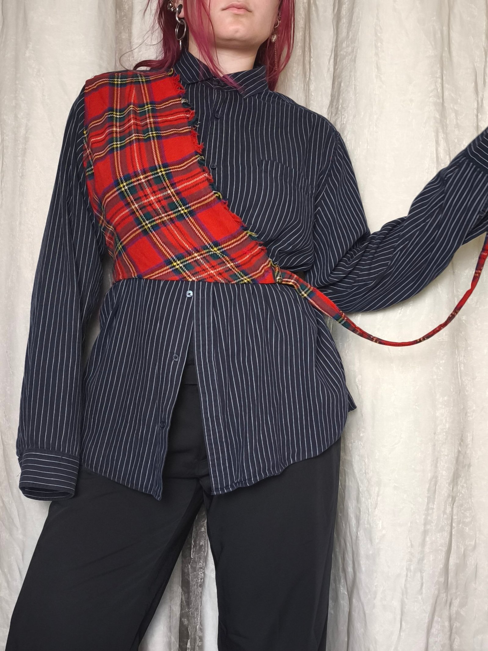 Chemise rayée noir avec empiècement tartan sur le devant.