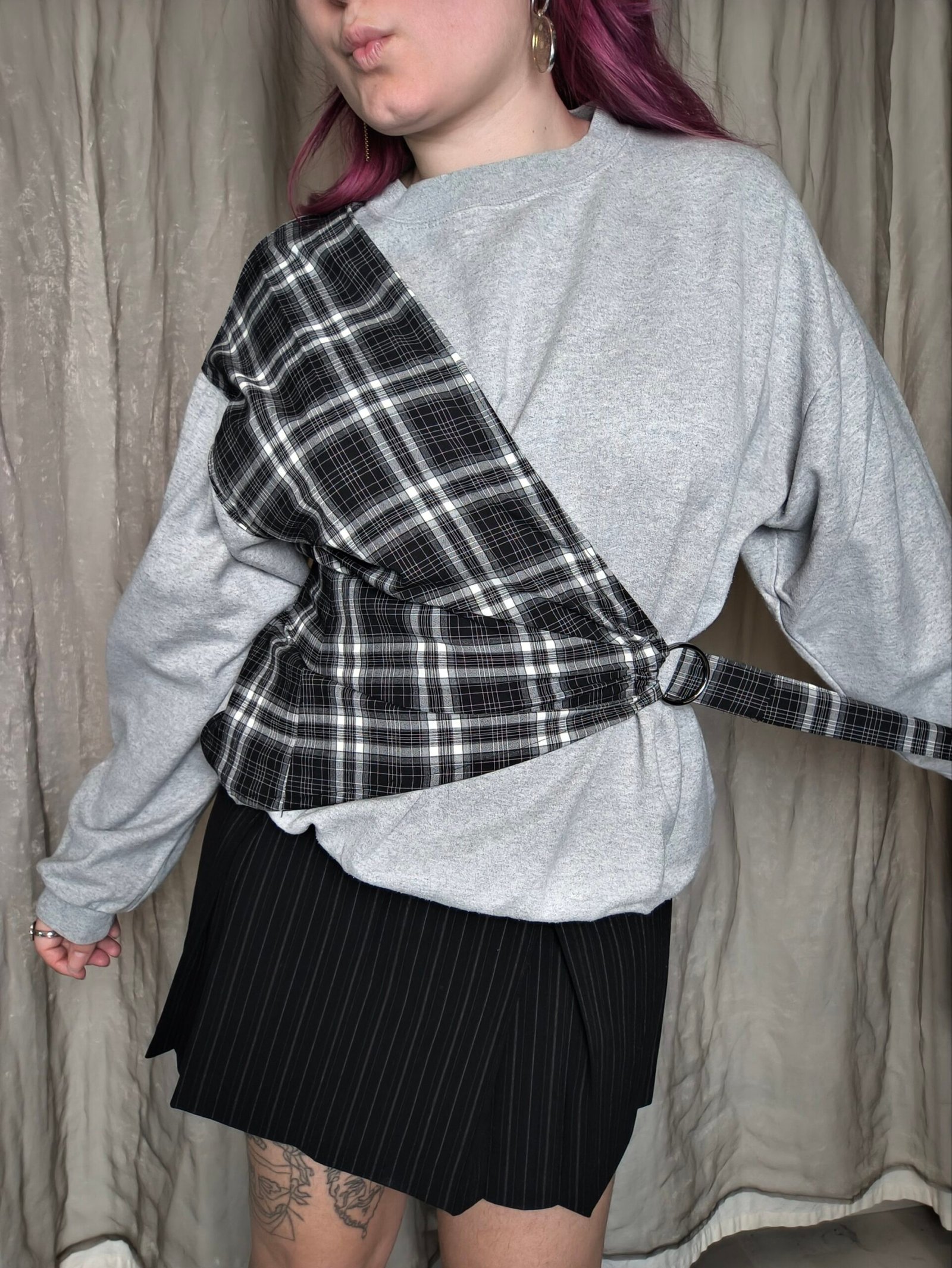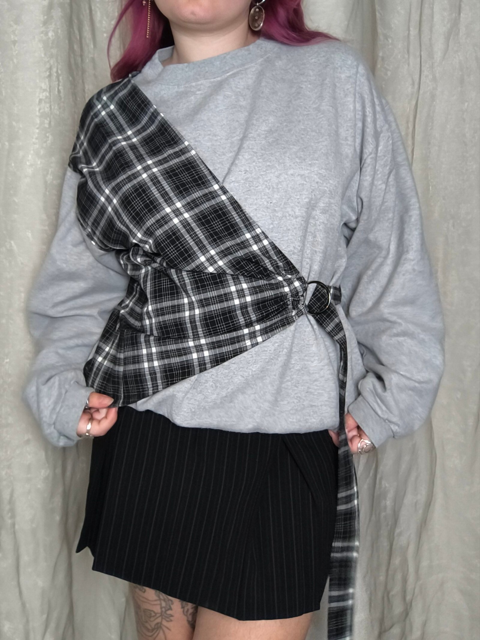 Sweat gris avec empiècement tartan et ceinture pour recintrer