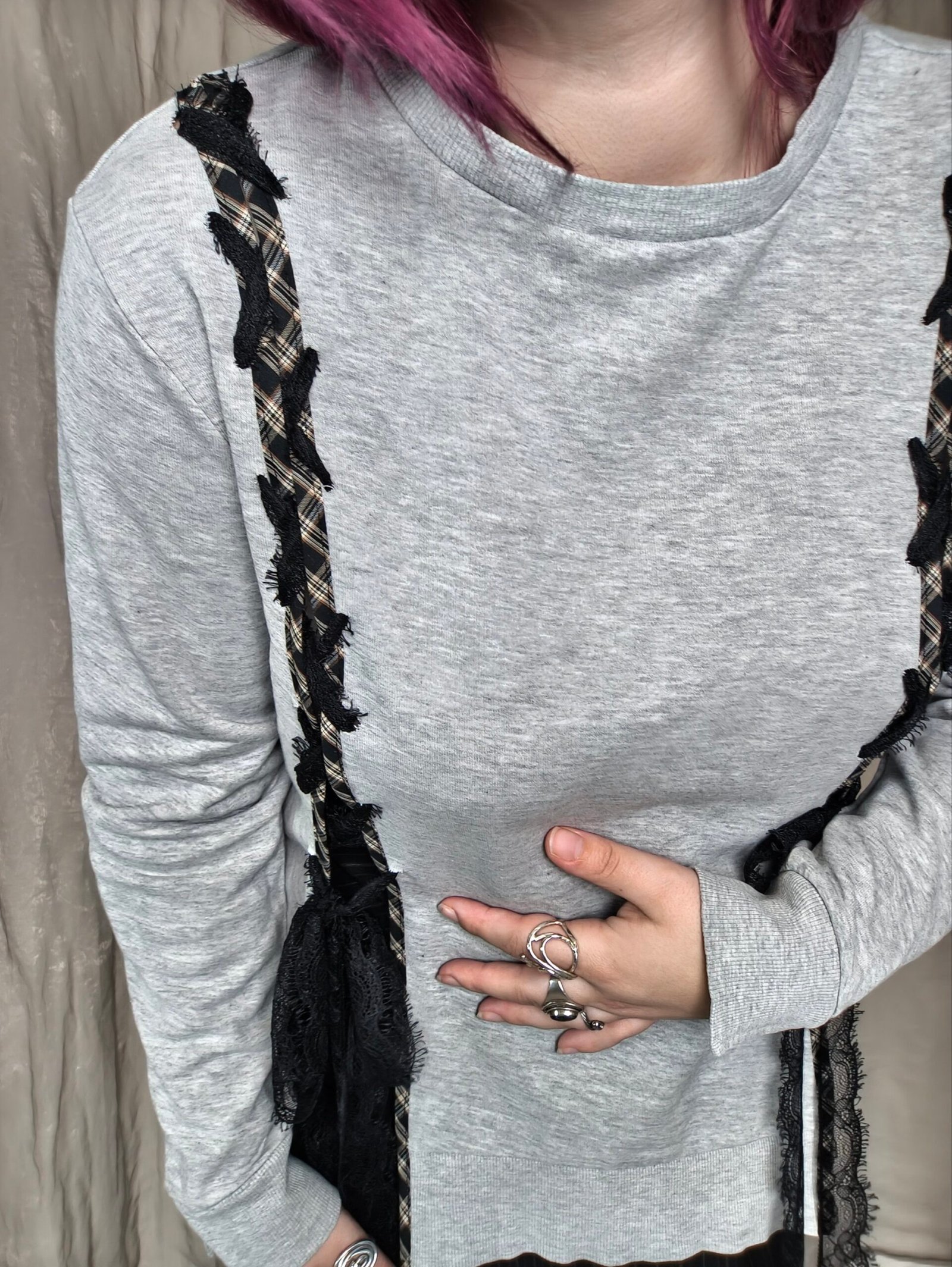 Sweat gris avec laçage en dentelle et tartan noir