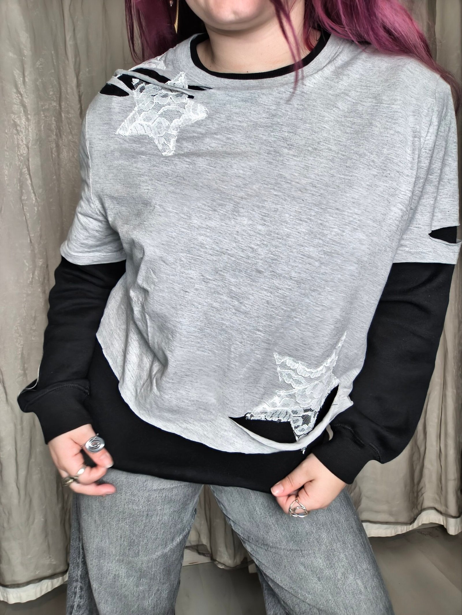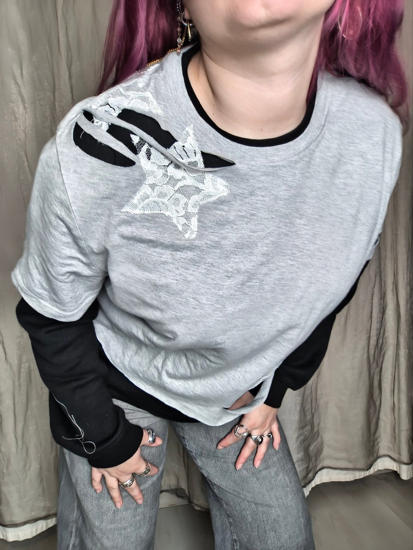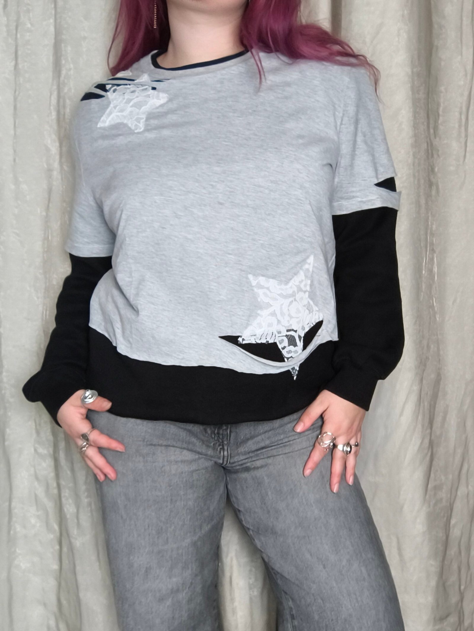 Sweat noir avec Tshirt gris en empiècement et étoile en dentelle blanche