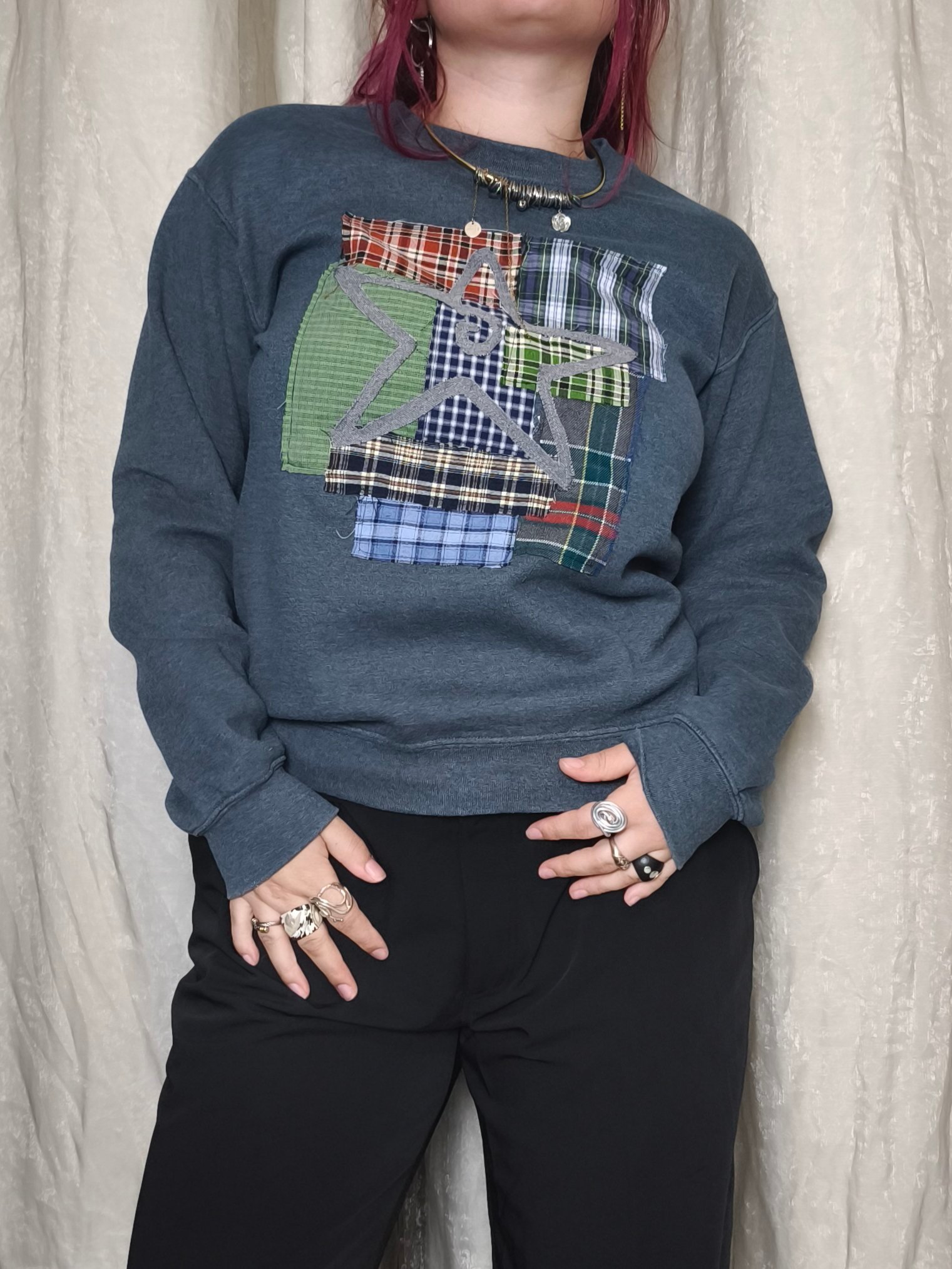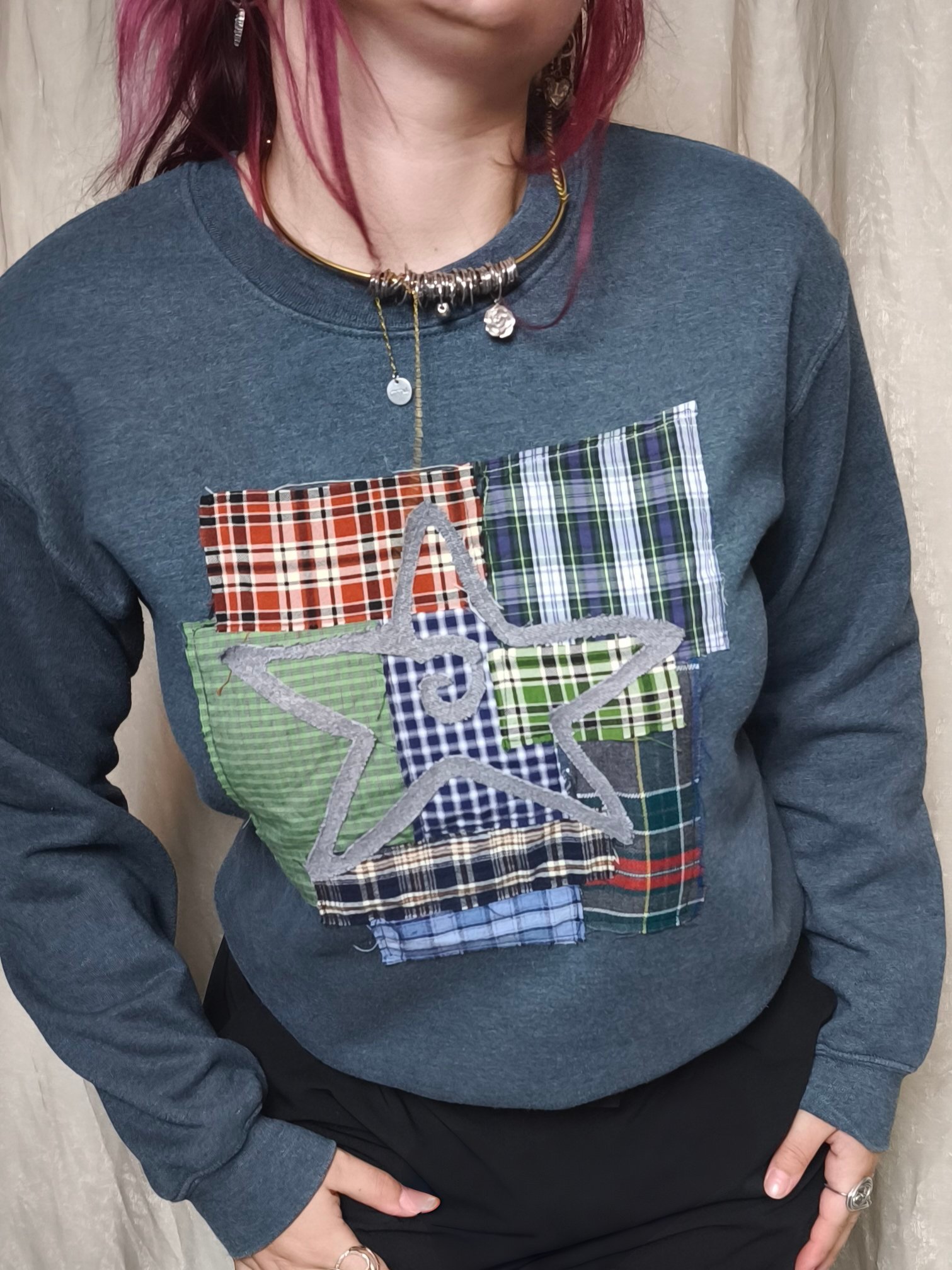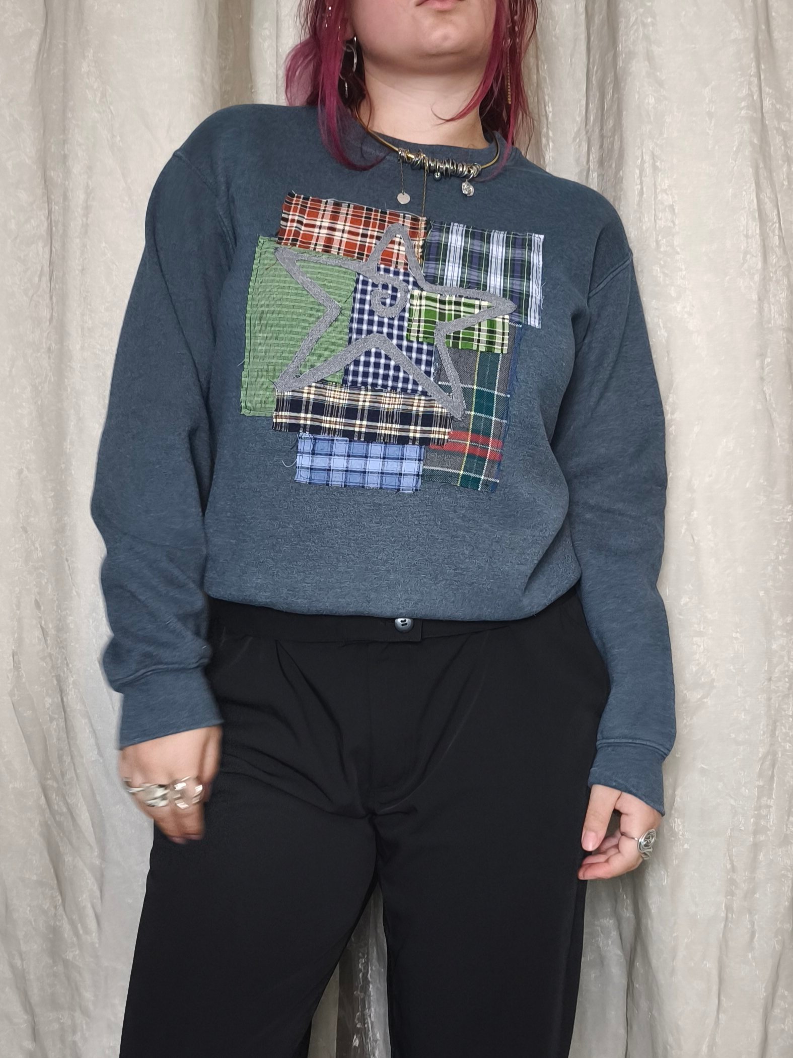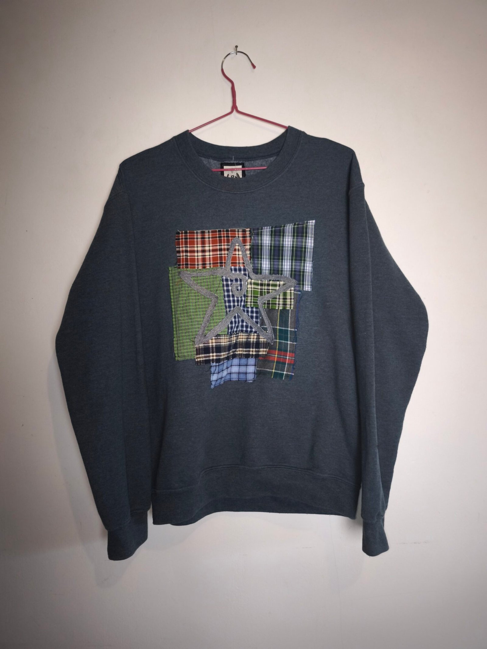 Sweat bleu gris avec empiècement tartan et étoile LPM