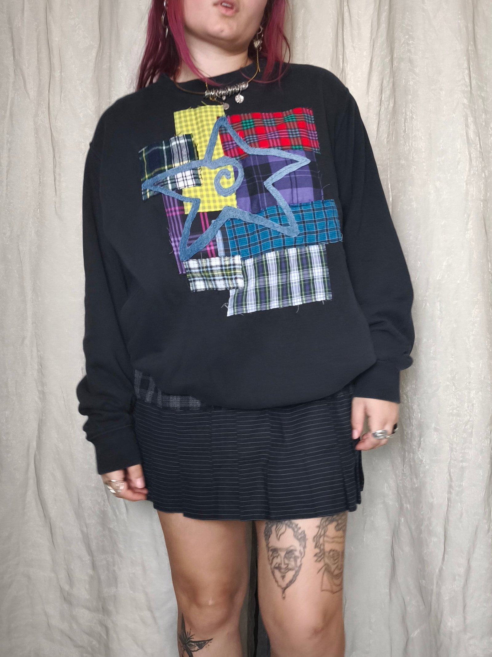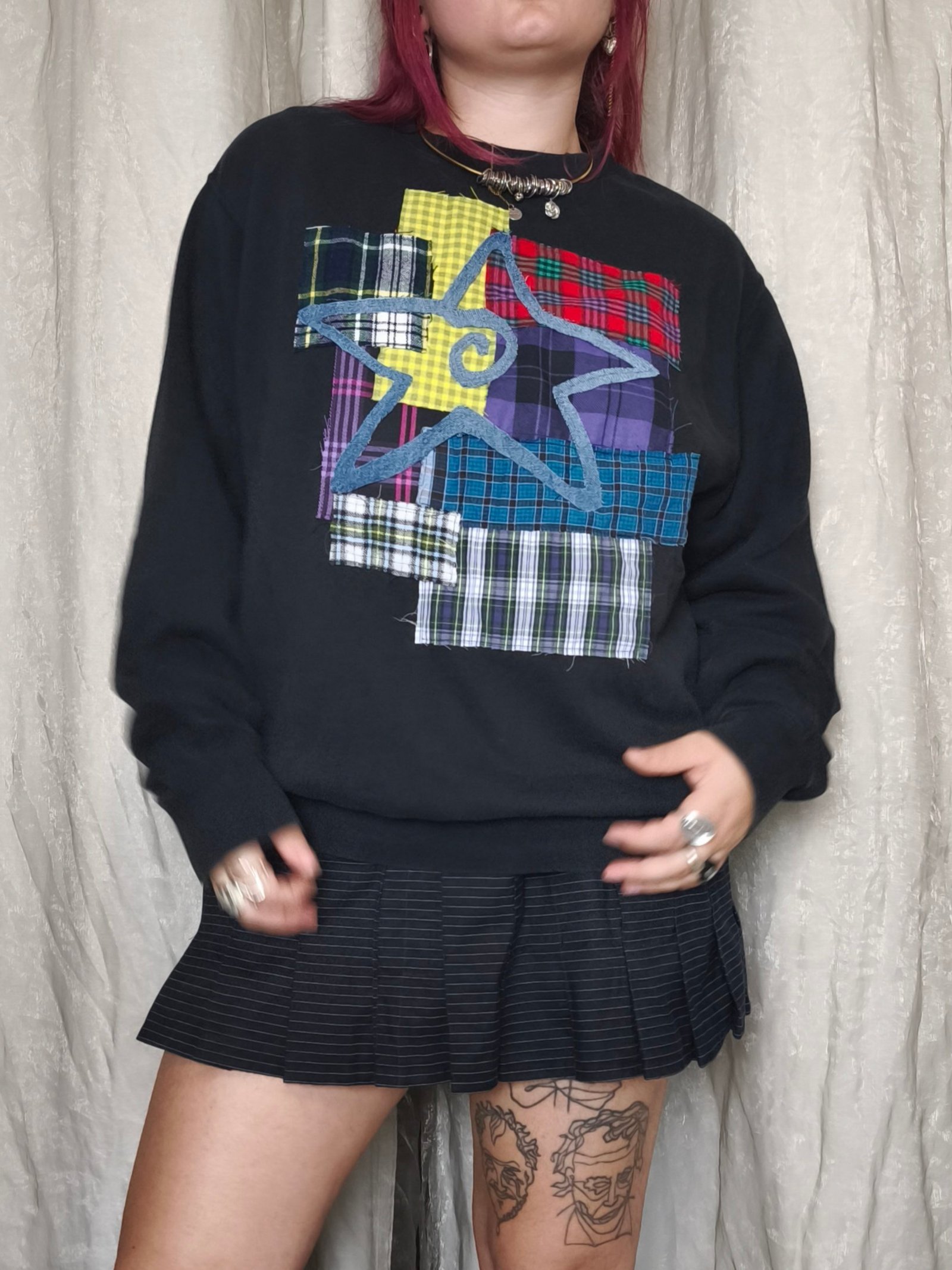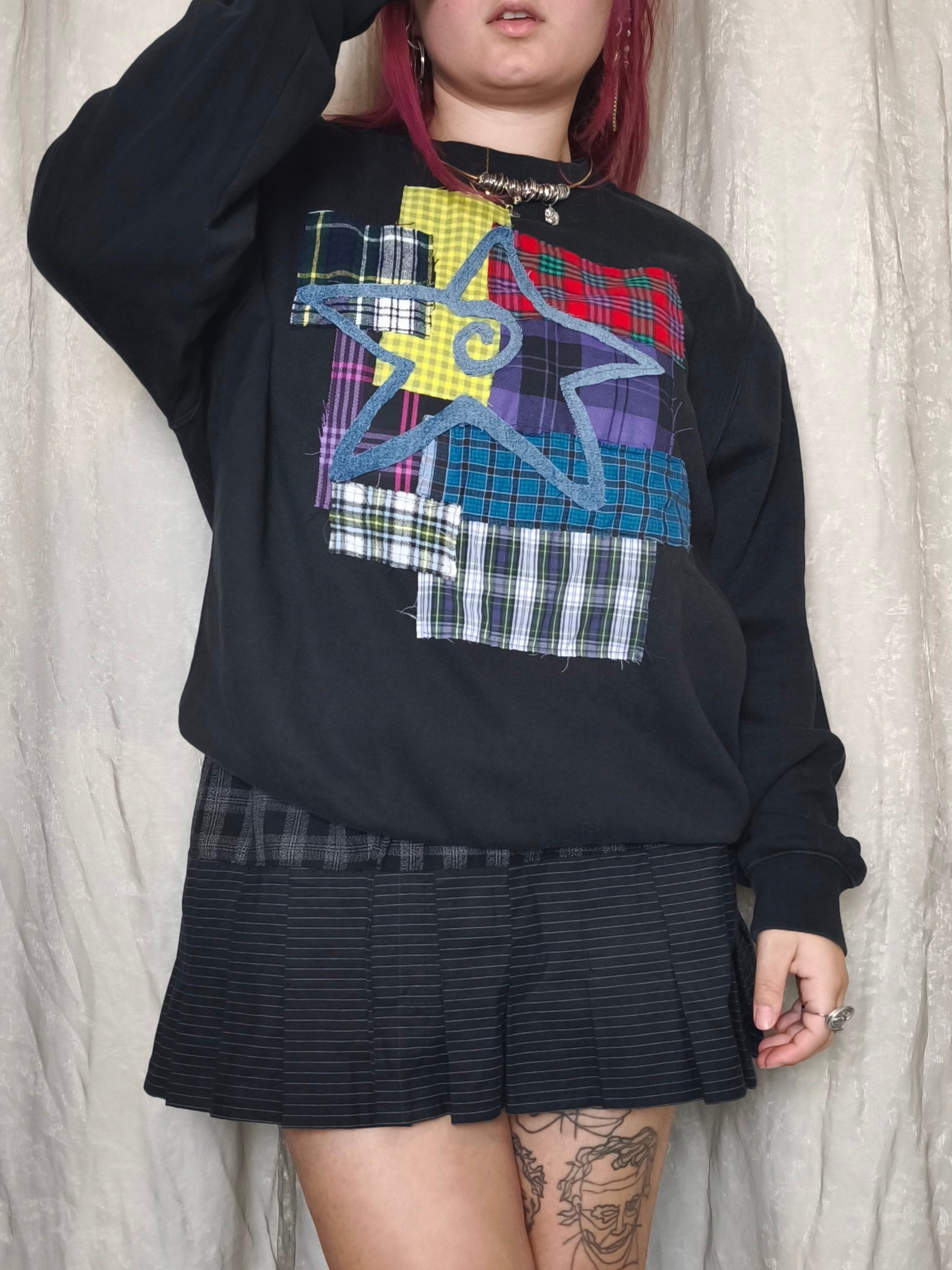 Sweat noir avec empiècement tartan multicolore et étoile en jean LPM