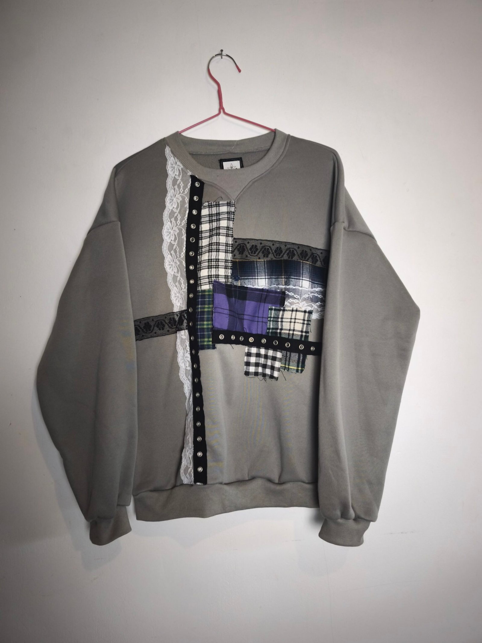 Sweat kaki avec empiècement tartan et dentelle.