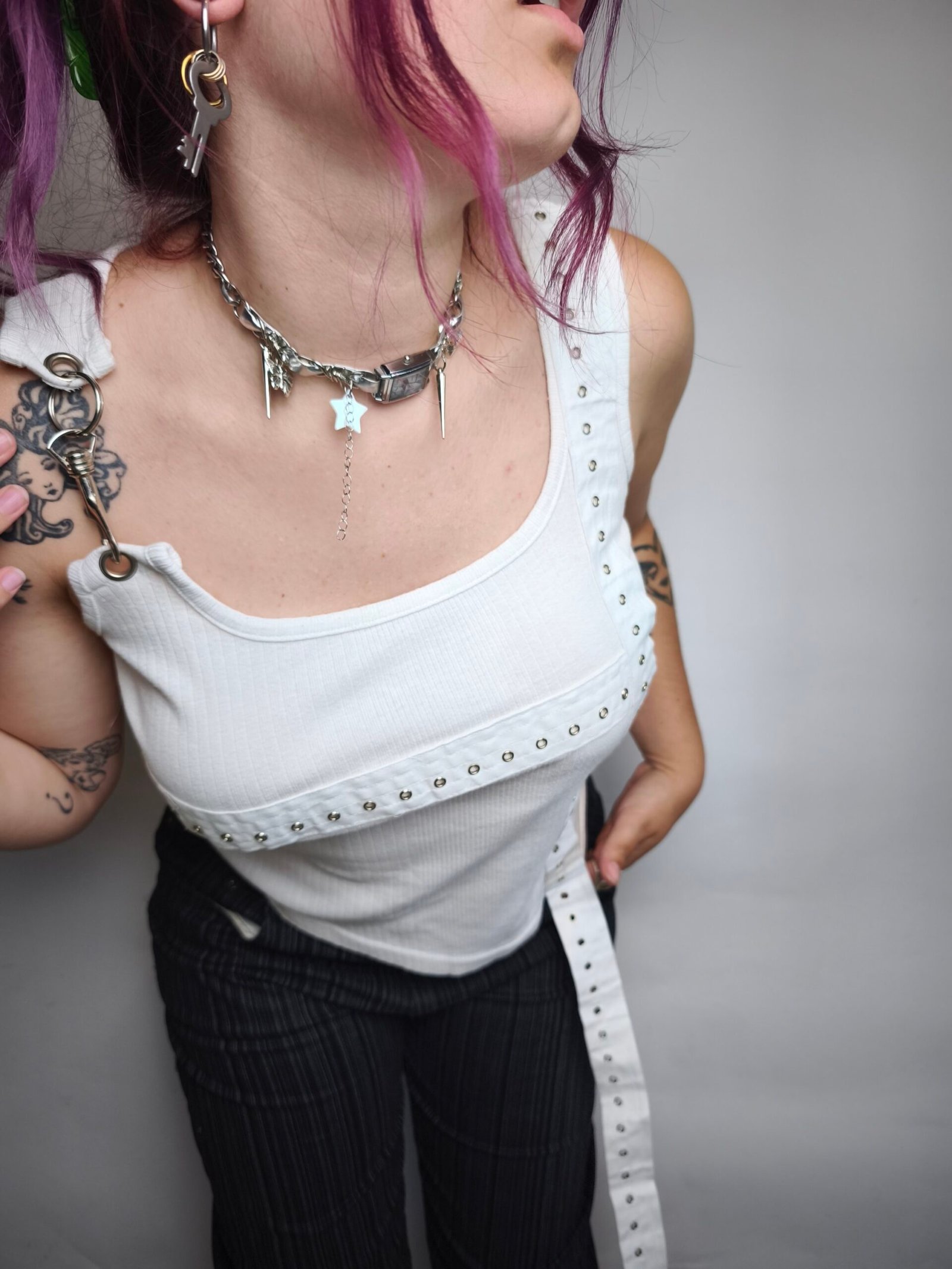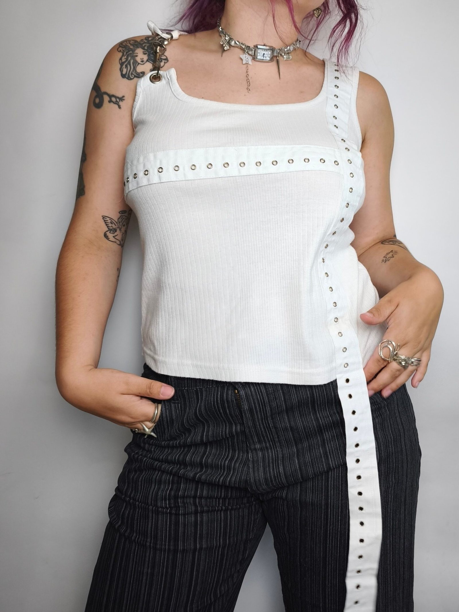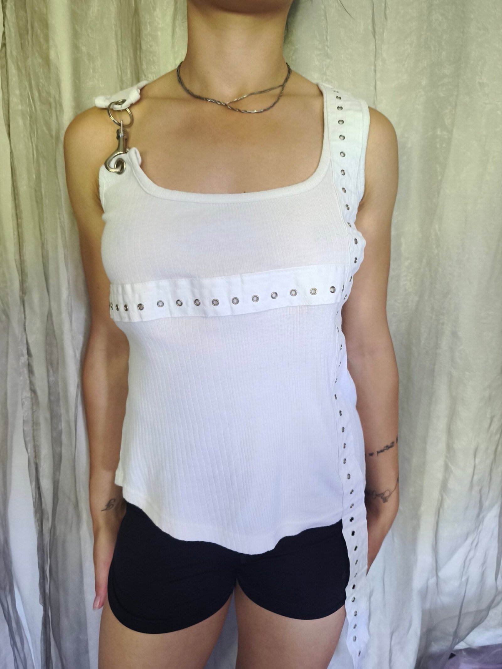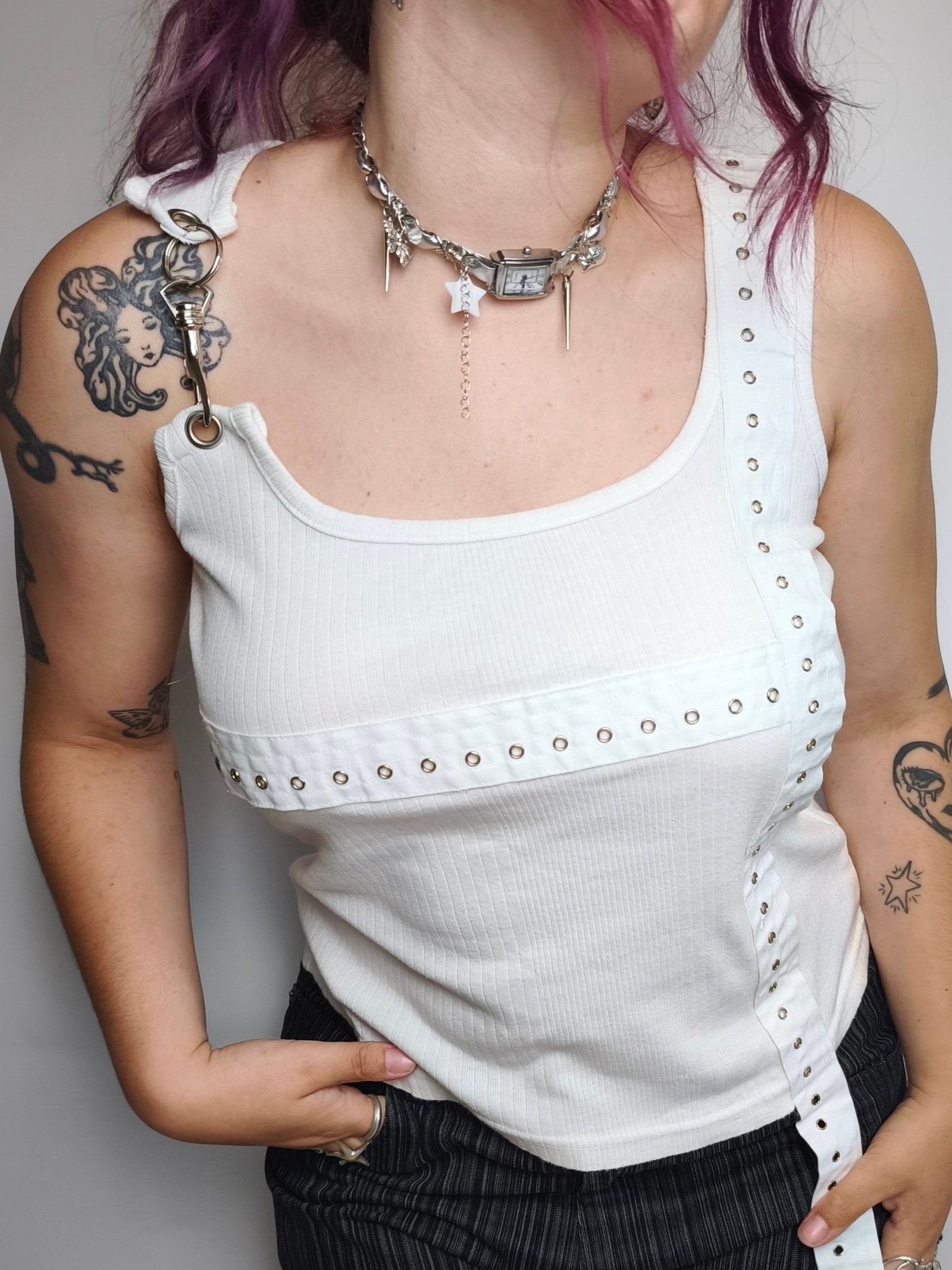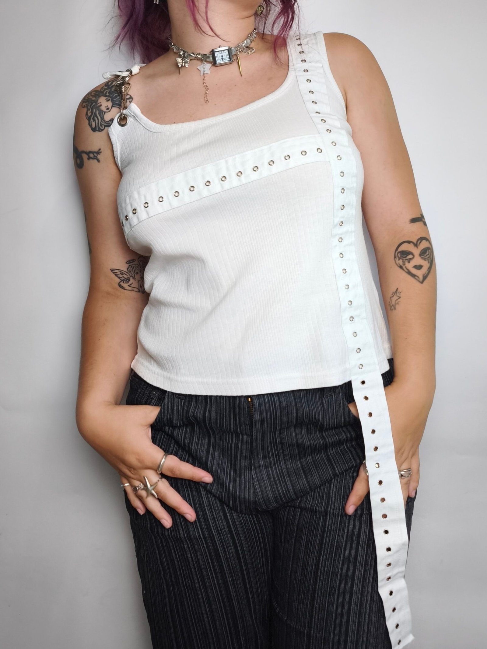 débardeur blanc avec oeillets et attache sur la bretelle et bande d’oeillets sur le devant.
