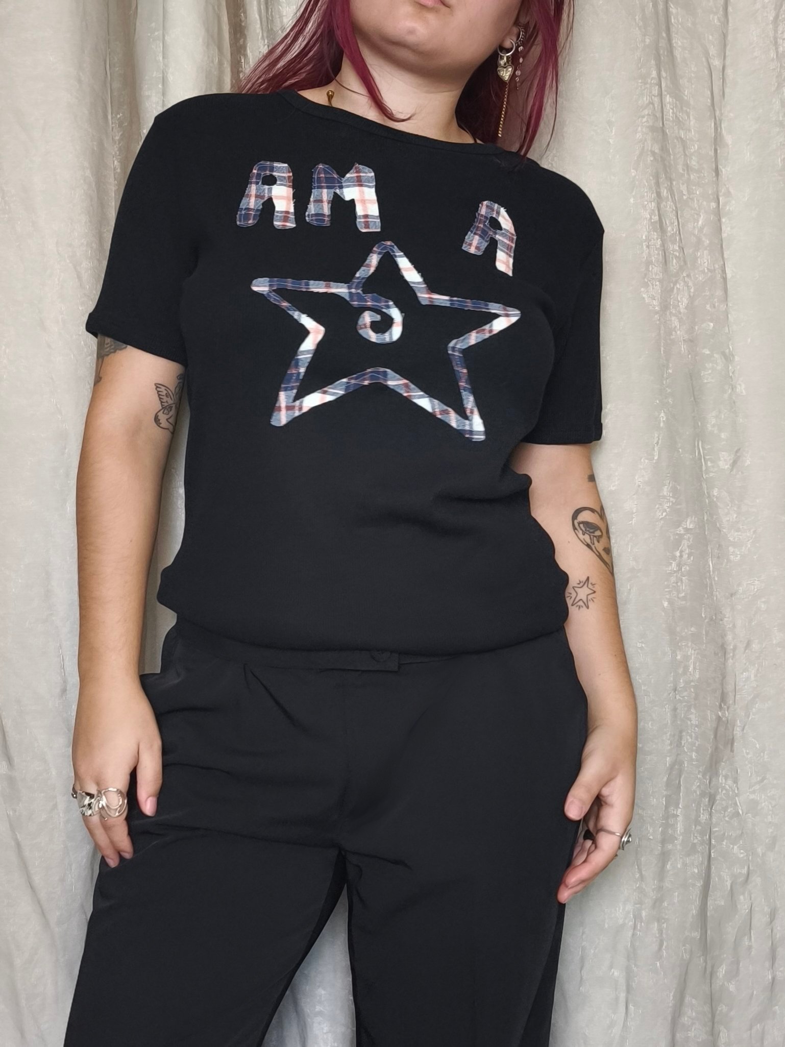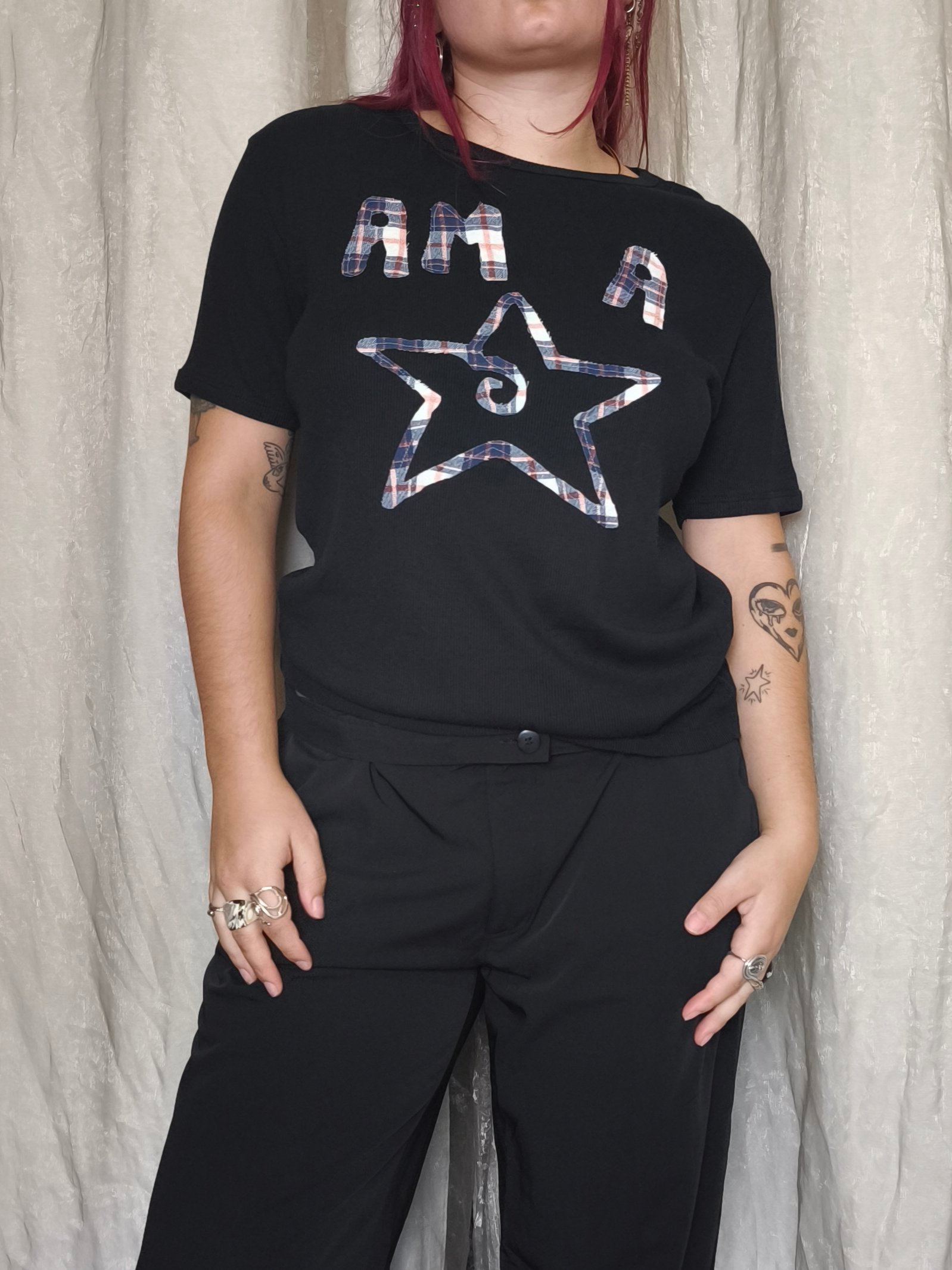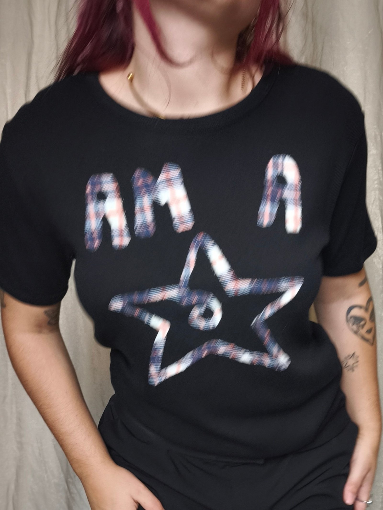 Tshirt noir rayé avec écriture « am a star » en tartan.