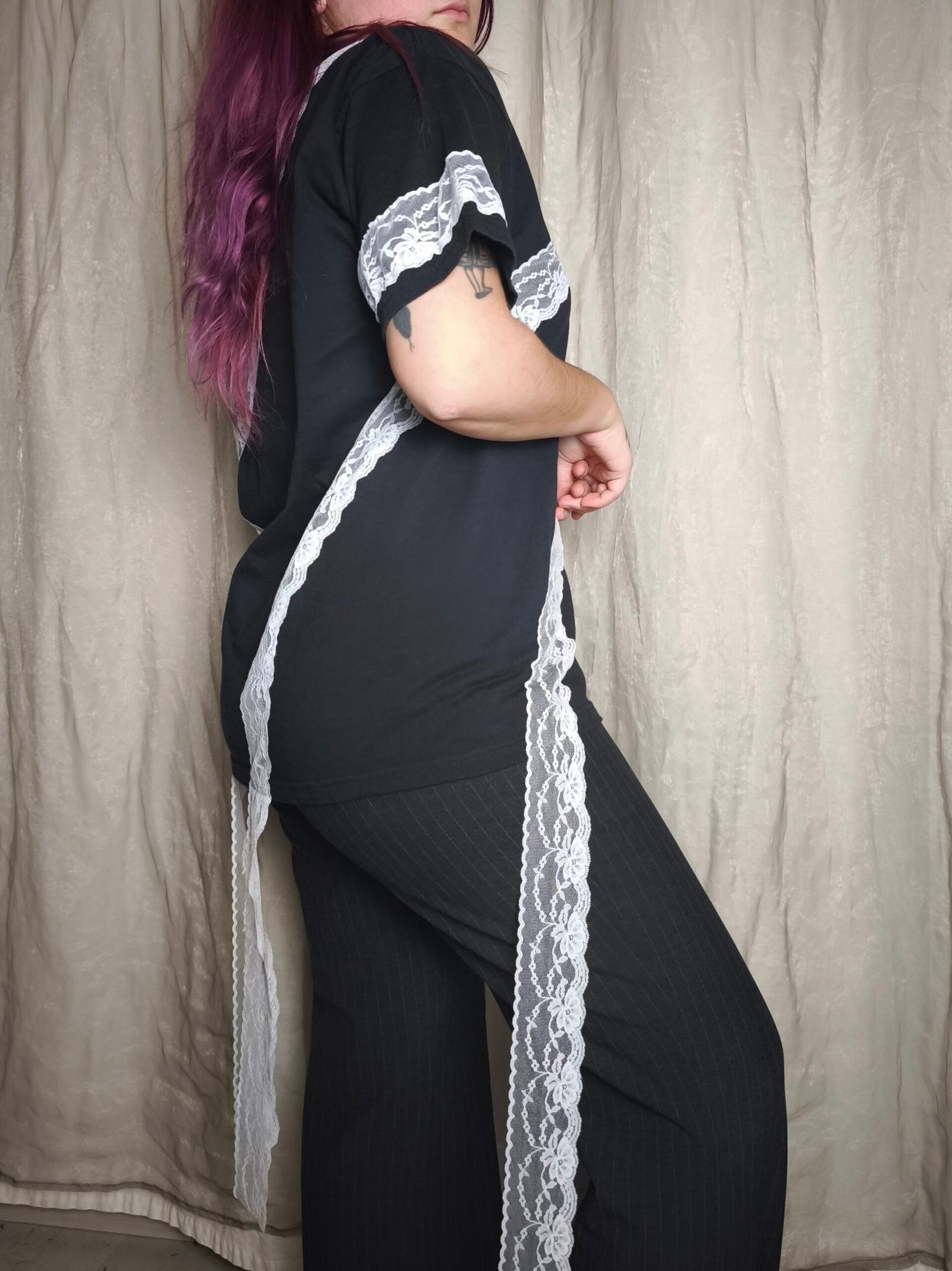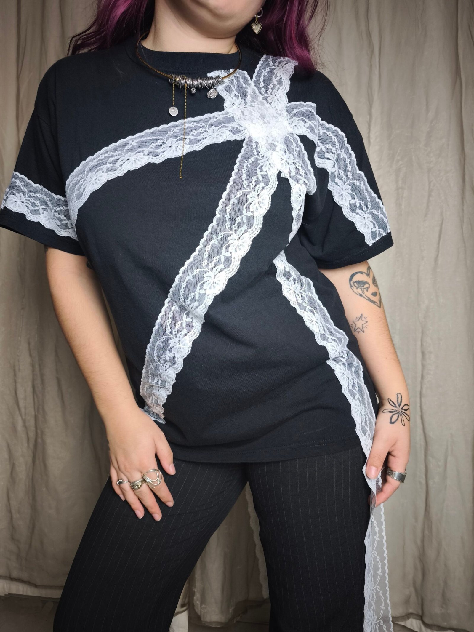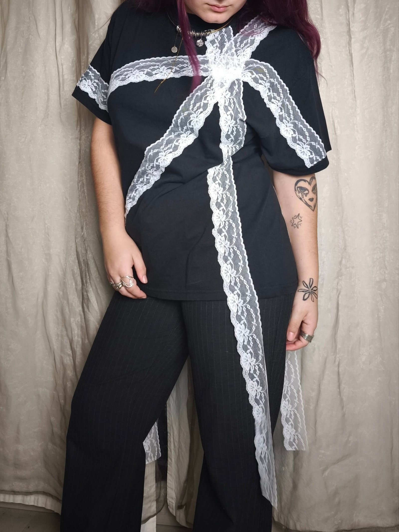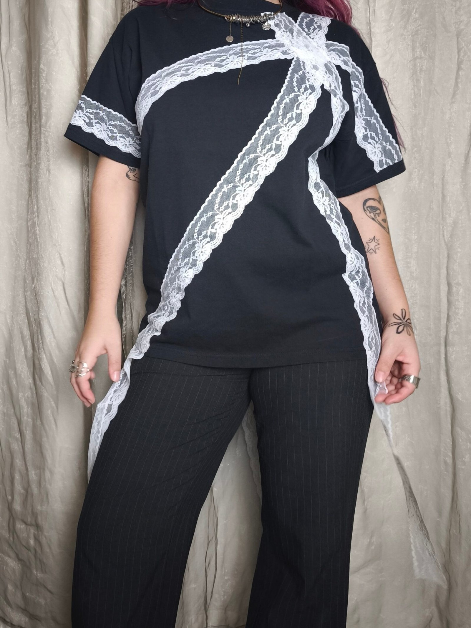 Tshirt noir avec dentelle pendant du Tshirt sur le devant et le dos.