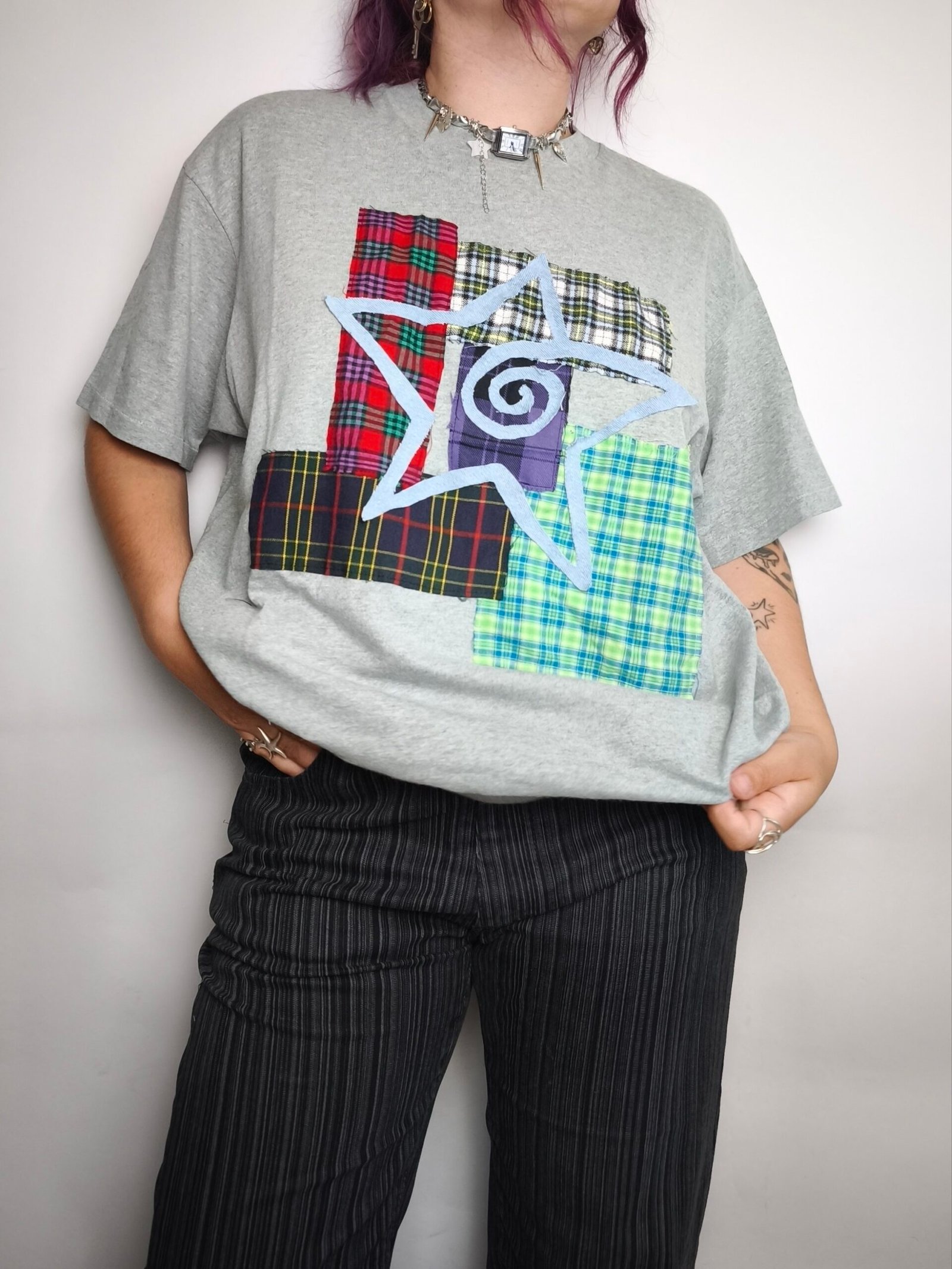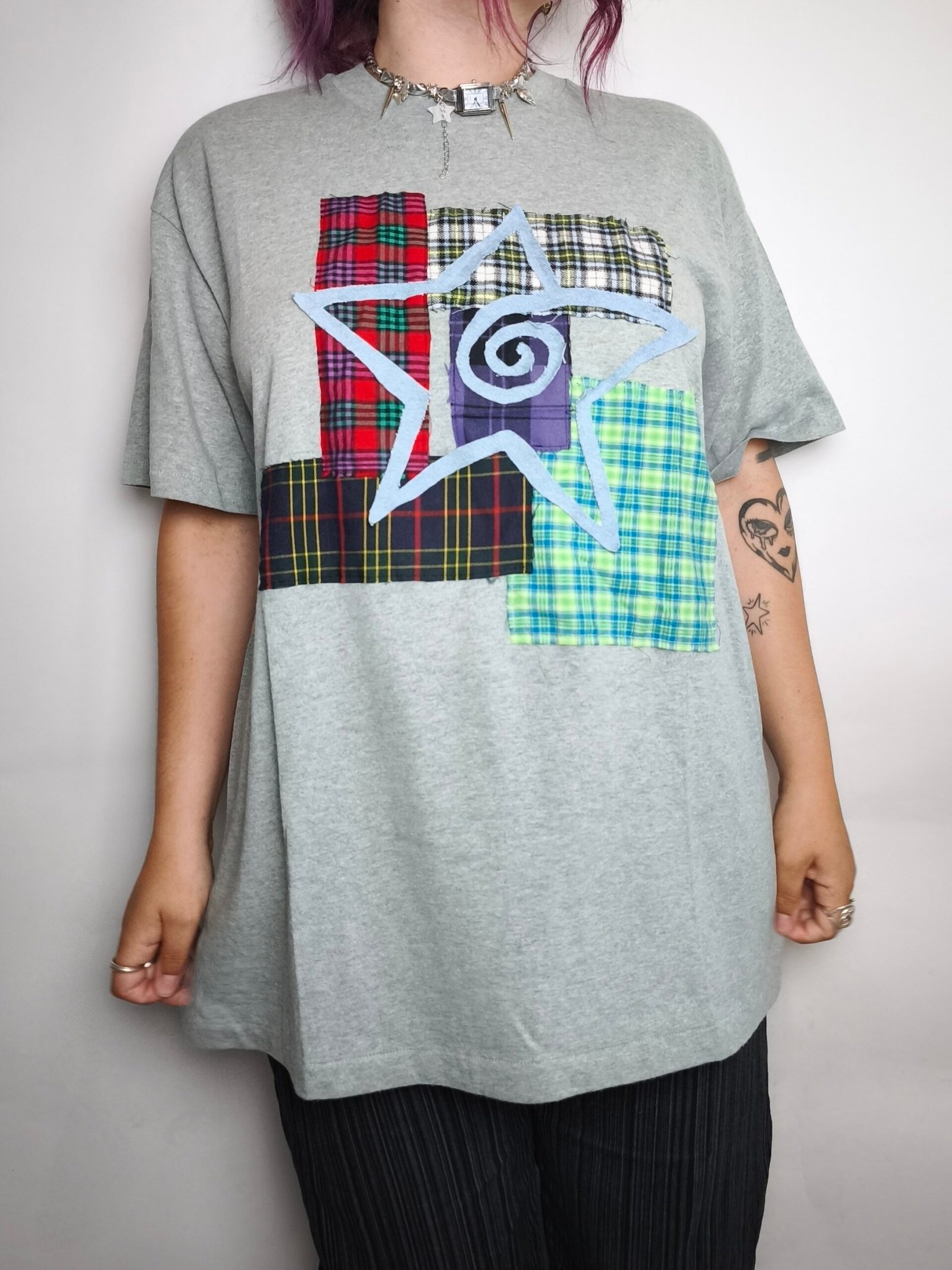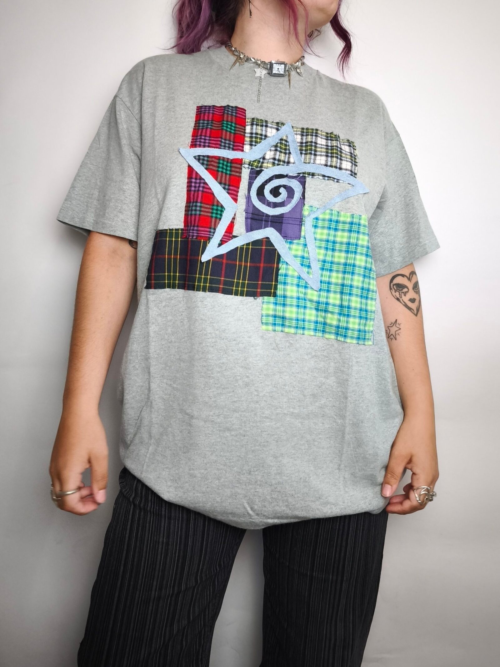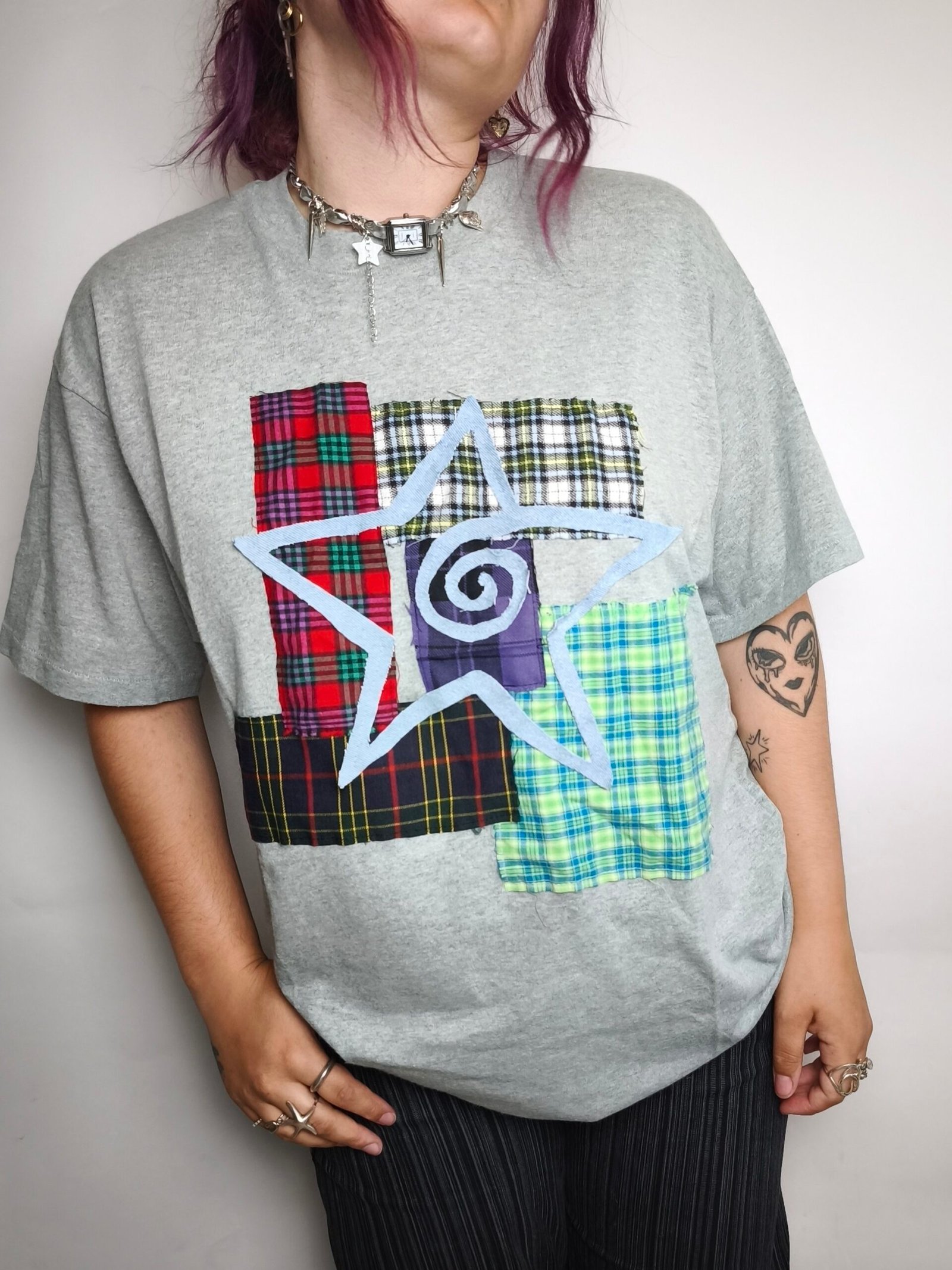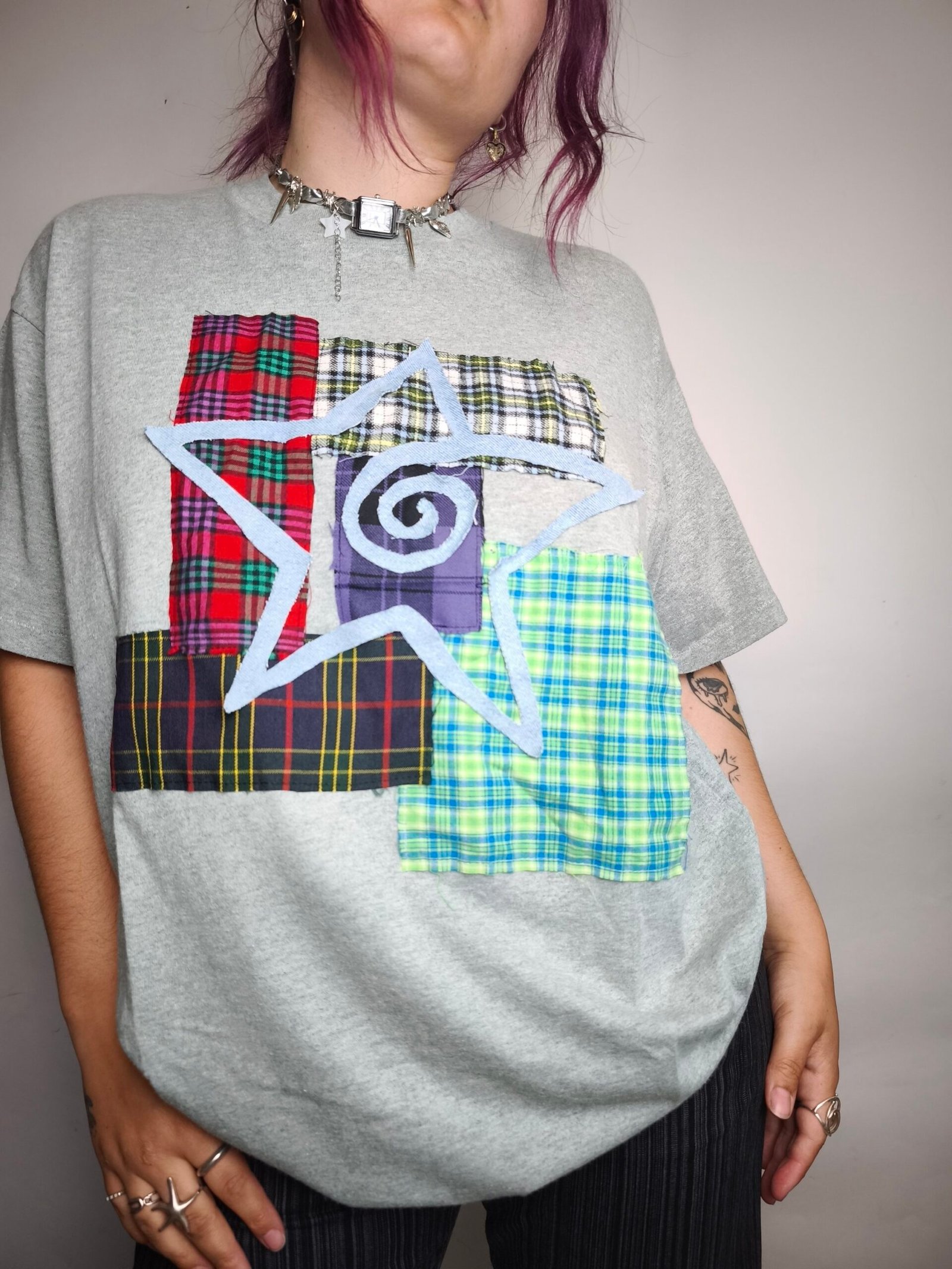 Tshirt gris avec patchwork de tartan et étoile en Jean bleu.