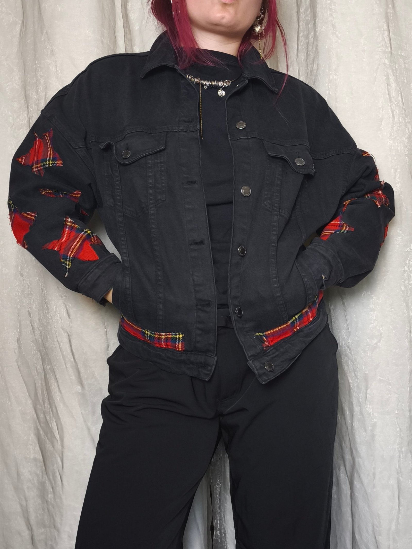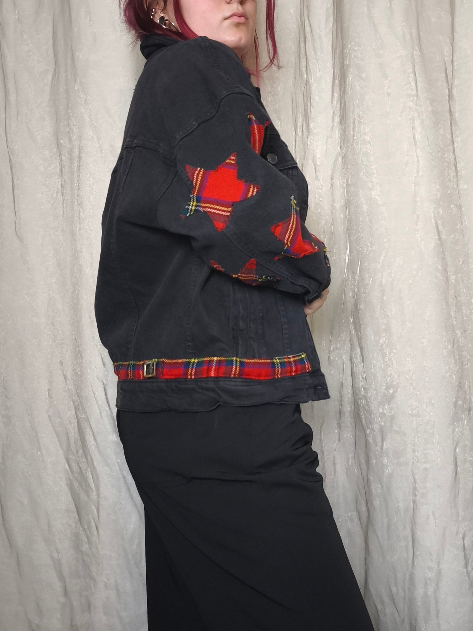 Veste en jean noir avec empiècement étoile en tartan rouge.