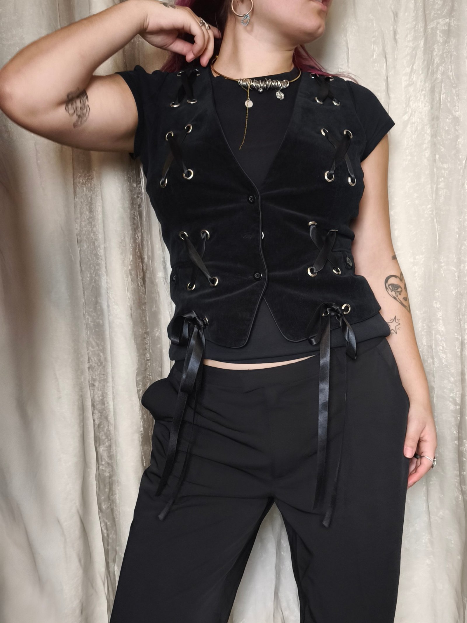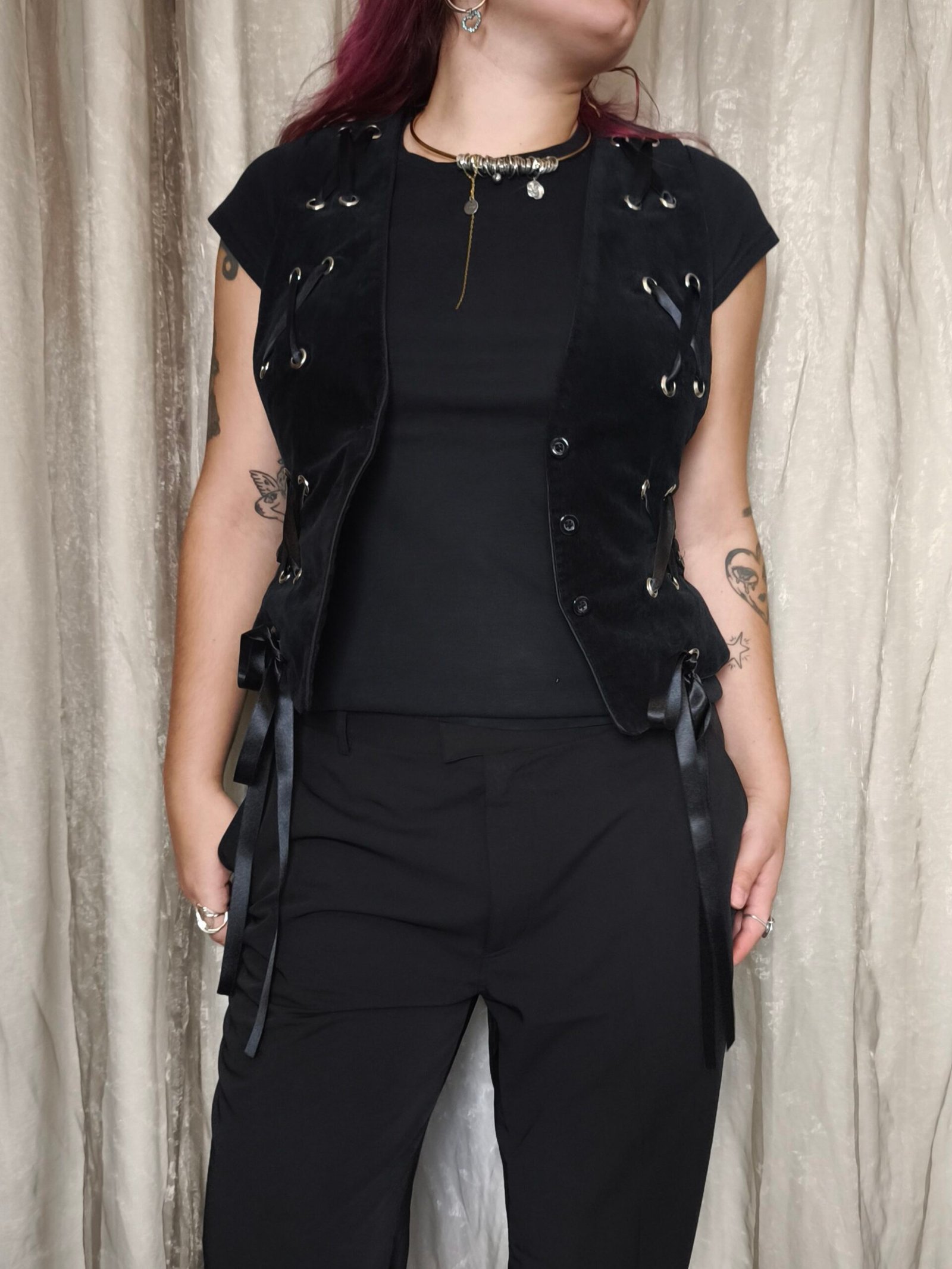 veston en velours noir avec laçage noir sur le devant.